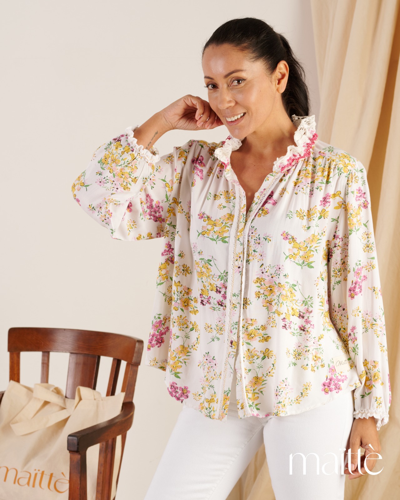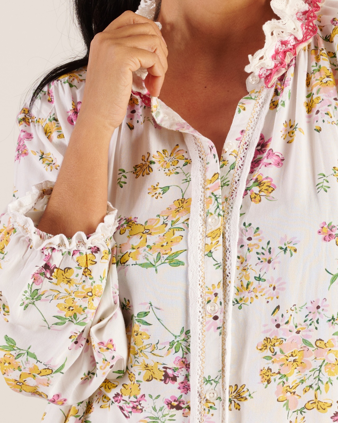 Modelo oversize. Gola e punhos com pormenores de rendinha.