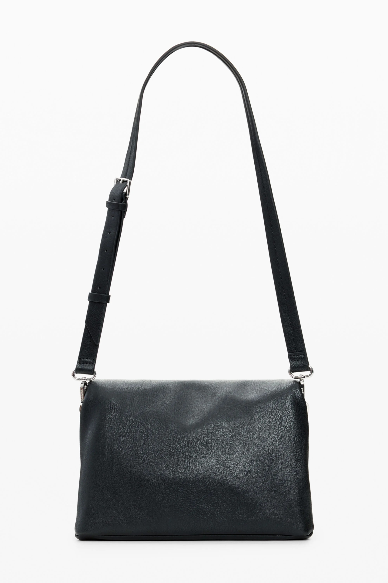 Bolsa preta com efeito de pele com aba, alças intercambiáveis, logo Desigual gravado em relevo no mesmo tom e charms com porta-cartões removível.