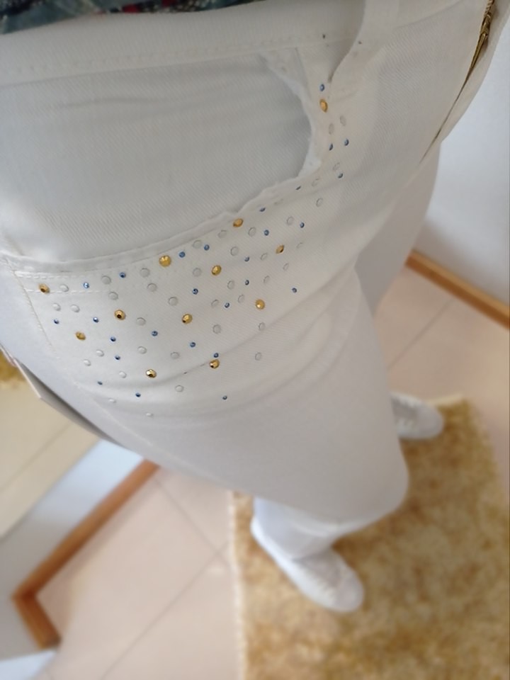 Calças de ganga branca com aplicação de brilhantes em tons de azul e dourado
