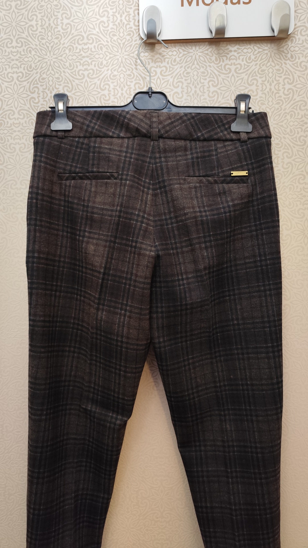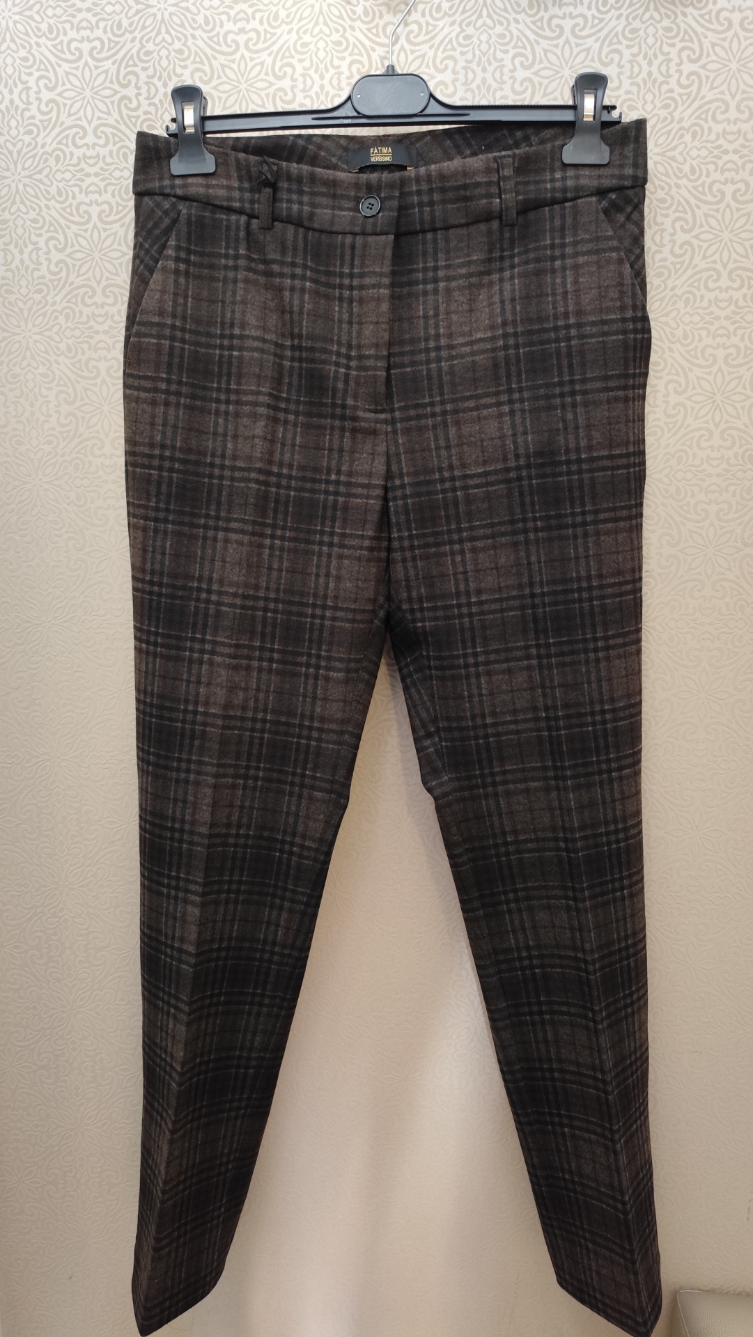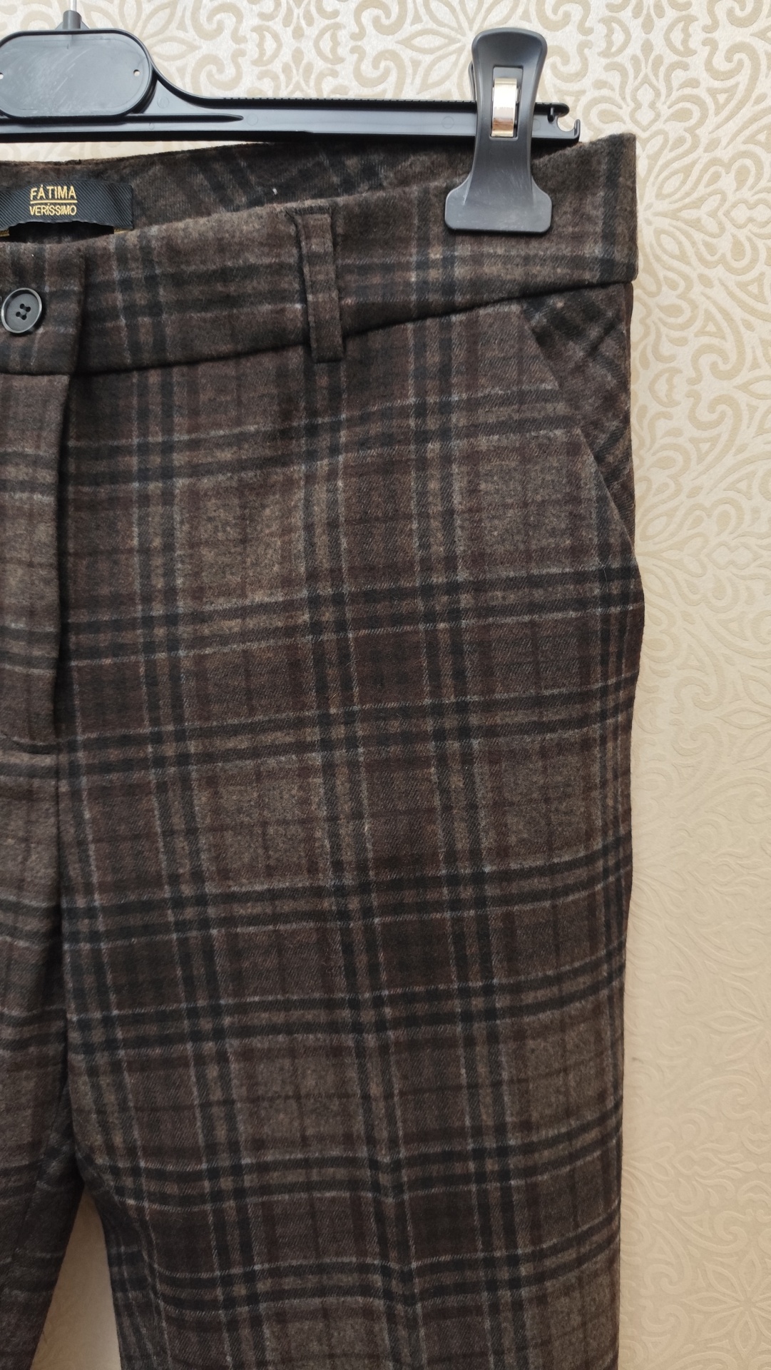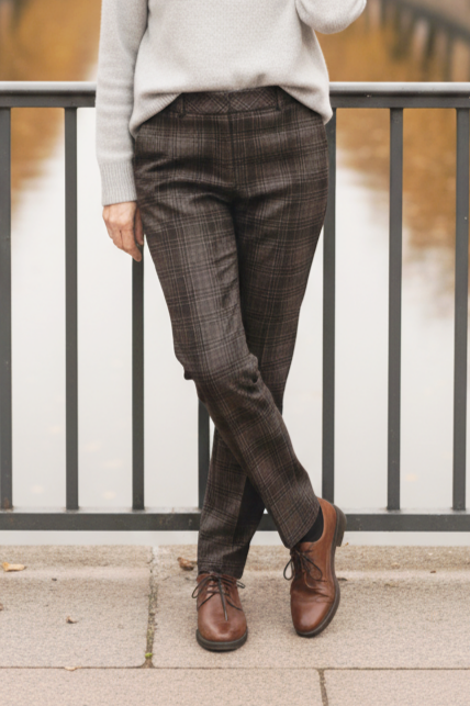 Calças quentinhas de fazenda, axadrezada em tons de castanho.