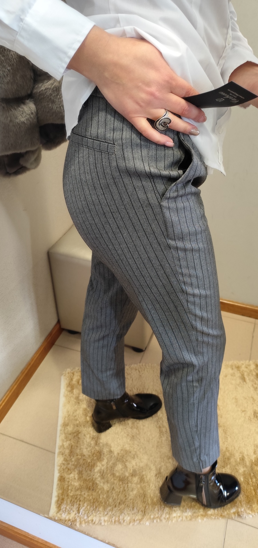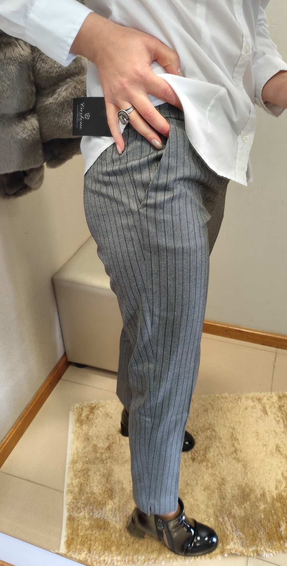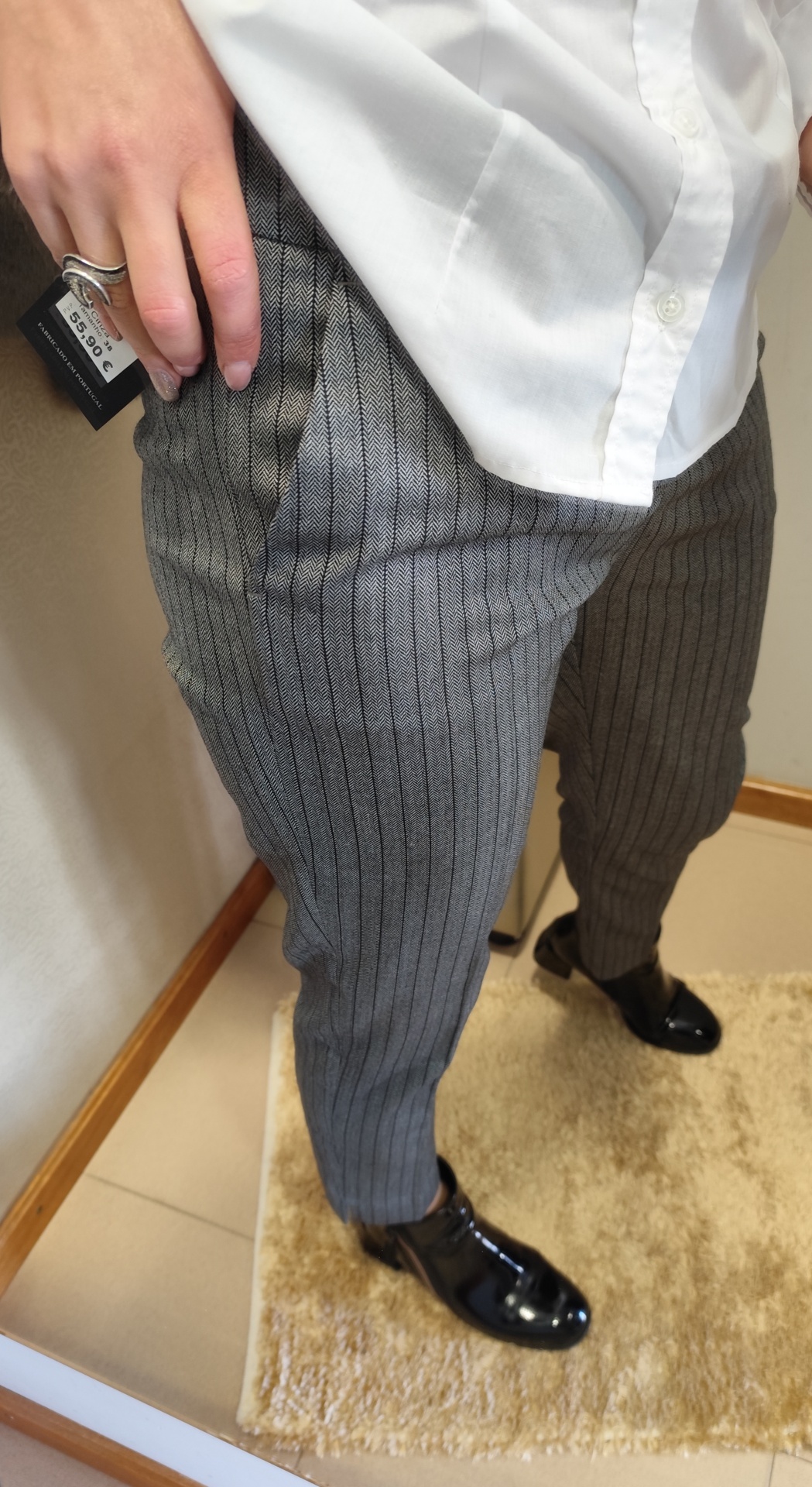 Calças de tecido, em espinha, em tons de cinza c/ risca preta.