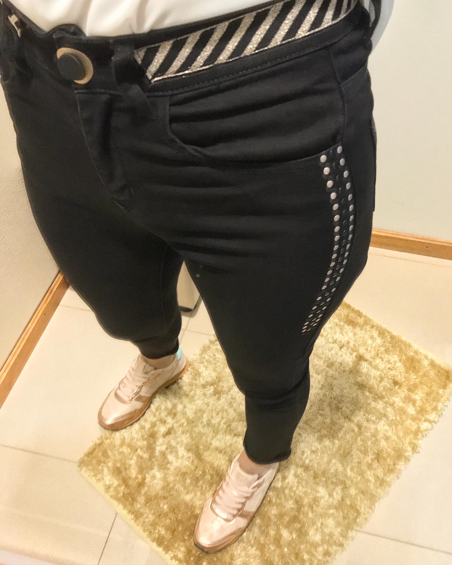 Lista a fios dourados e pretos, tachas na vertical sobre a coxa