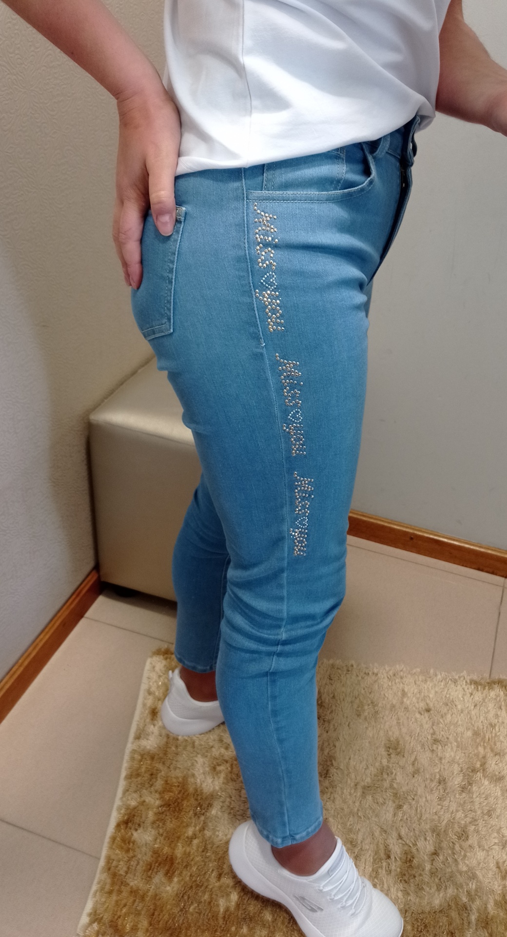 Calças de ganga clara de cintura subida.