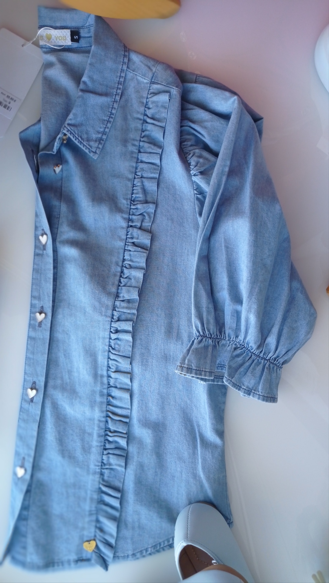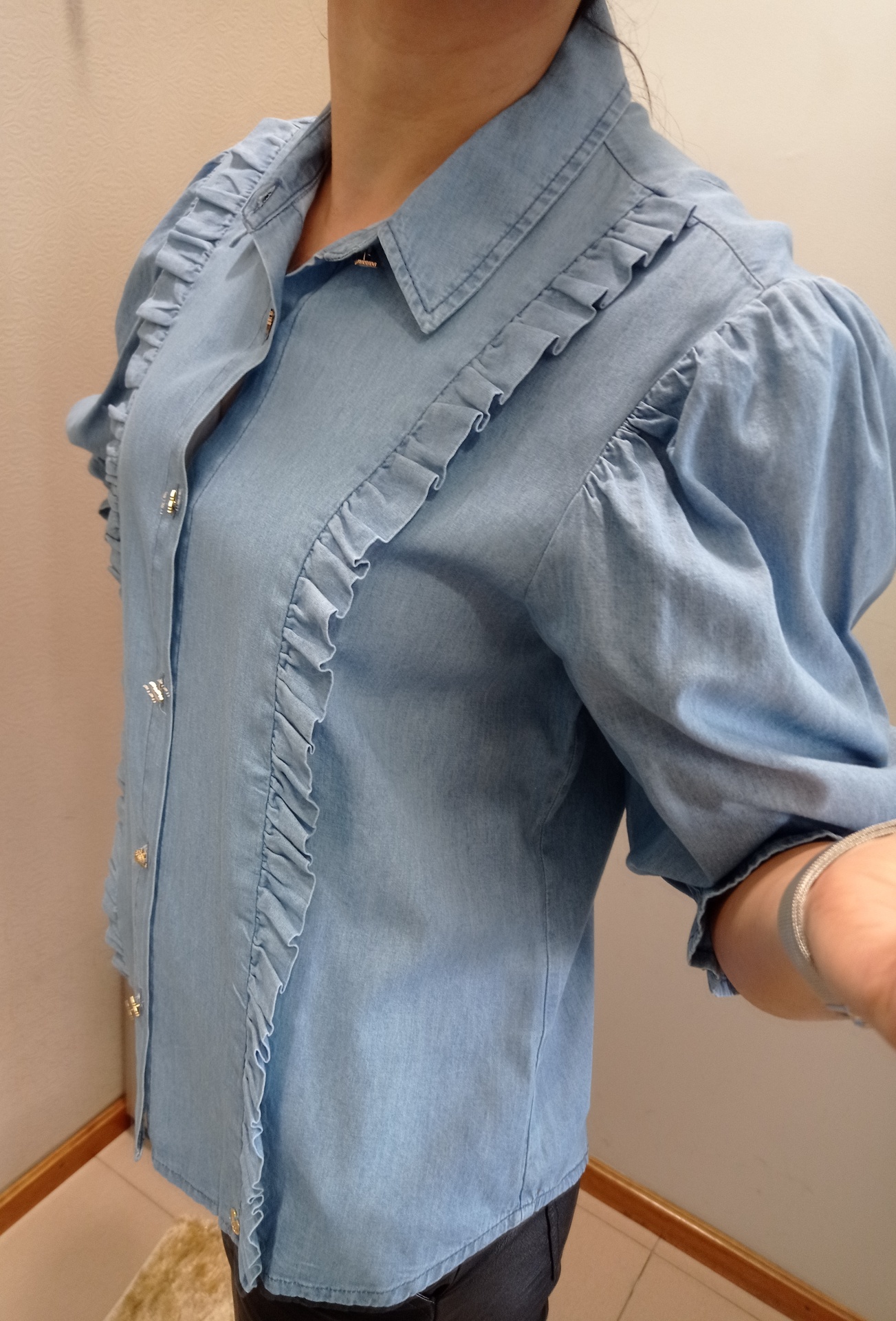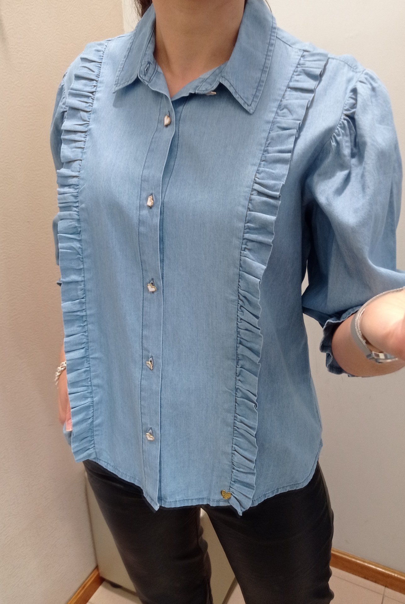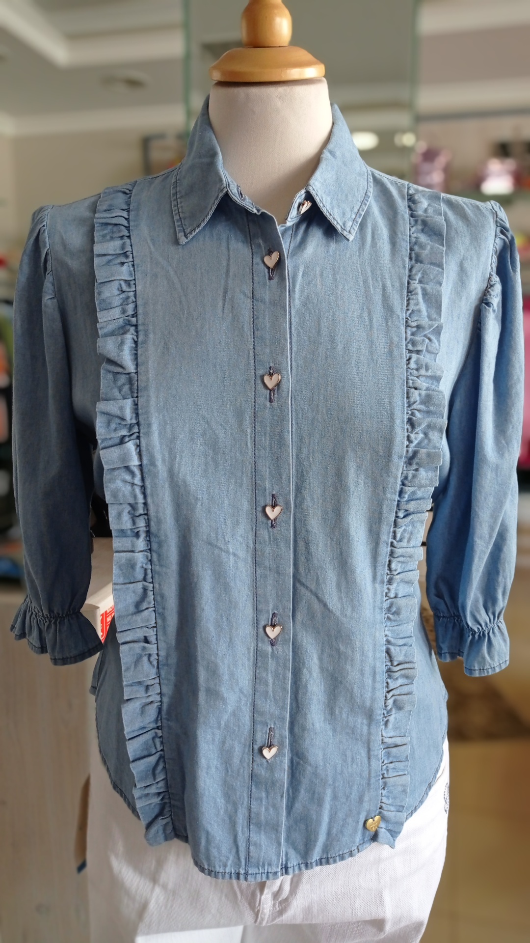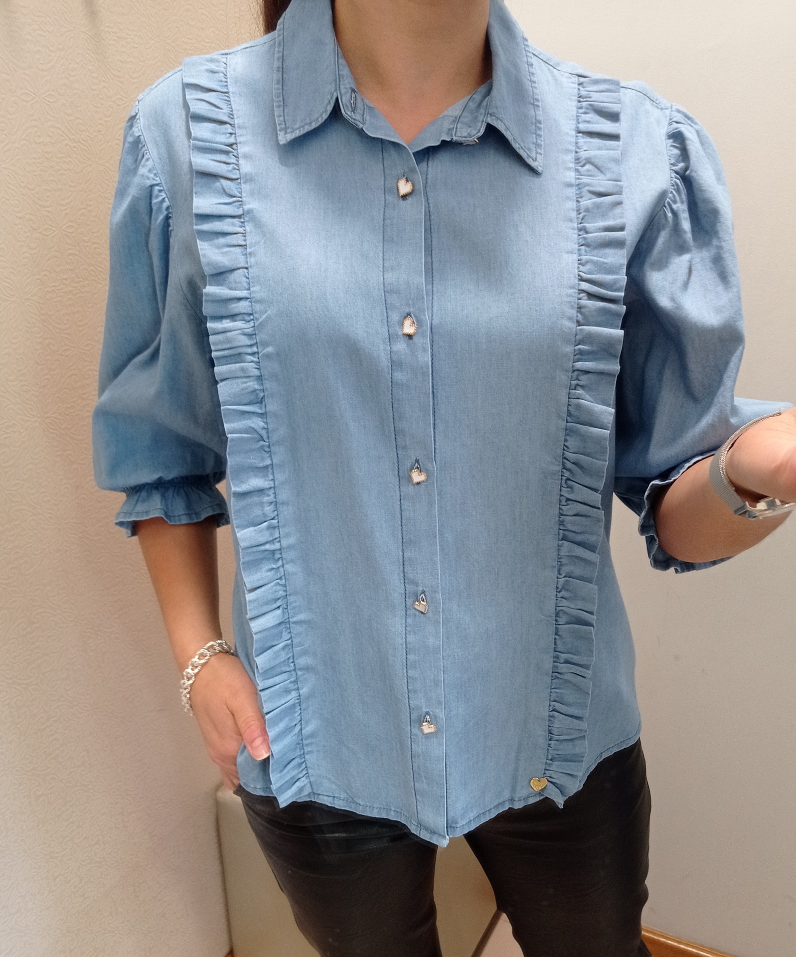 Camisa de ganga fina com detalhes de folhos laterais.