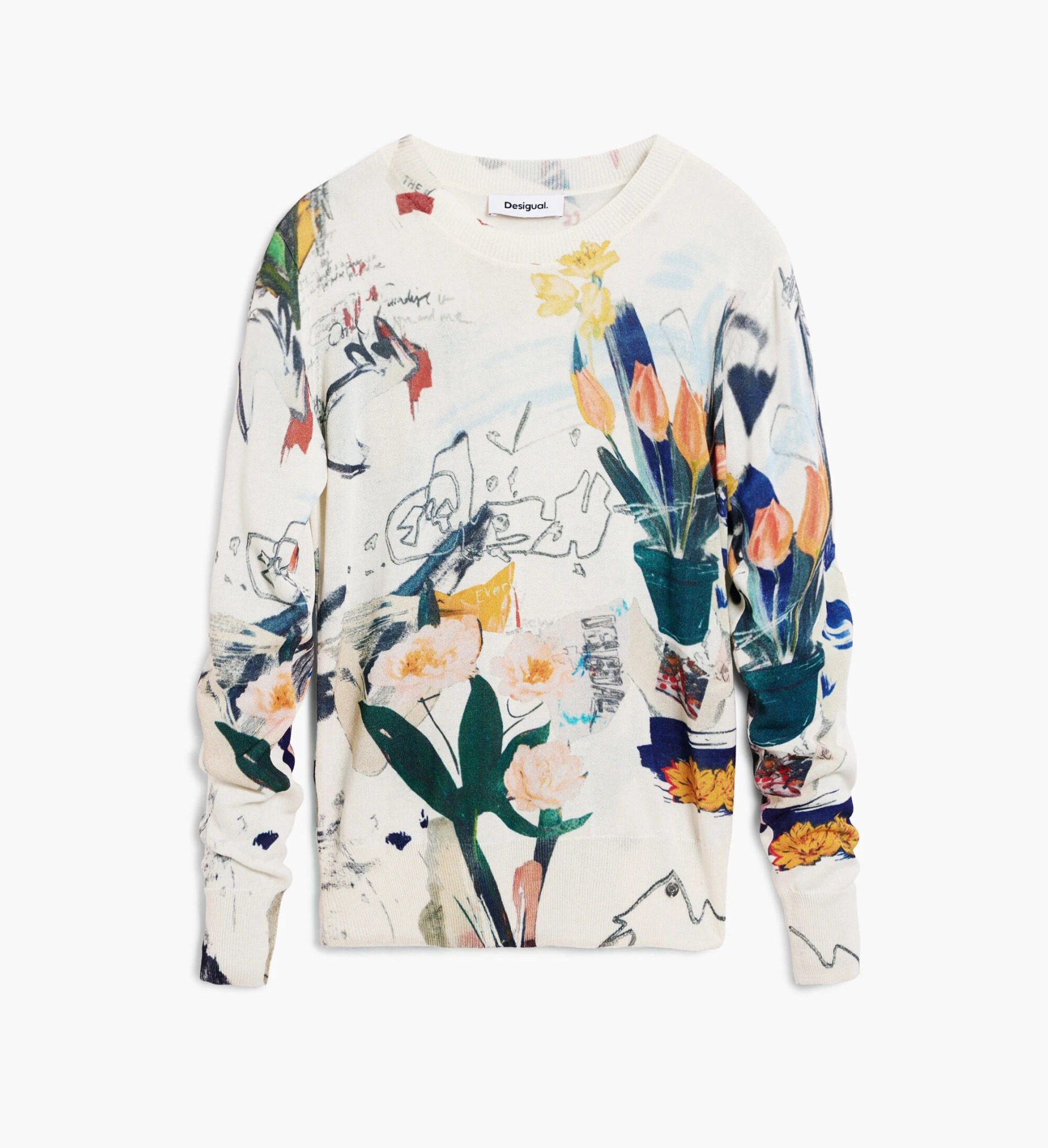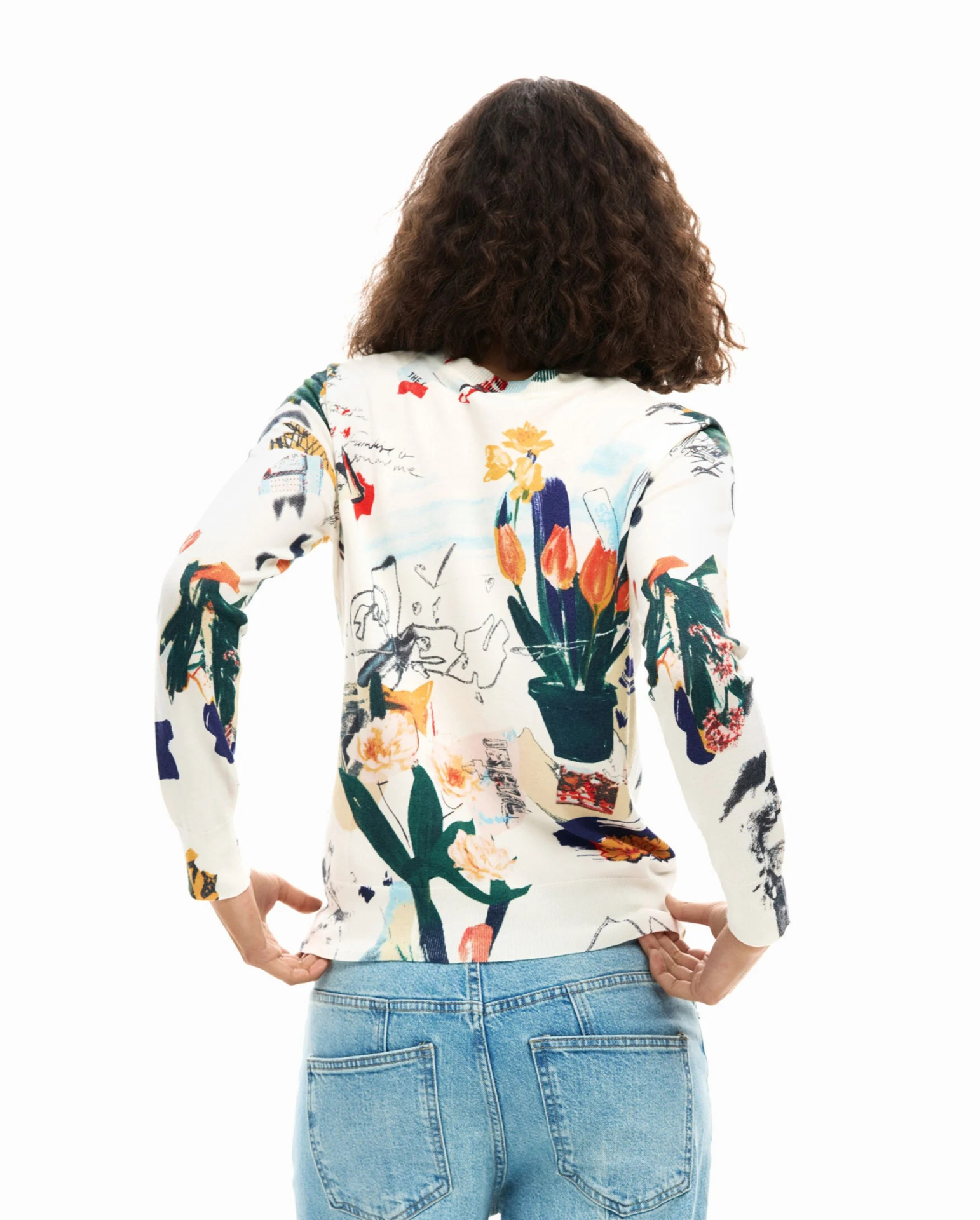 Camisola em malha fina, com estampa em estilo colagem e detalhes canelados nas mangas e punhos.