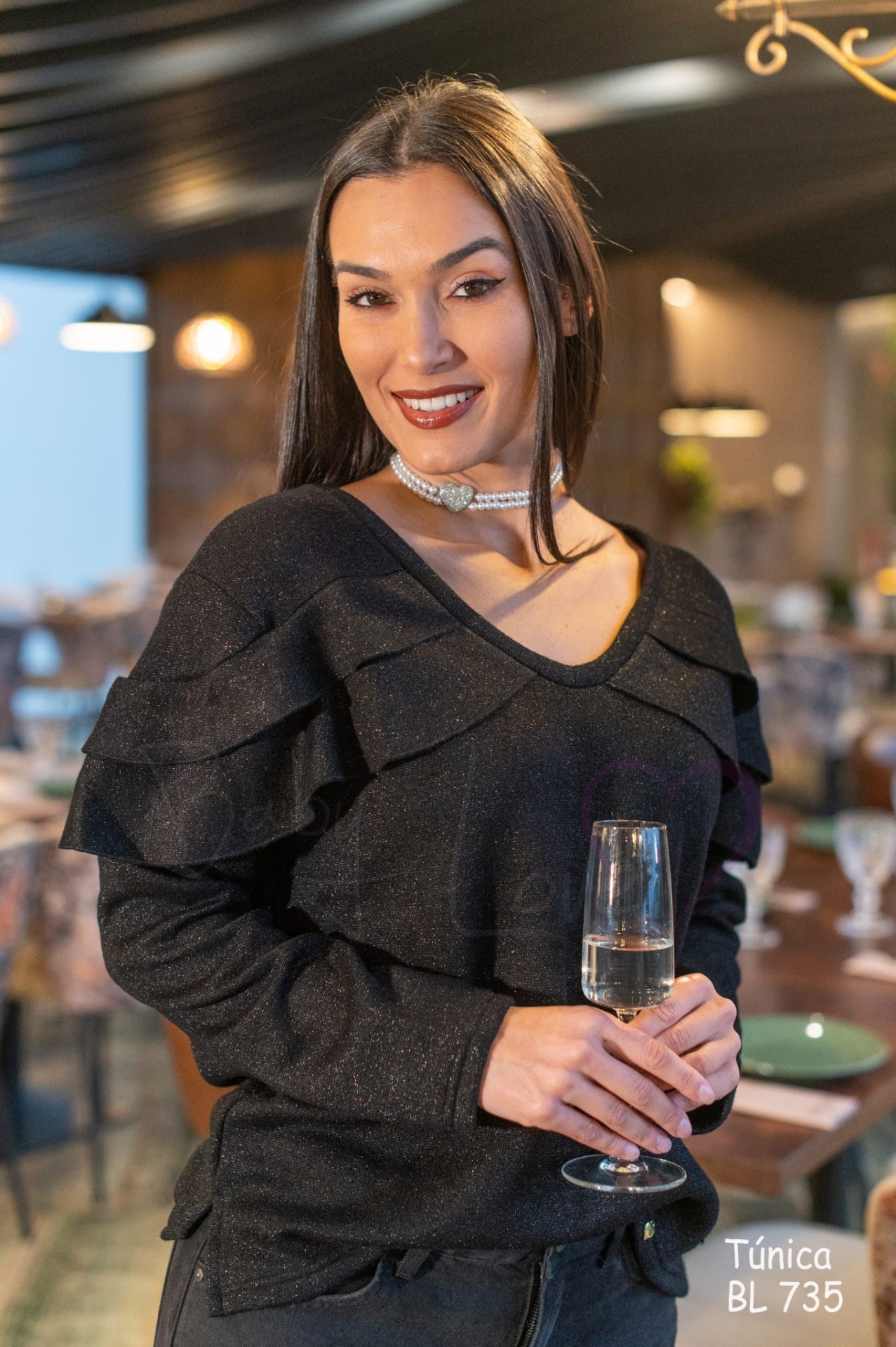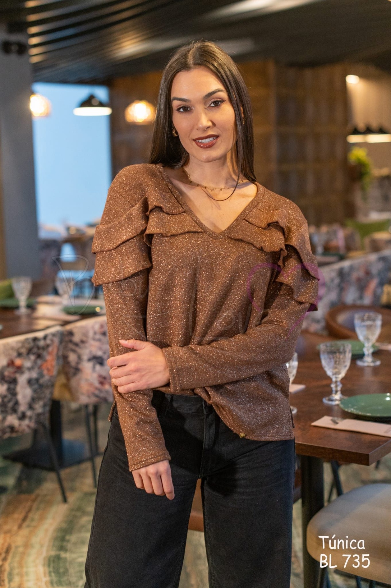 Decote em V e folhos sobrepostos.
