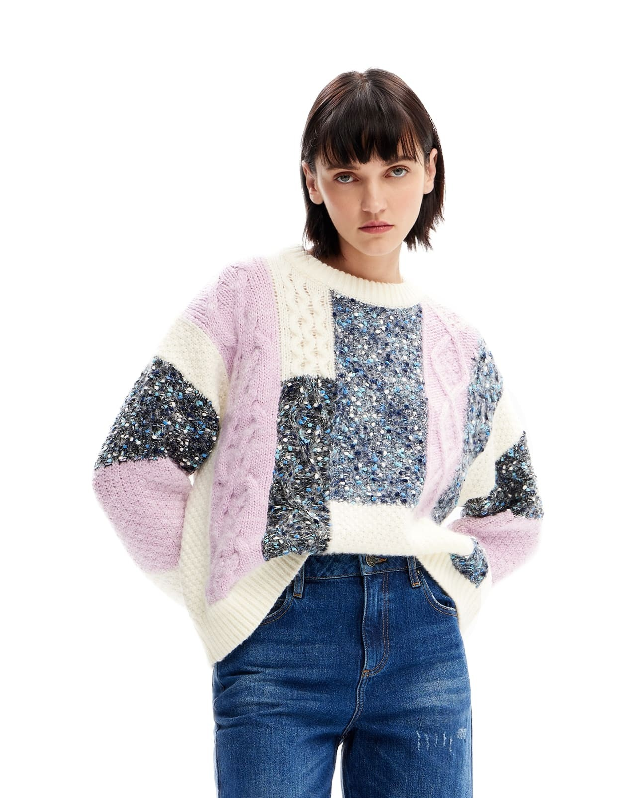 Camisola de malha feminina colorida em retalhos com jeans