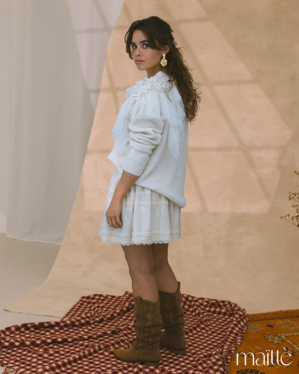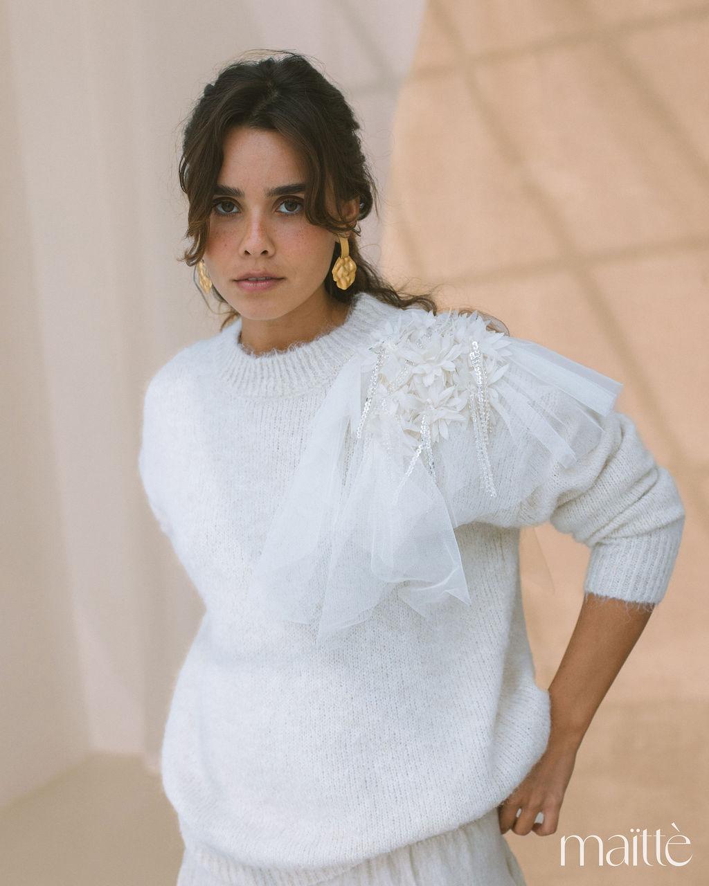 Camisola cru com detalhes no ombro.