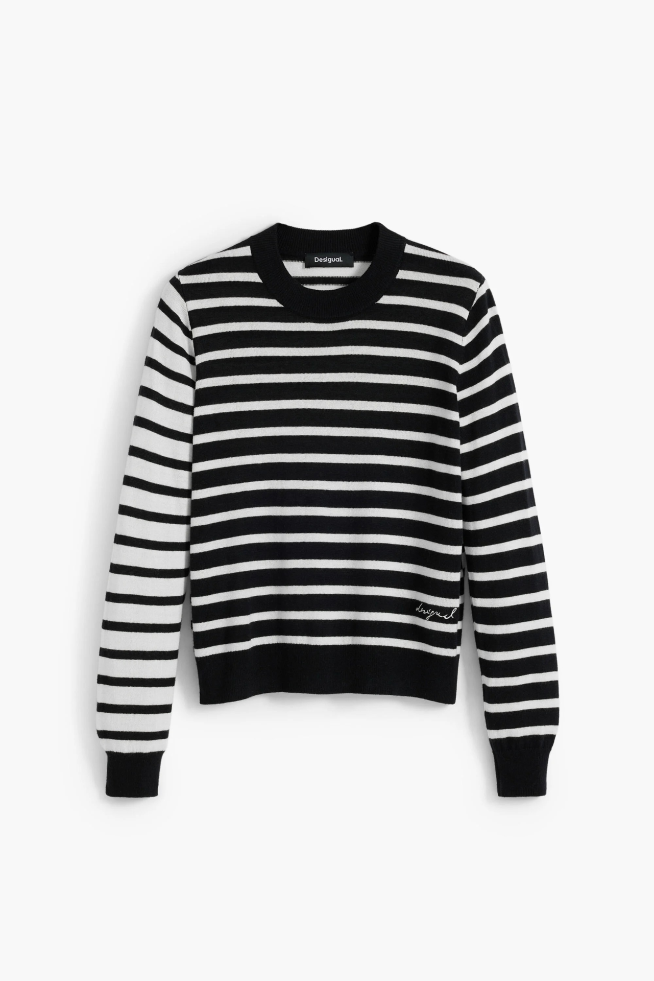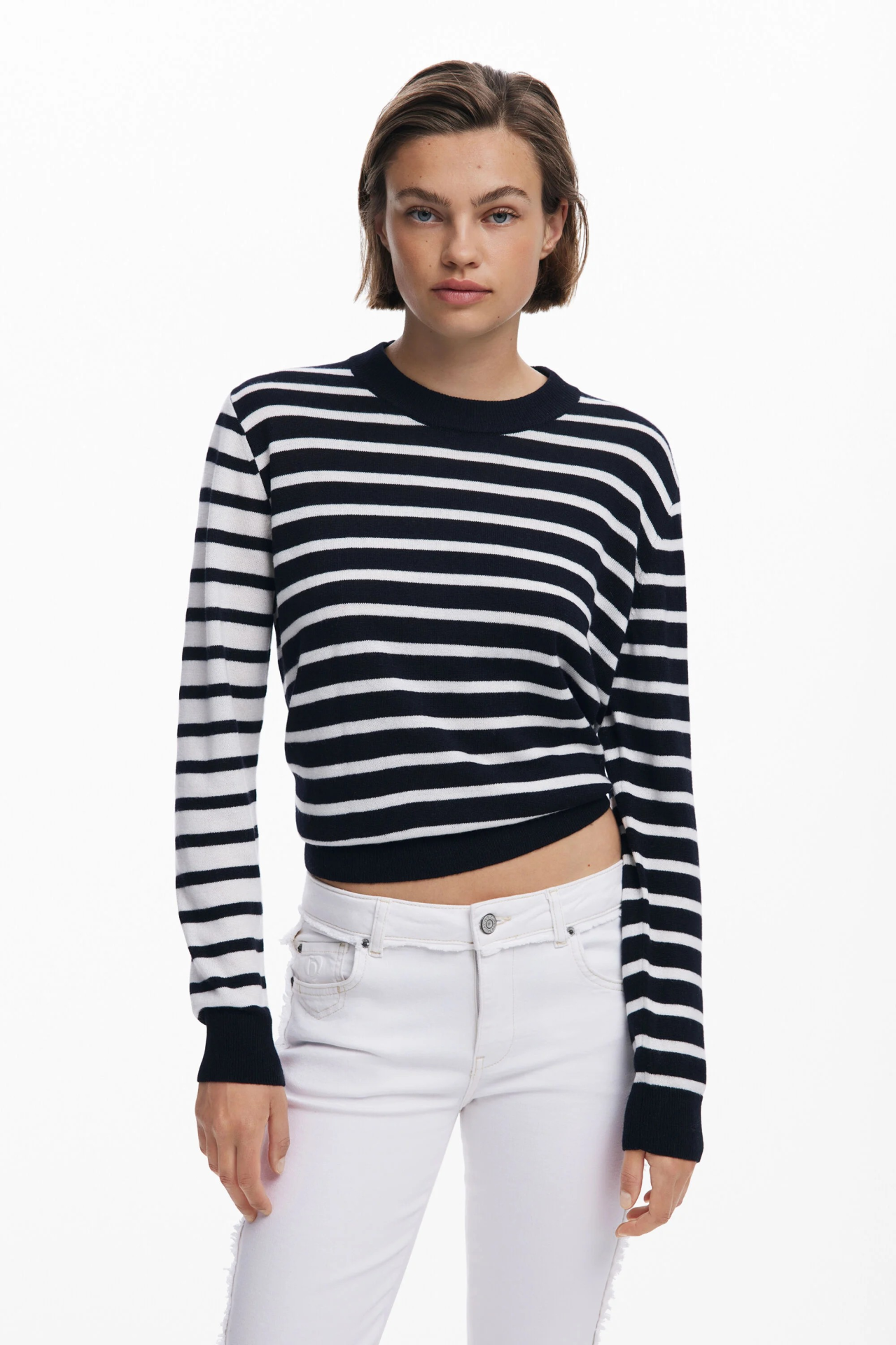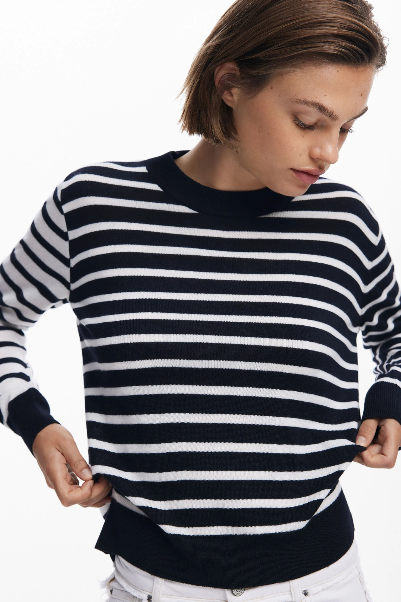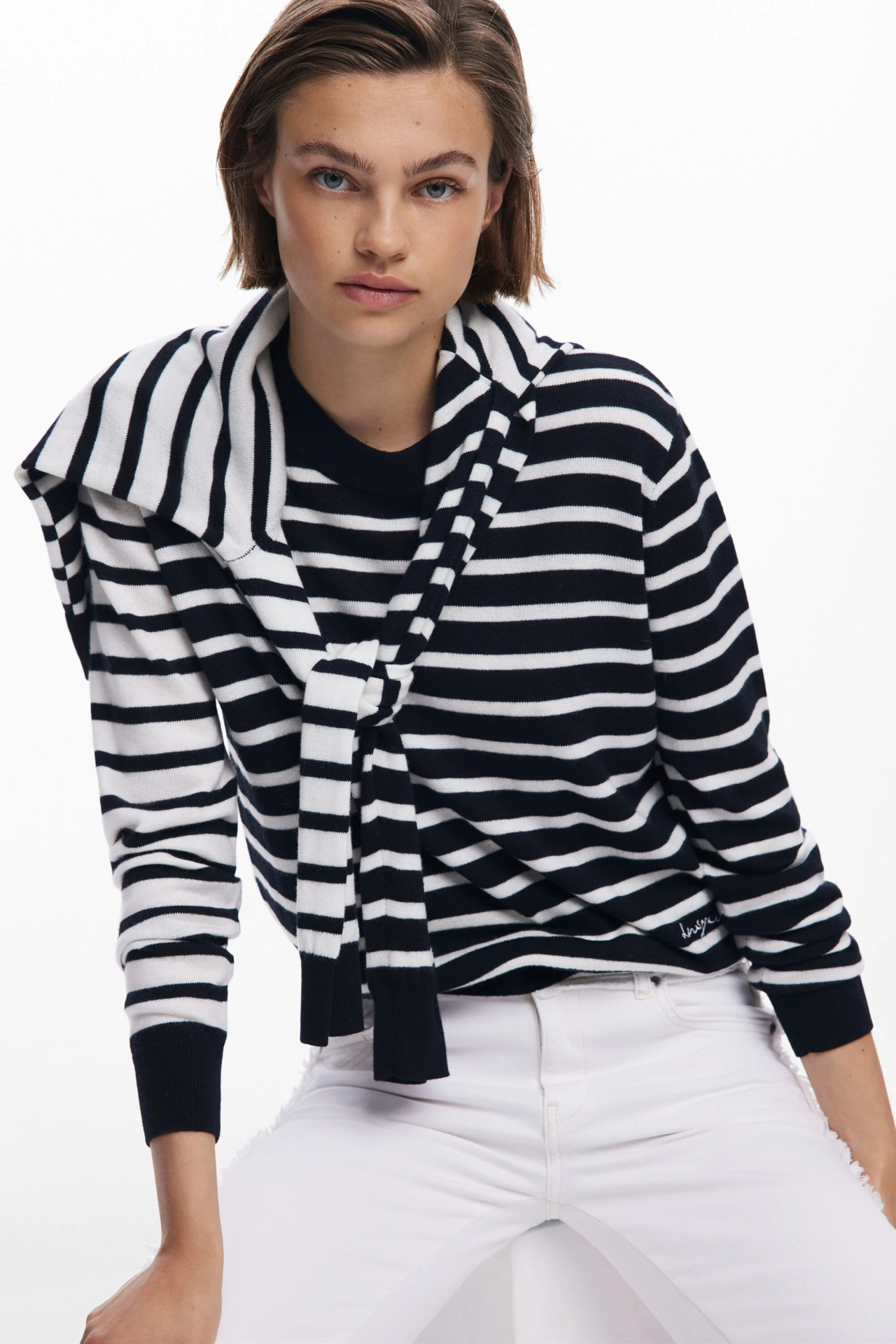 Camisola de malha, às riscas.