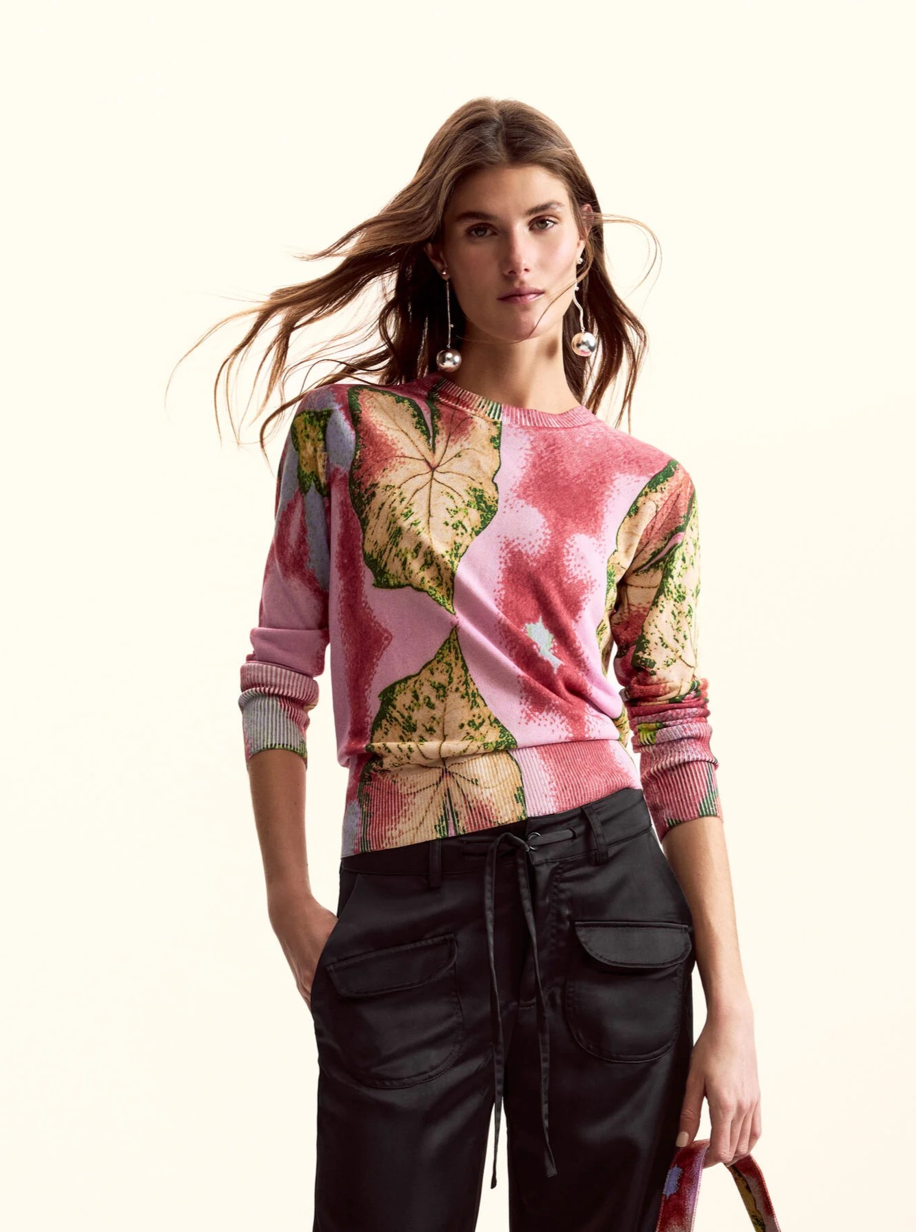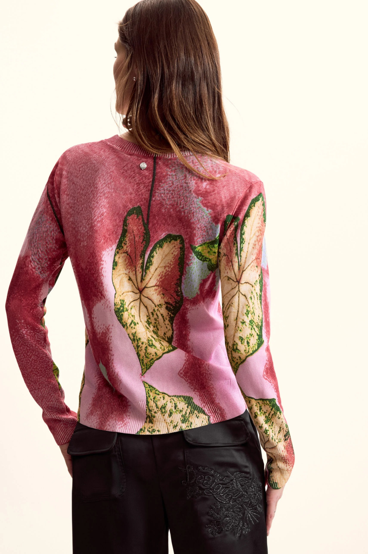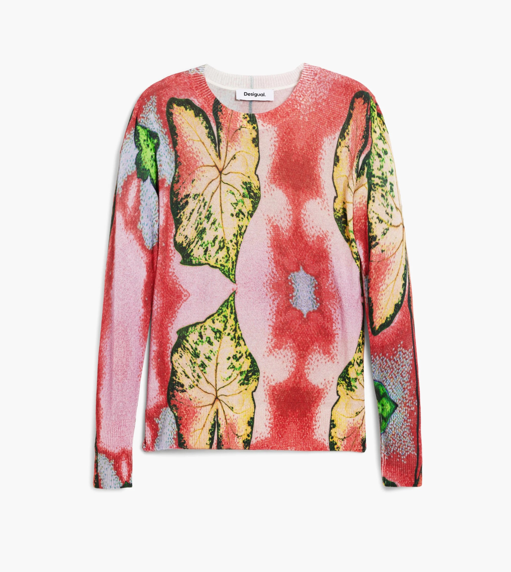 Malha plana fina Estampado abstrato em tons de rosa e verde Gola redonda Manga comprida Desenhado por: Monsieur Christian Lacroix