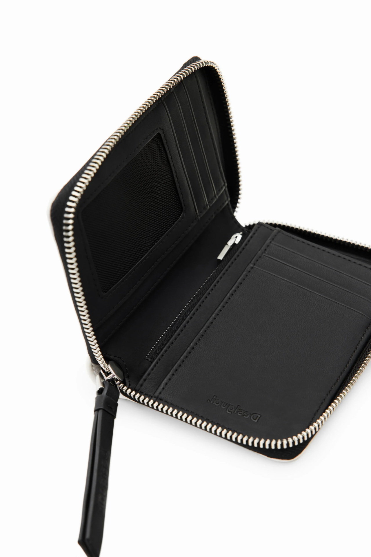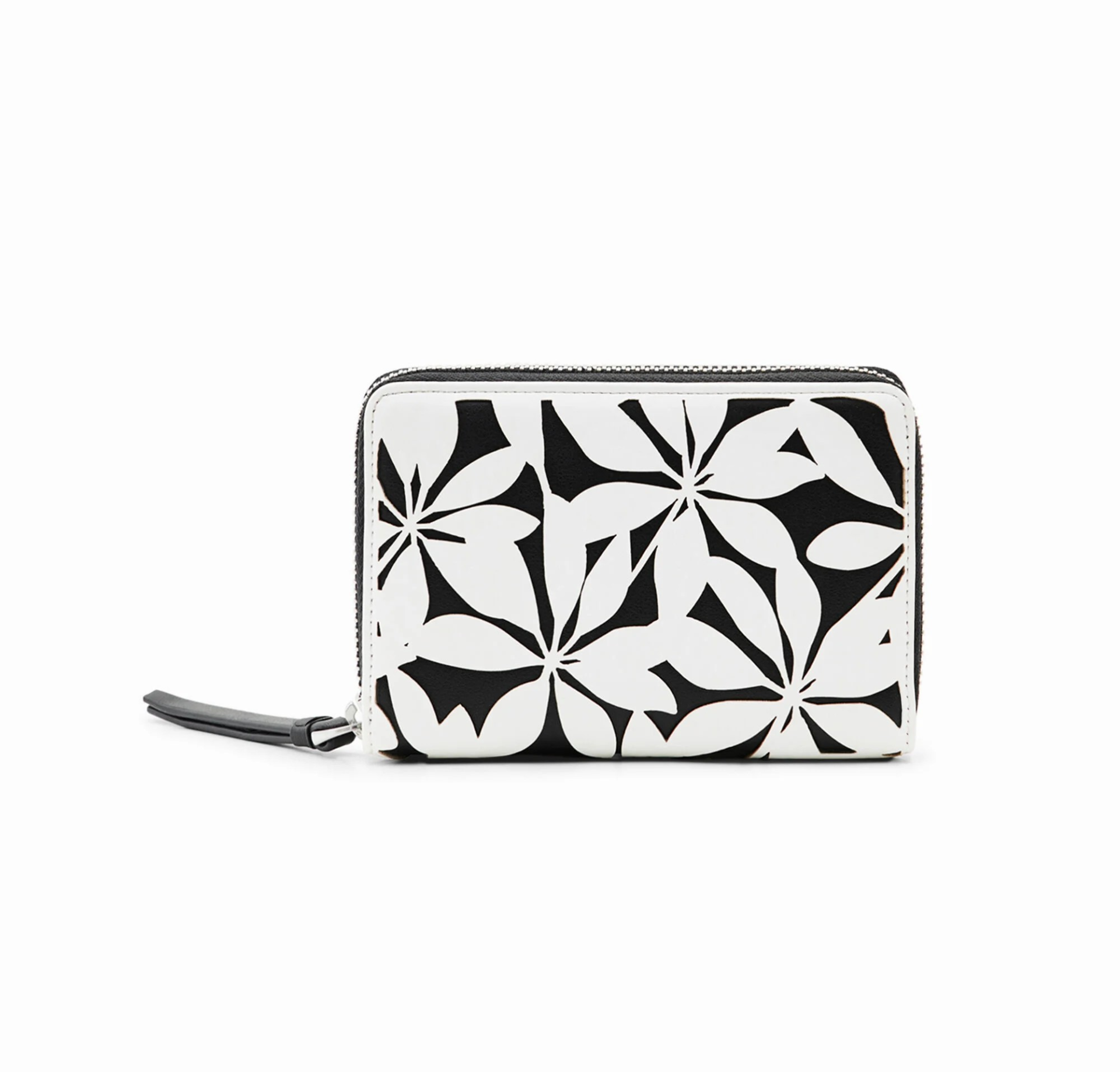 Carteira pequena preta e branca com padrão de folhas e fecho de correr