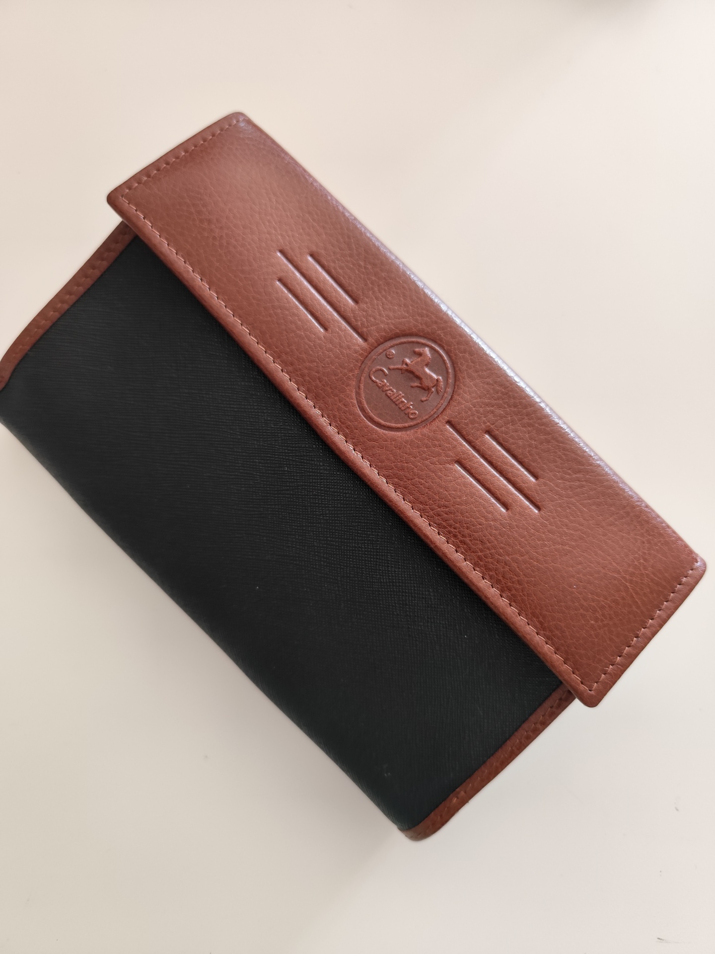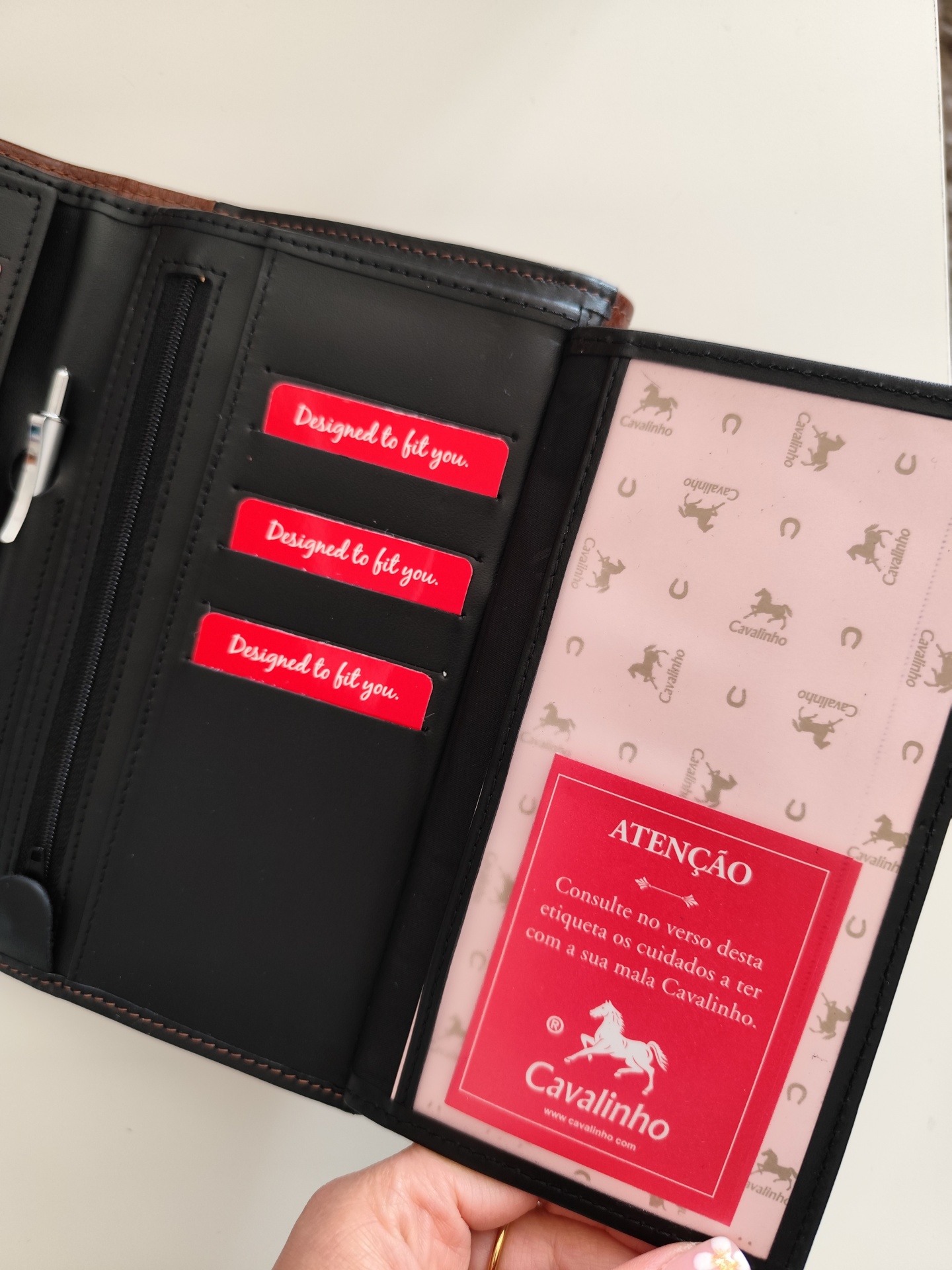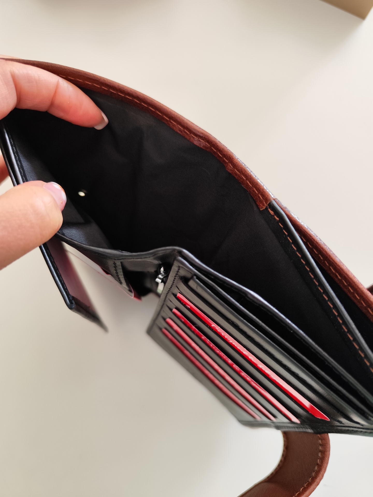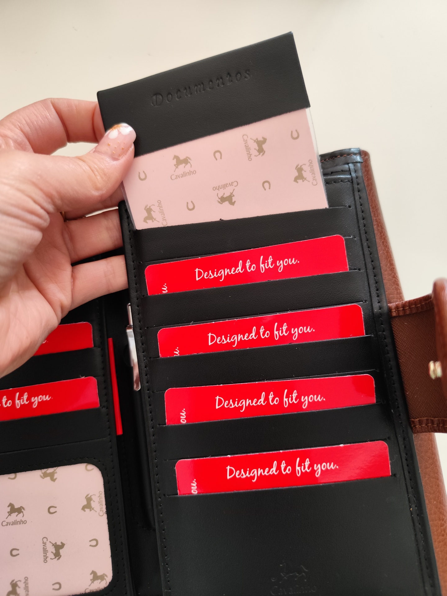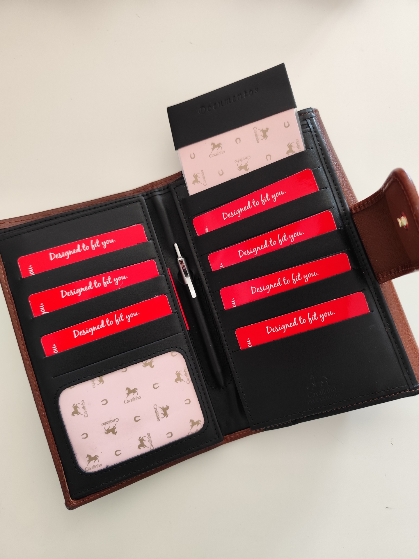 Carteira em pele com várias divisórias.