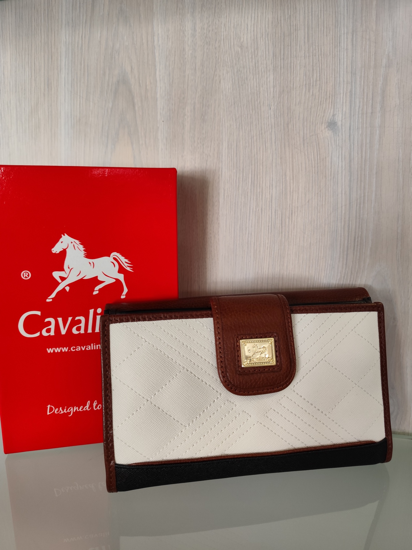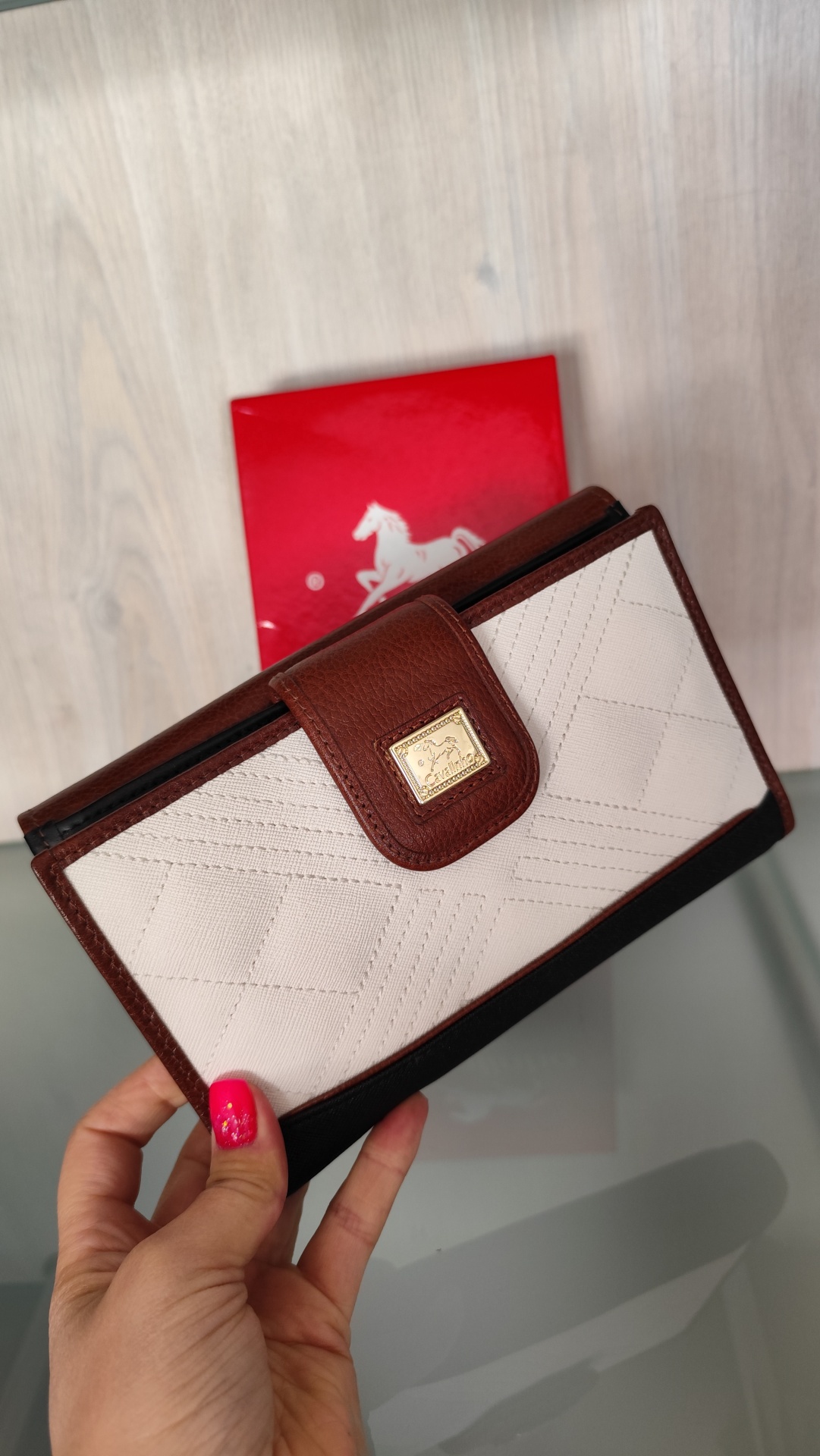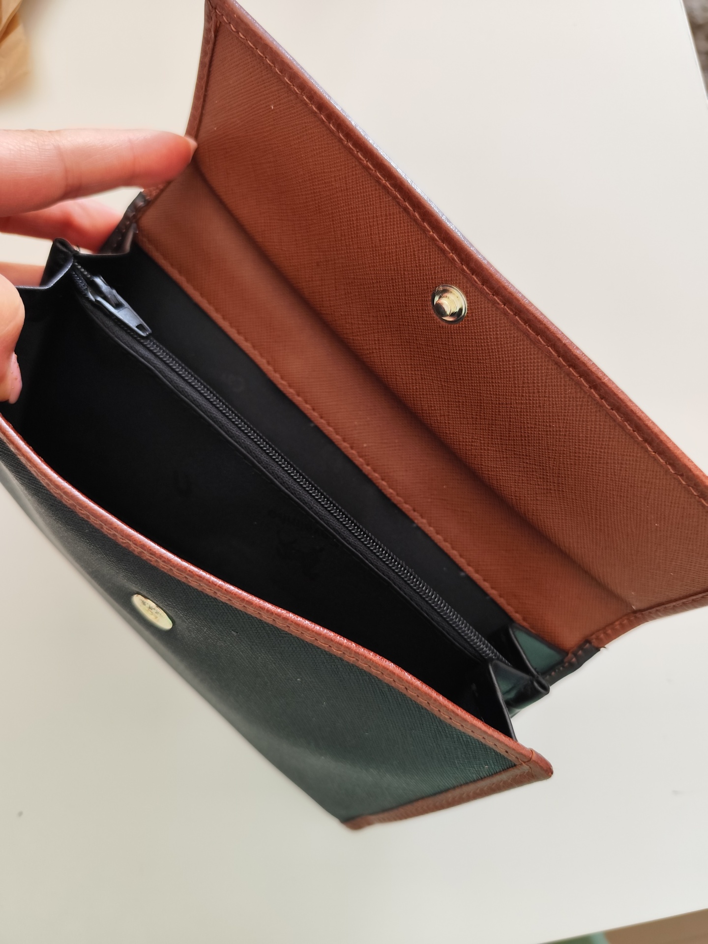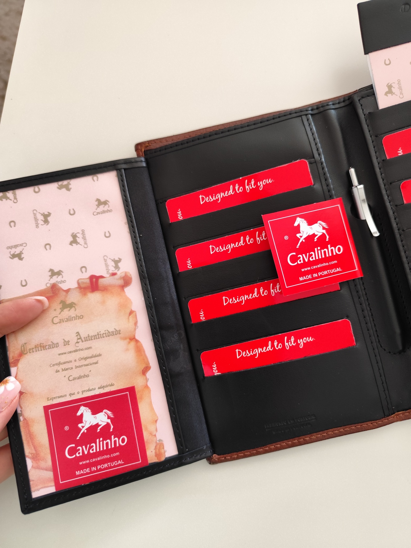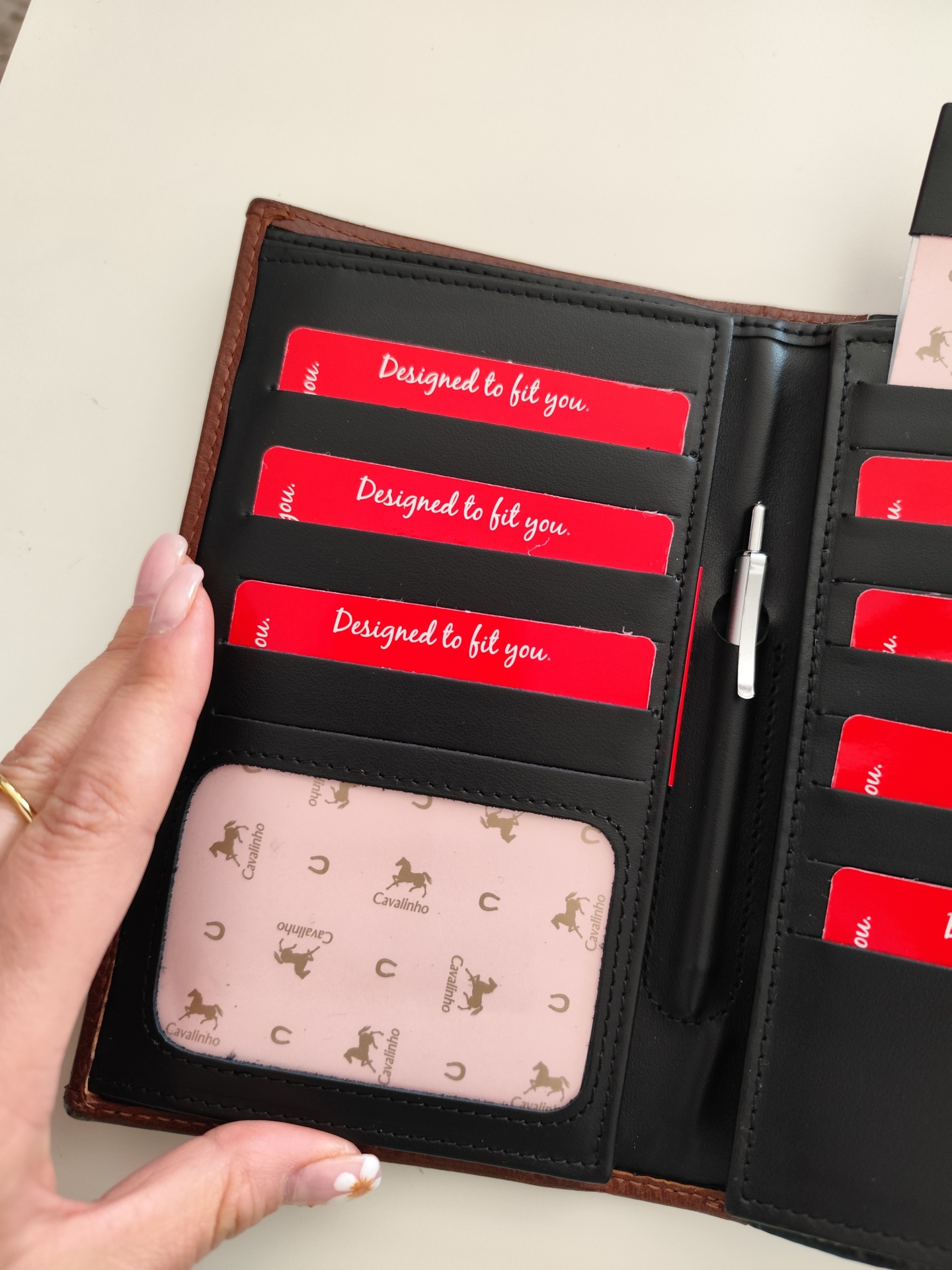 Carteira em pele com várias divisórias.