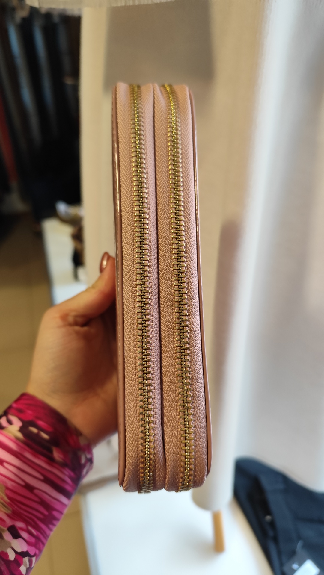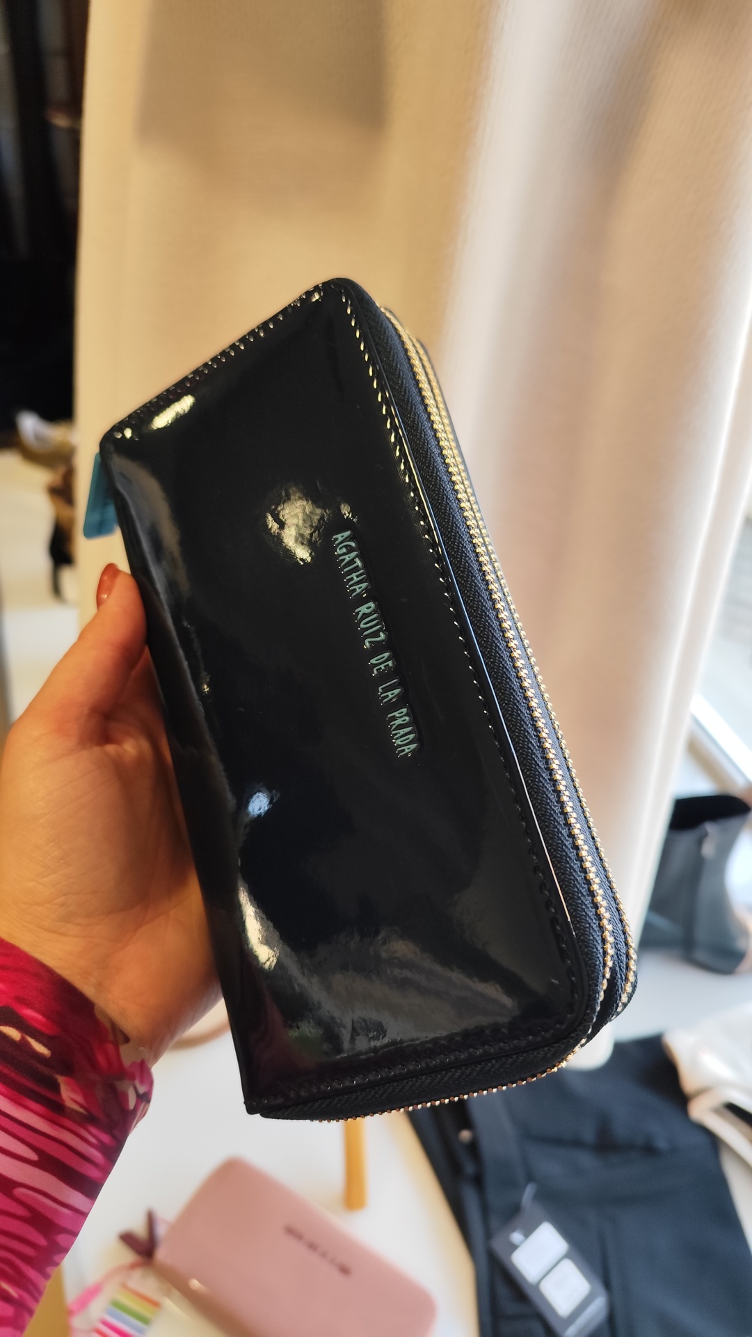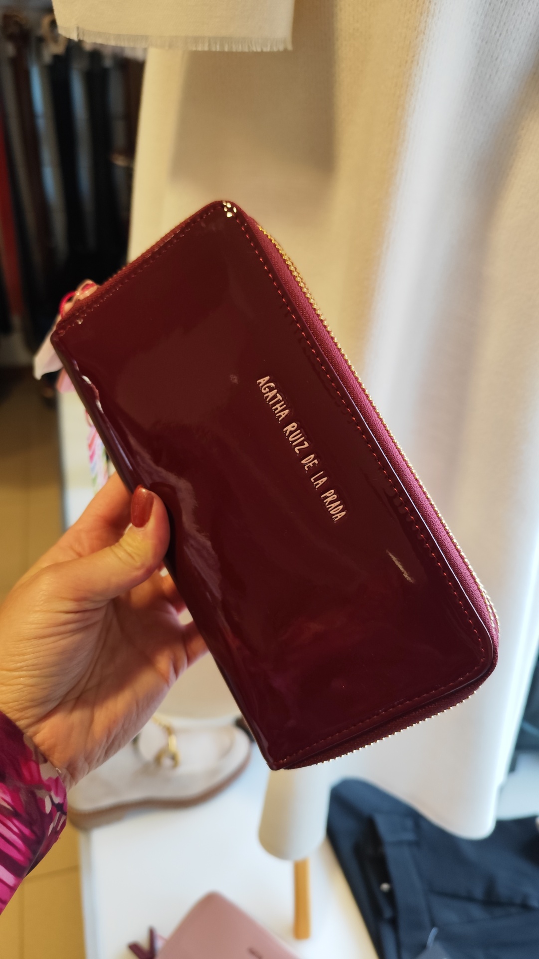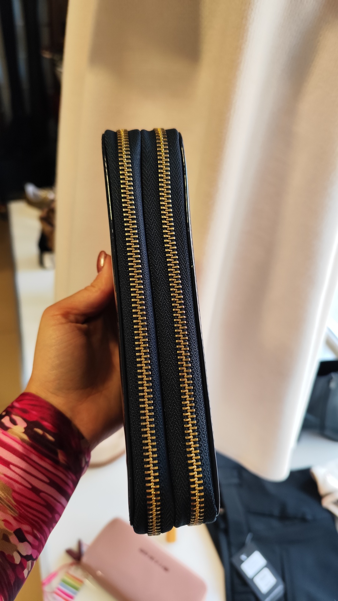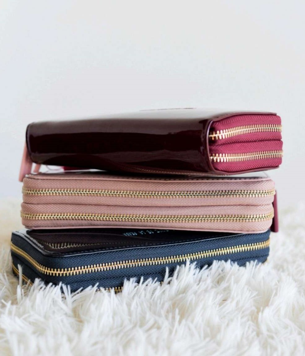 Esta carteira distingue-se pelo seu acabamento em verniz liso, que não só adiciona um brilho sofisticado, proporciona uma durabilidade e facilidade de limpeza. 2 fechos de correr tamanho grande.