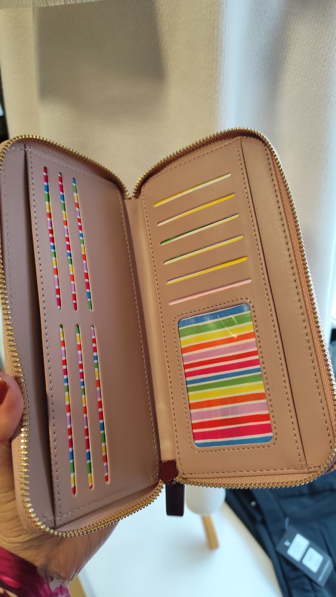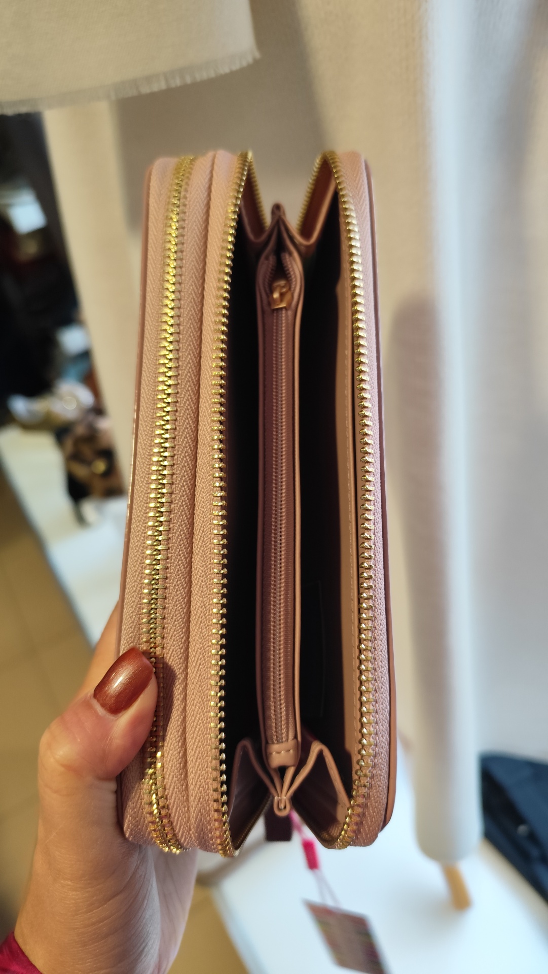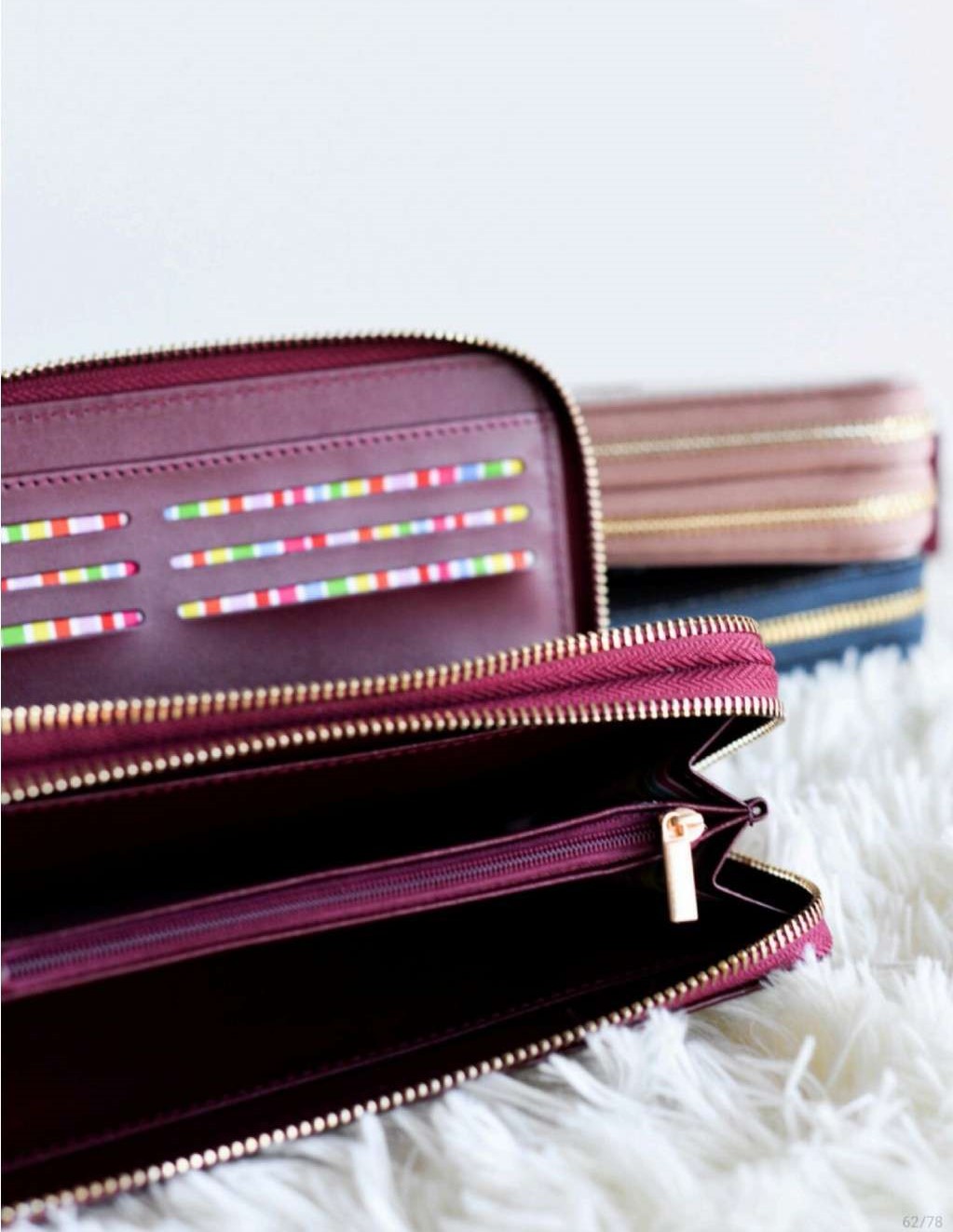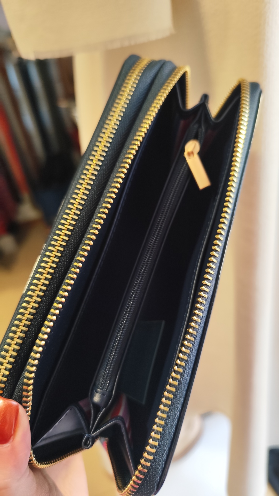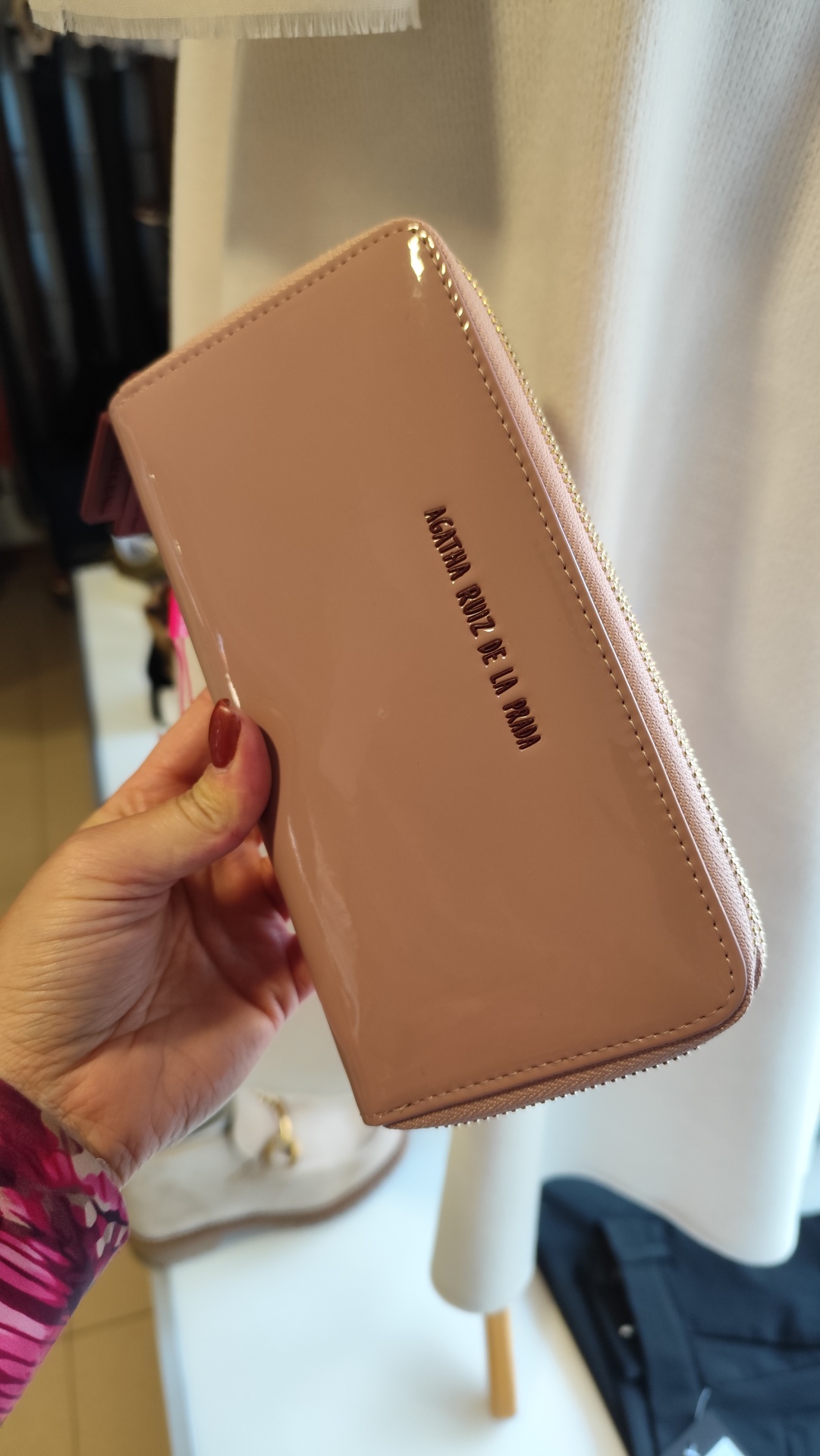 Esta carteira distingue-se pelo seu acabamento em verniz liso, que não só adiciona um brilho sofisticado, proporciona uma durabilidade e facilidade de limpeza. 2 fechos de correr tamanho grande.