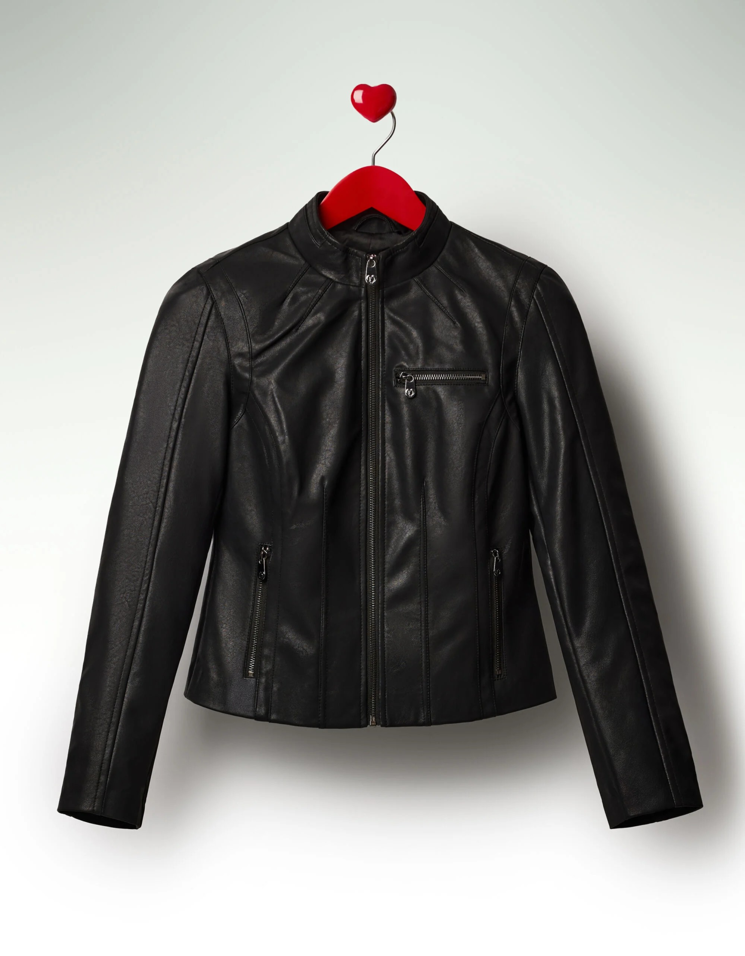 Casaco efeito pele, ajustado ao corpo, com gola mao, fecho de zíper e bolsos frontais.