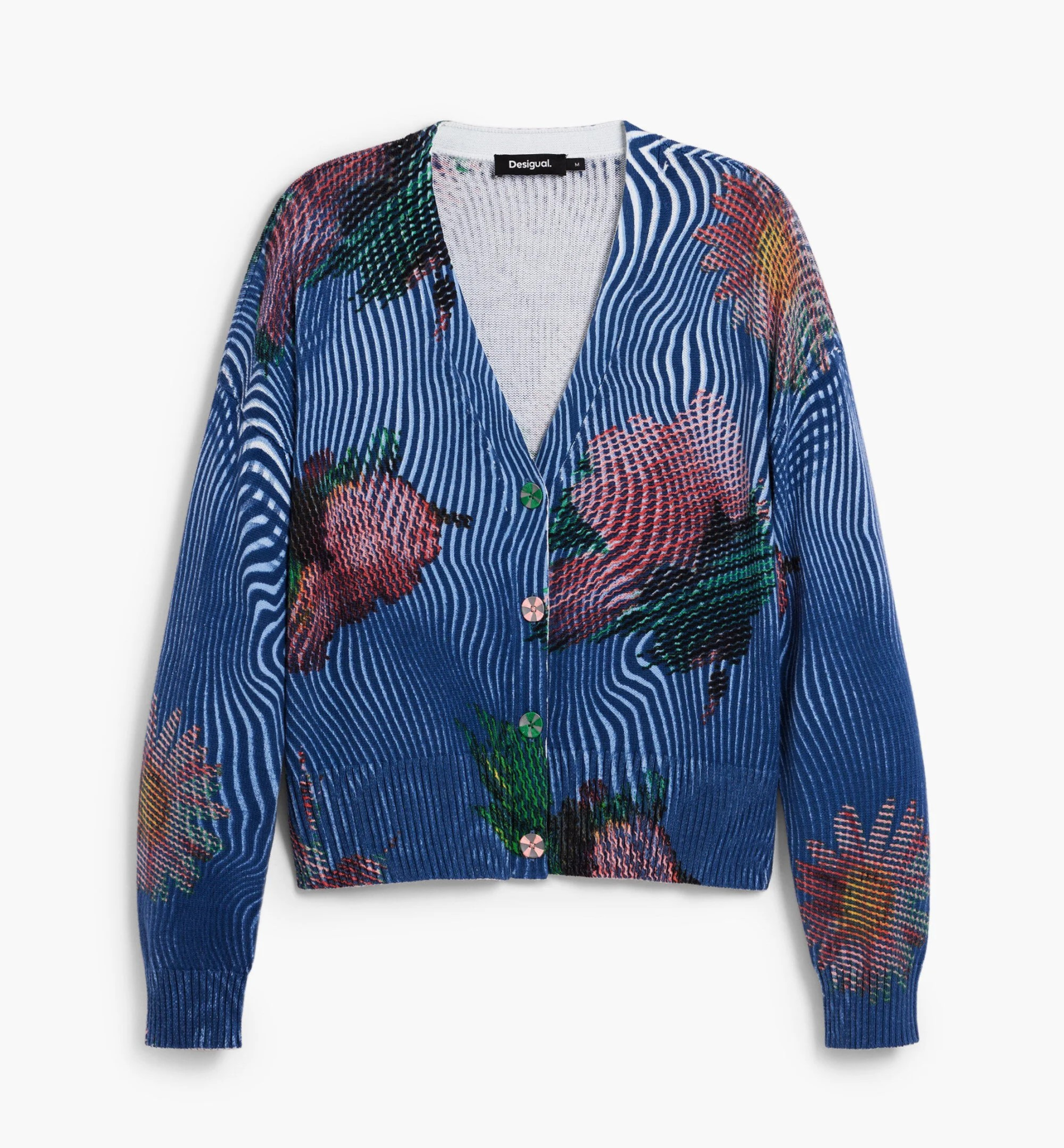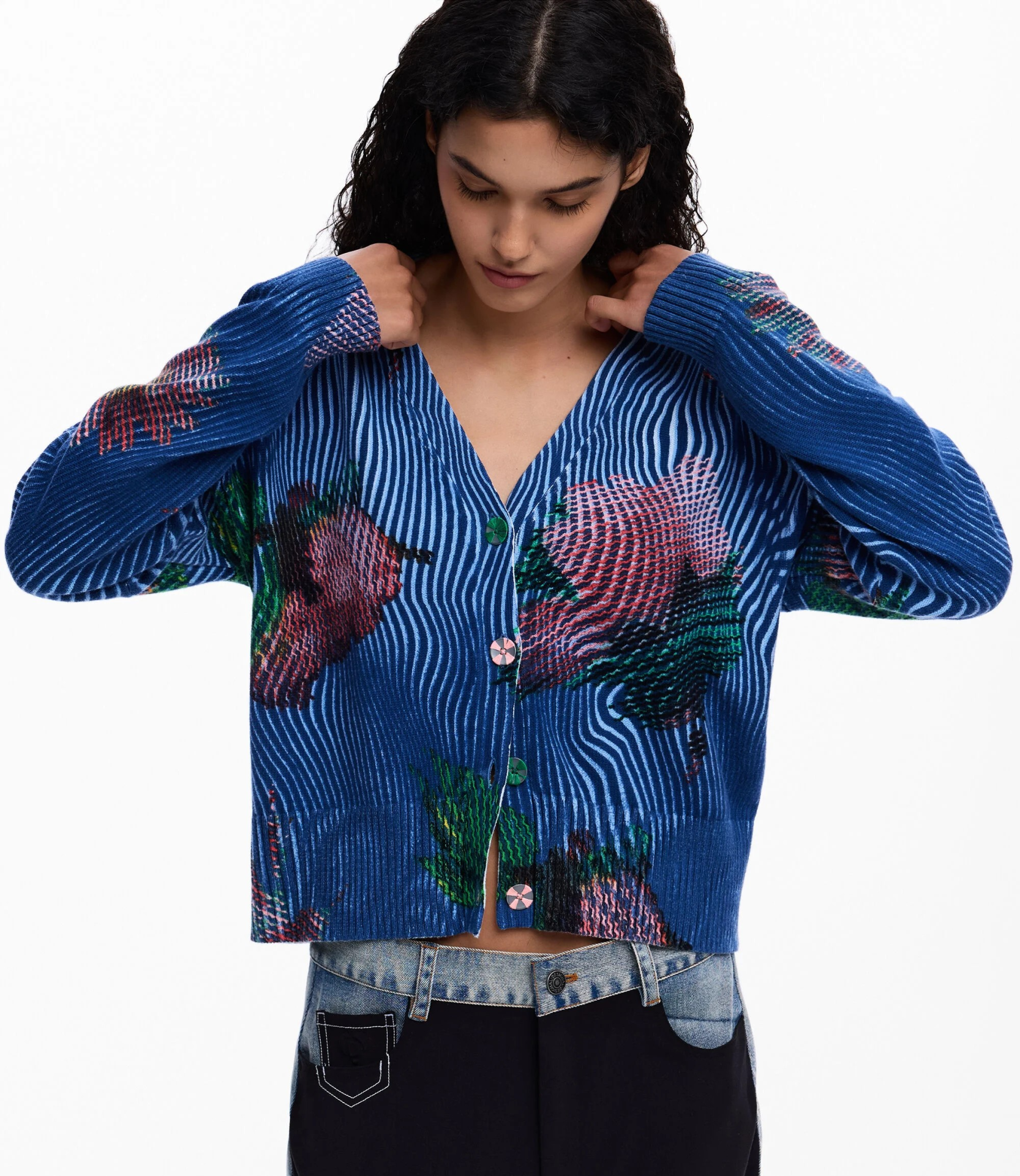 Casaco confeccionado em malha leve com estampa de flores em estilo pixelado.