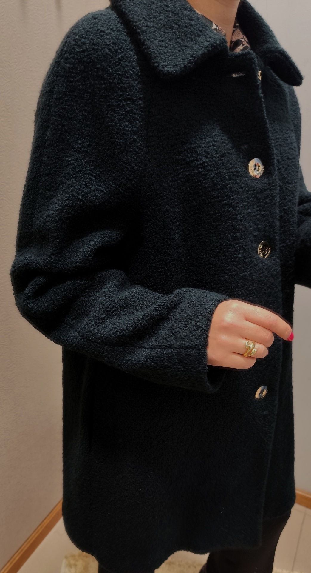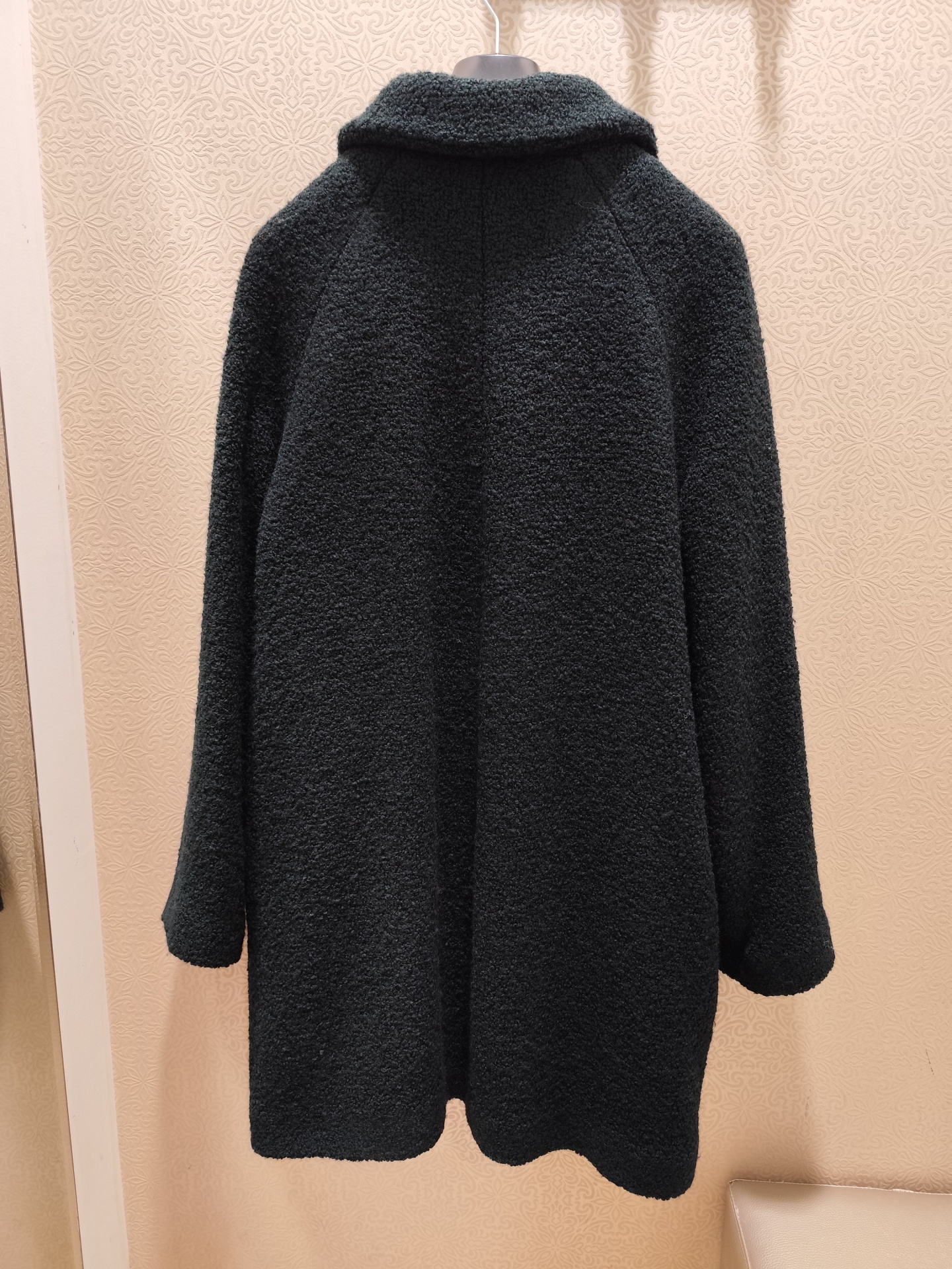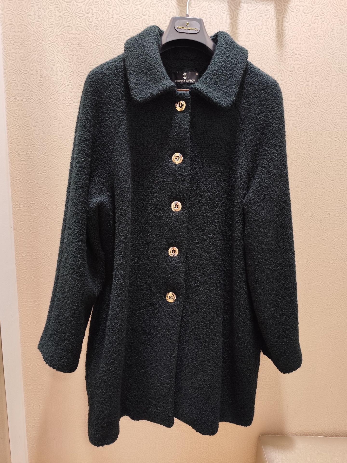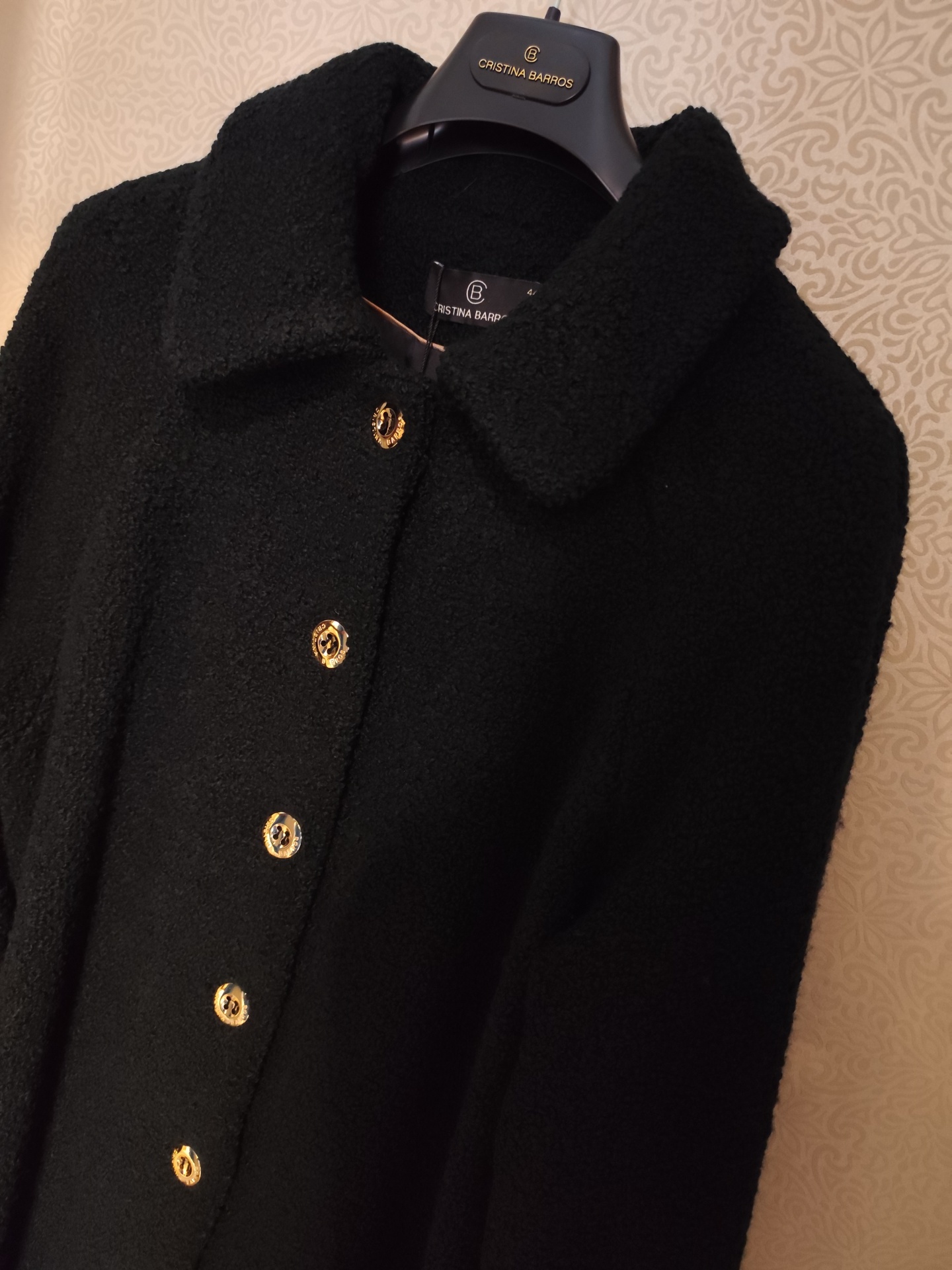 Casaco preto a 3/4, de caracolinho.