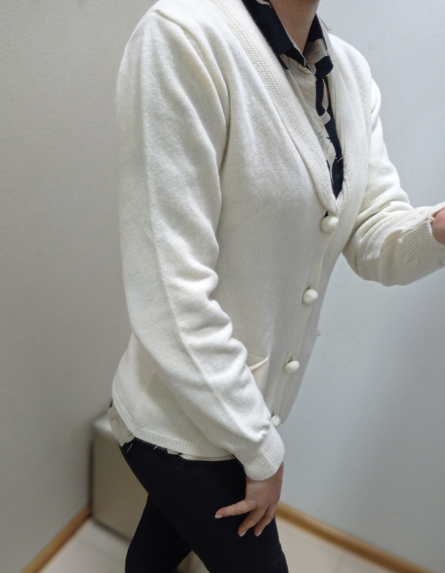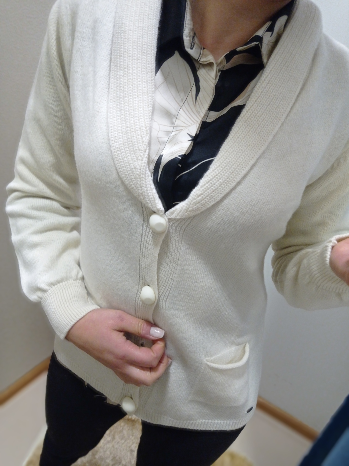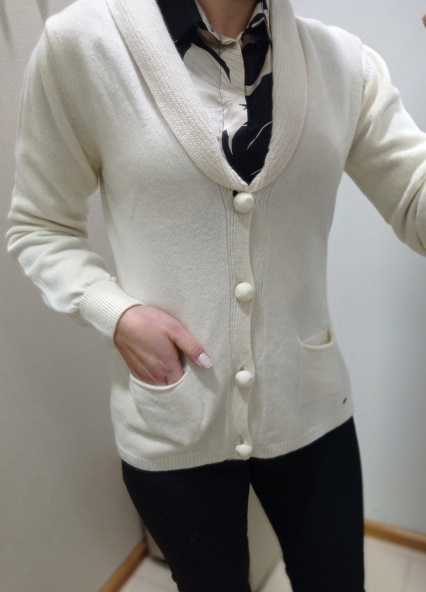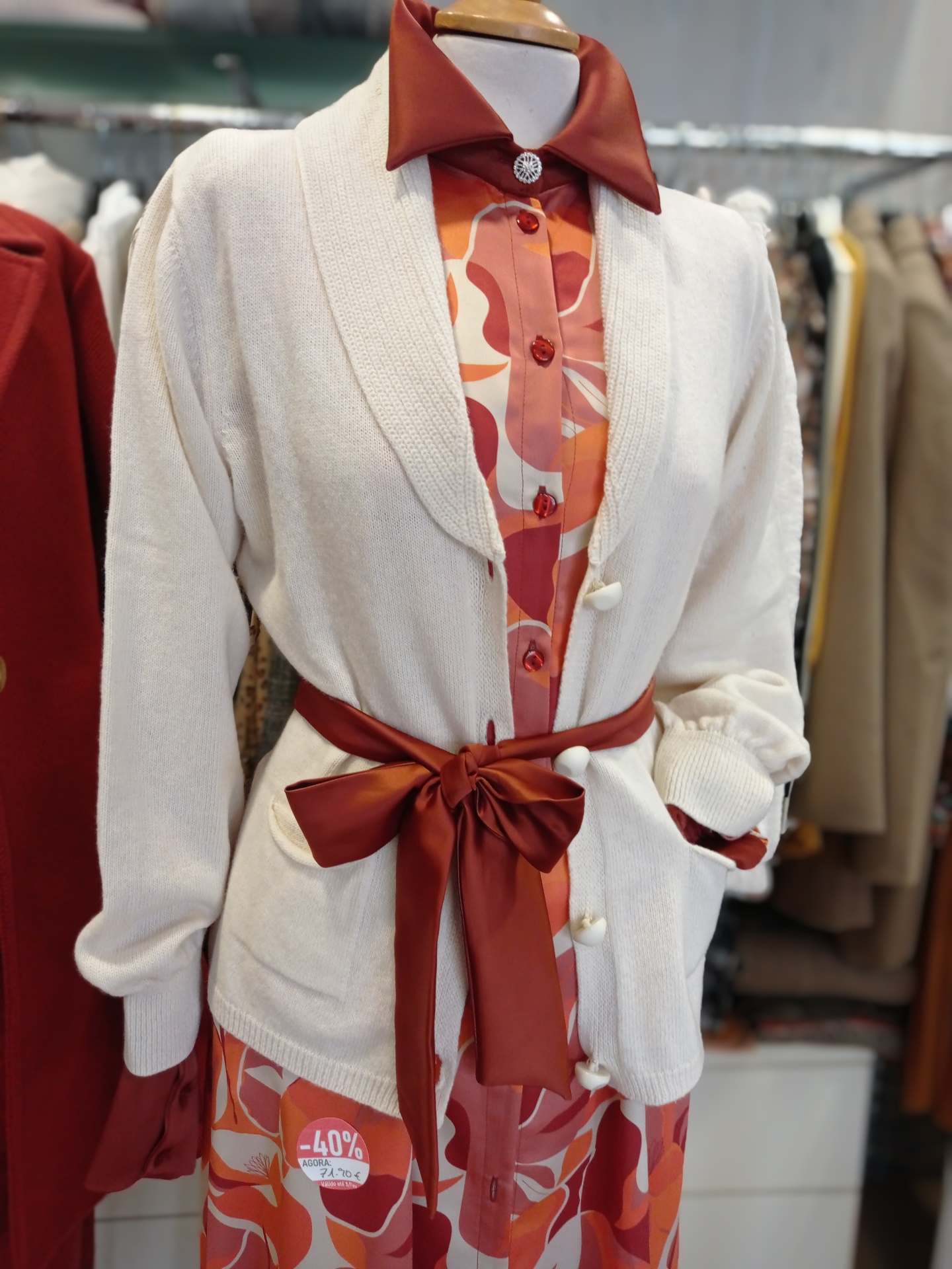 Cardigã branco com cinto castanho sobre vestido floral laranja e vermelho