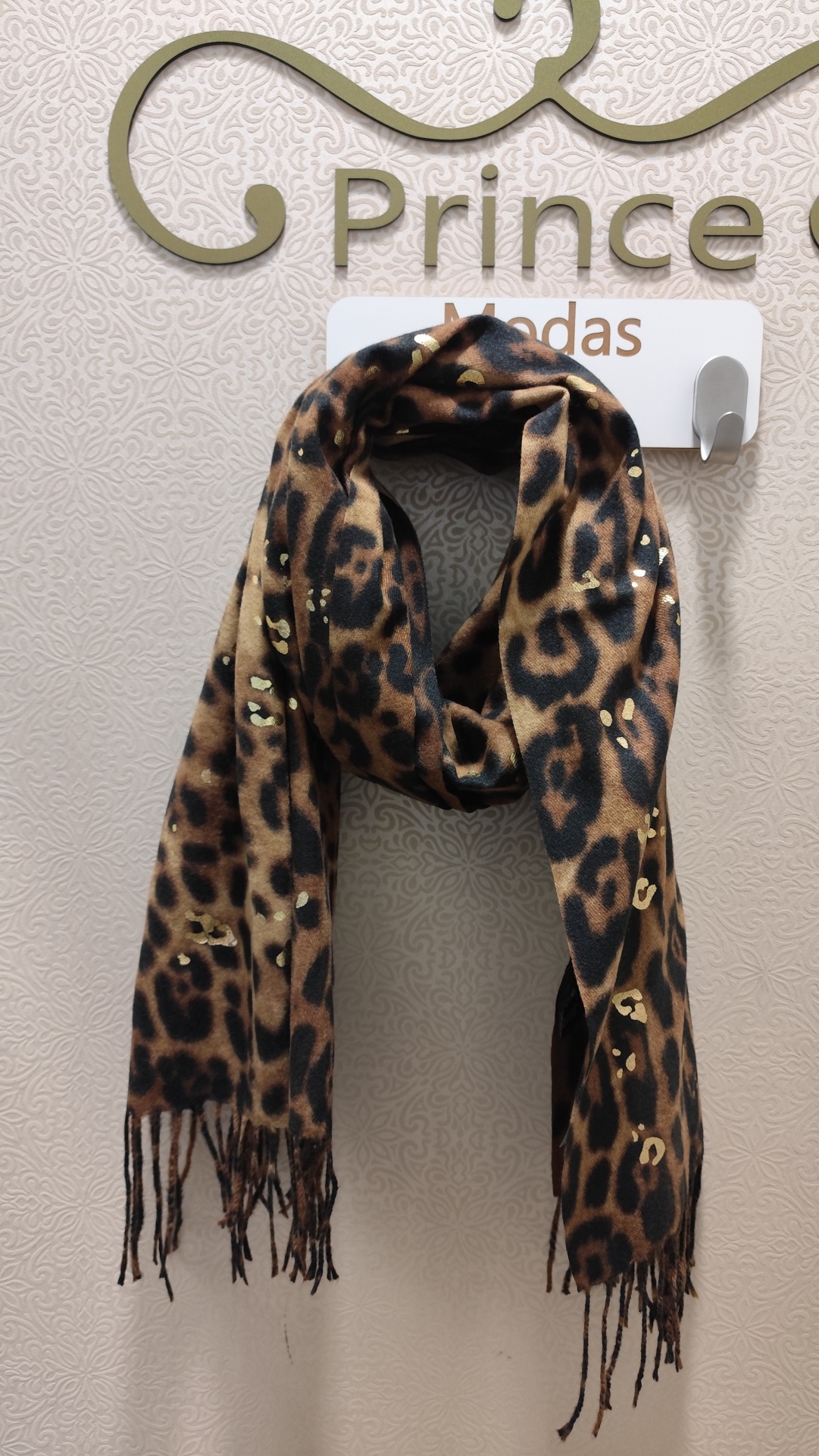 Écharpe com padrão animalprint c/ detalhes a dourado.