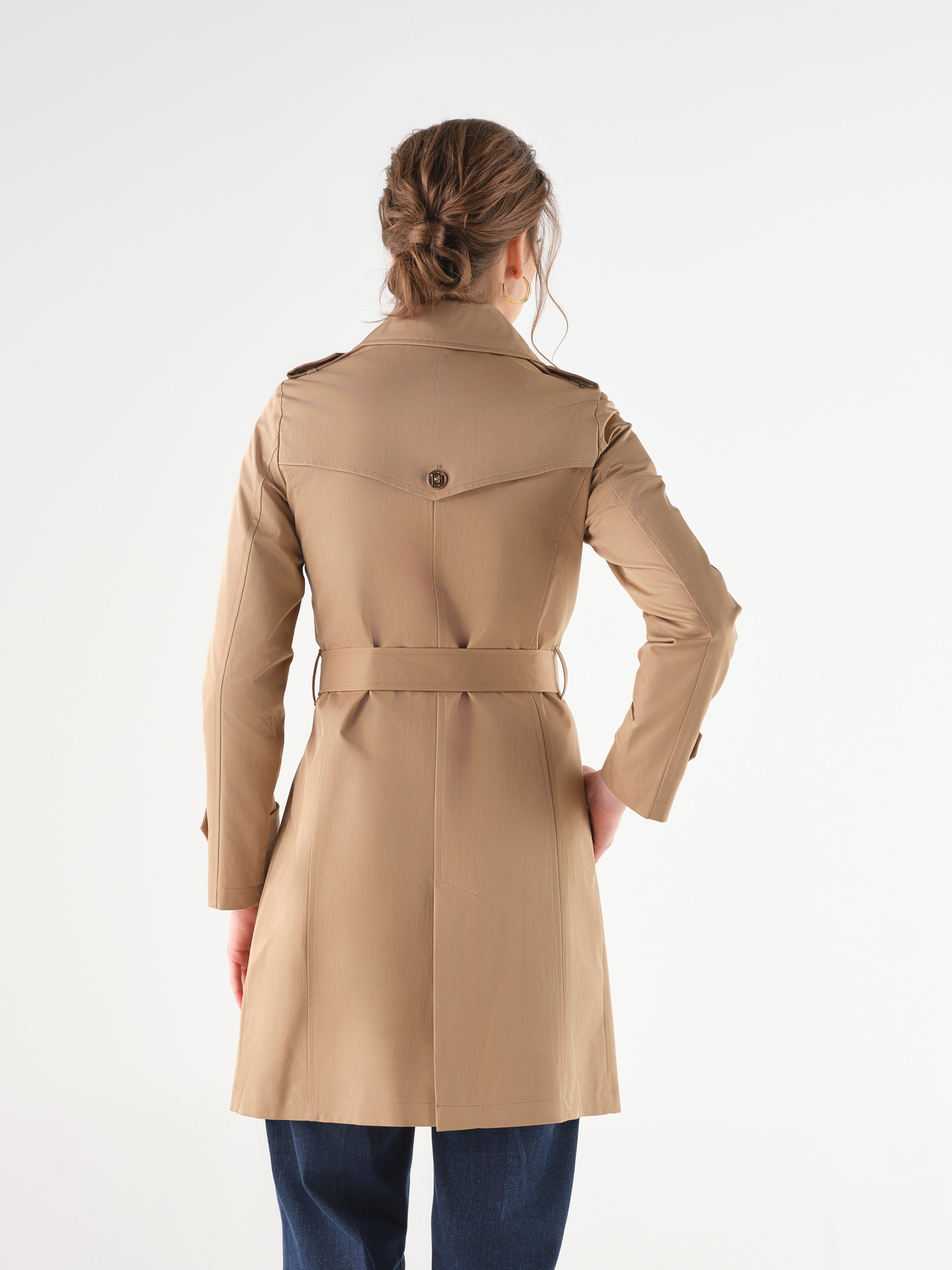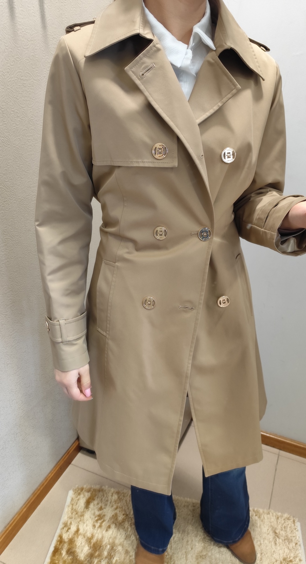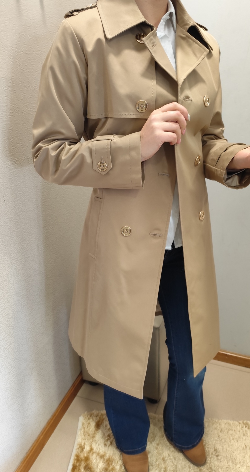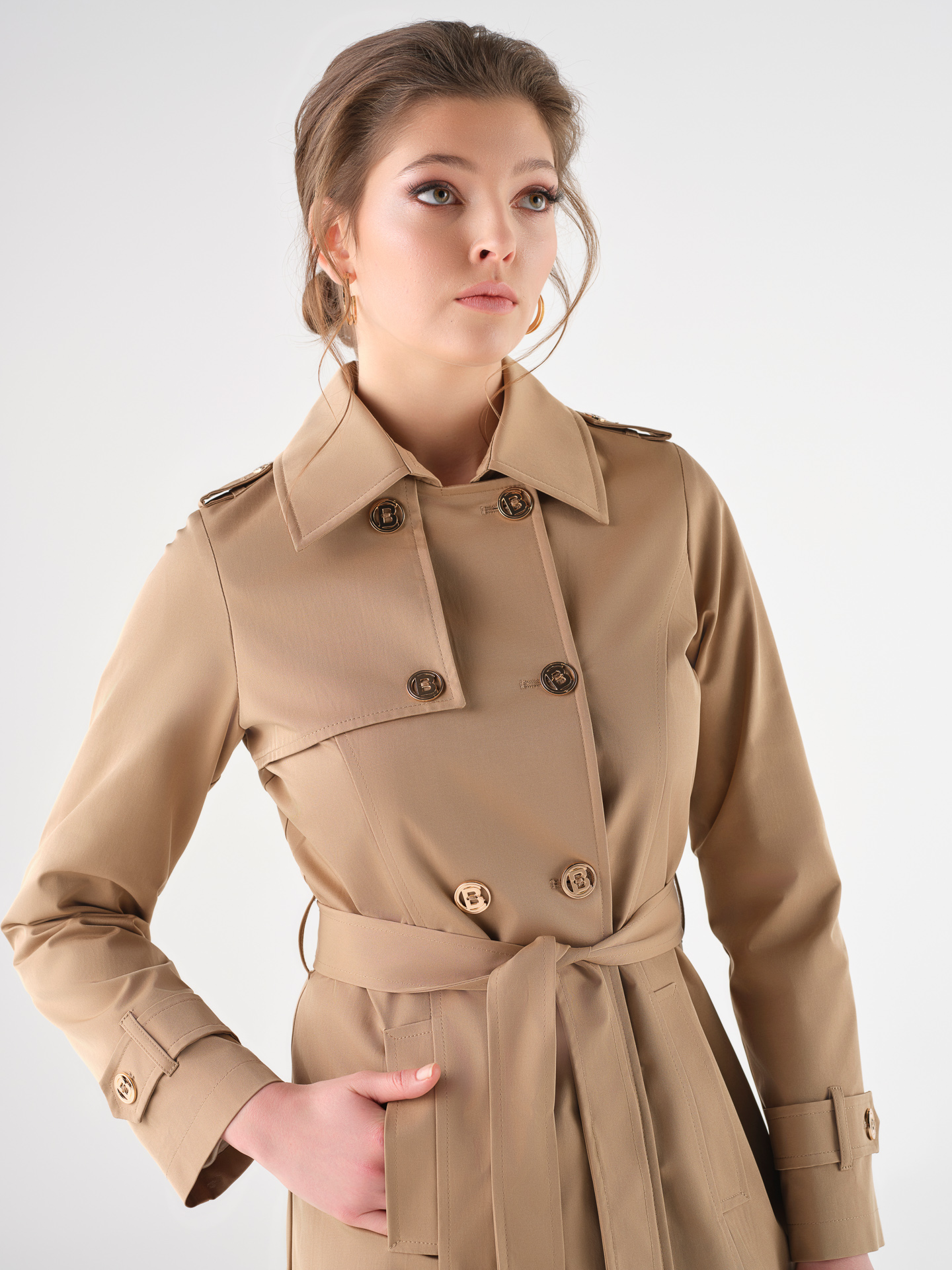 Gabardine em bege, com cinto.