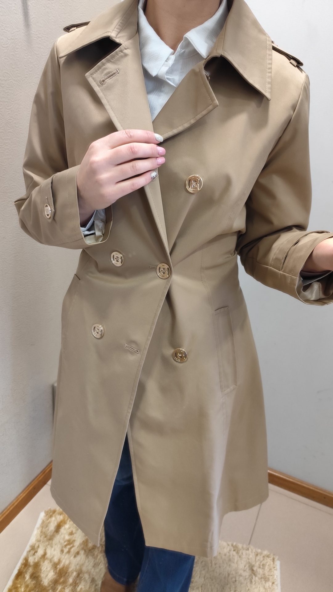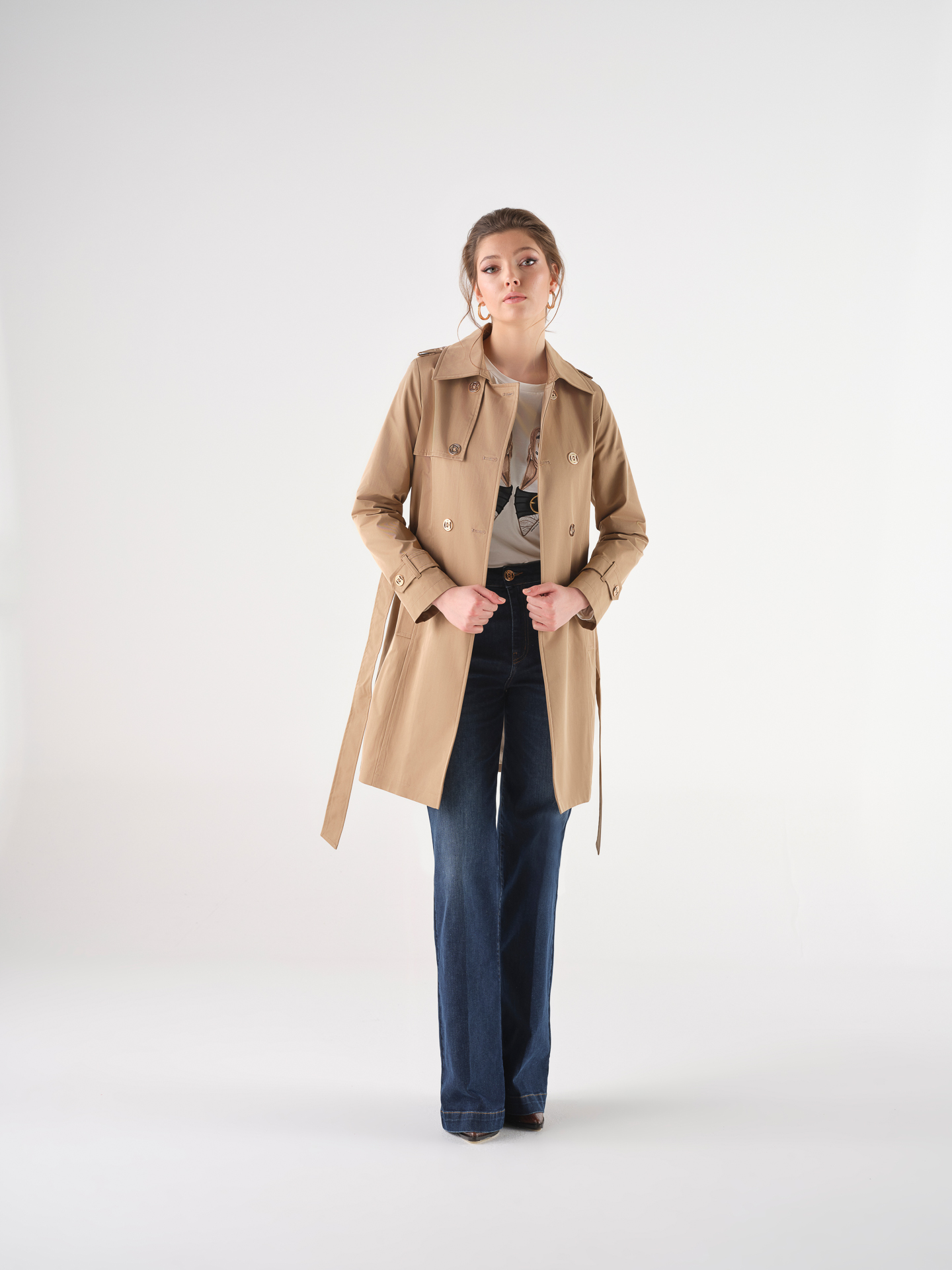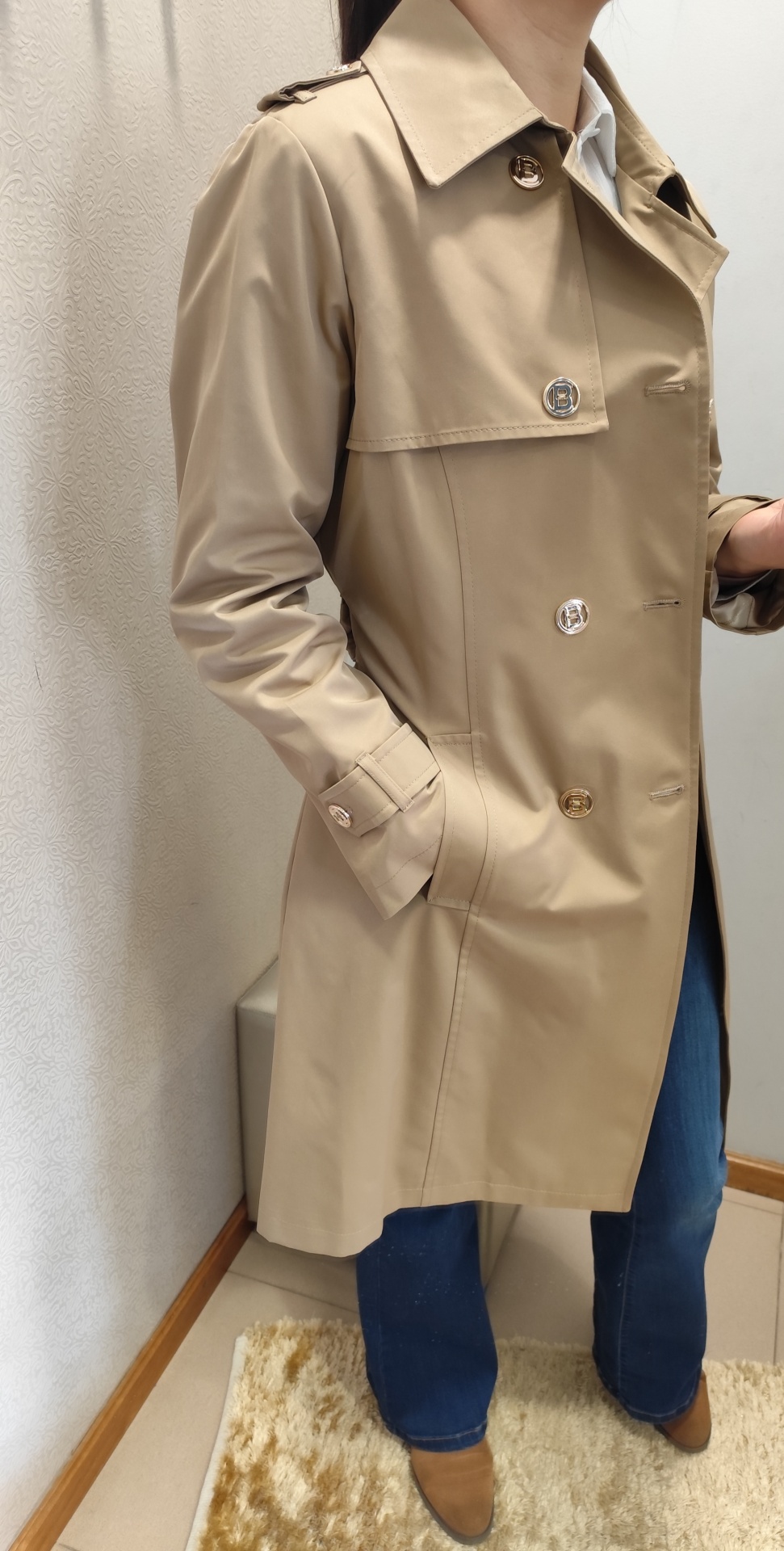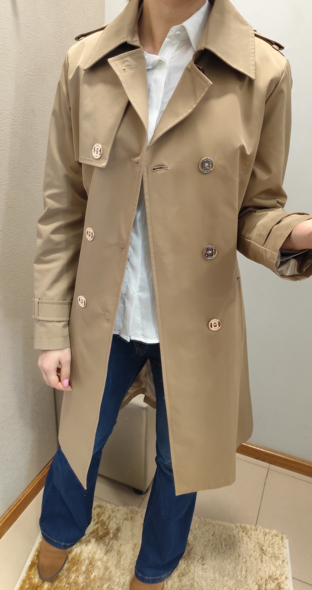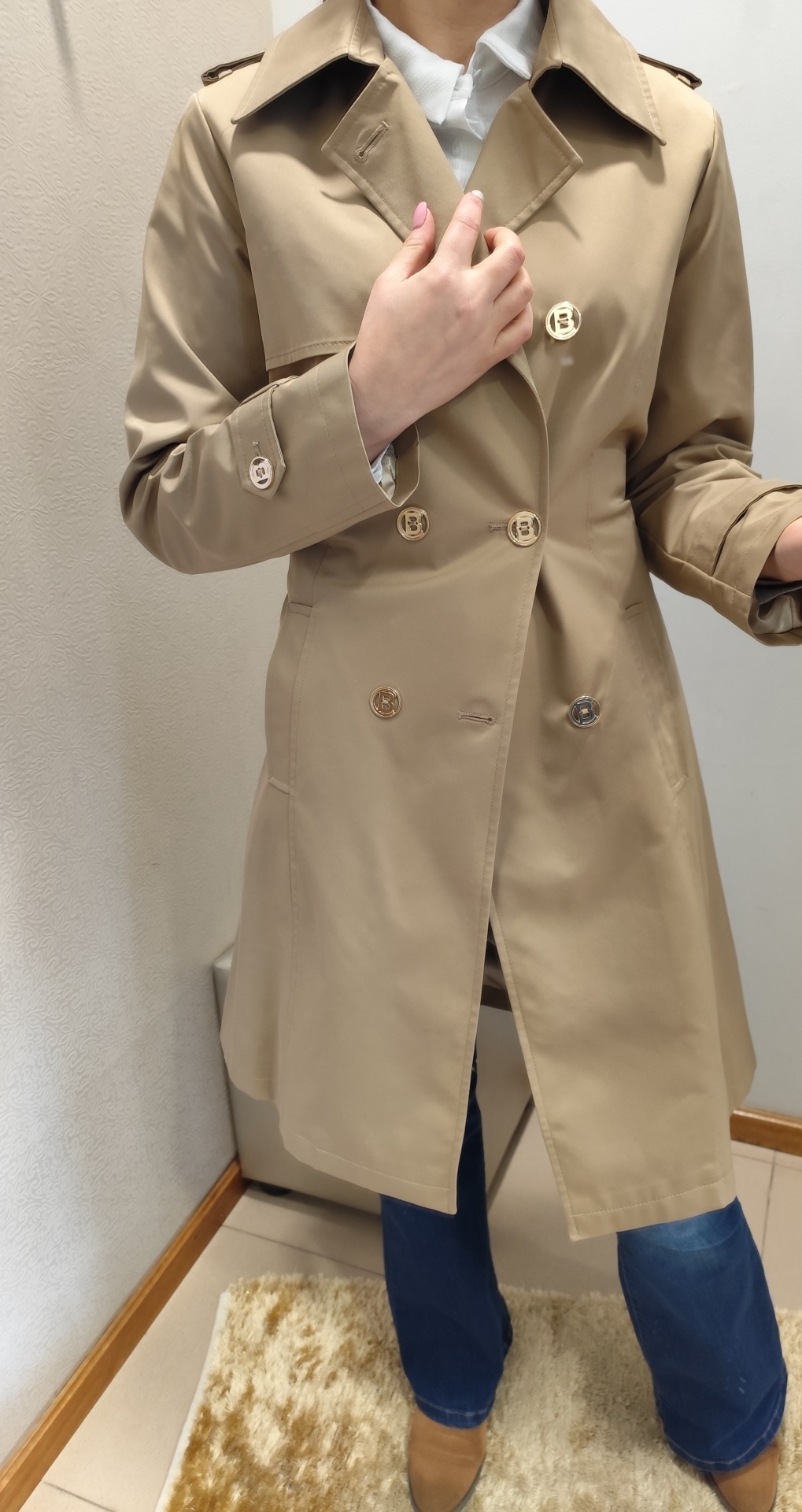 Gabardine em bege, com cinto.