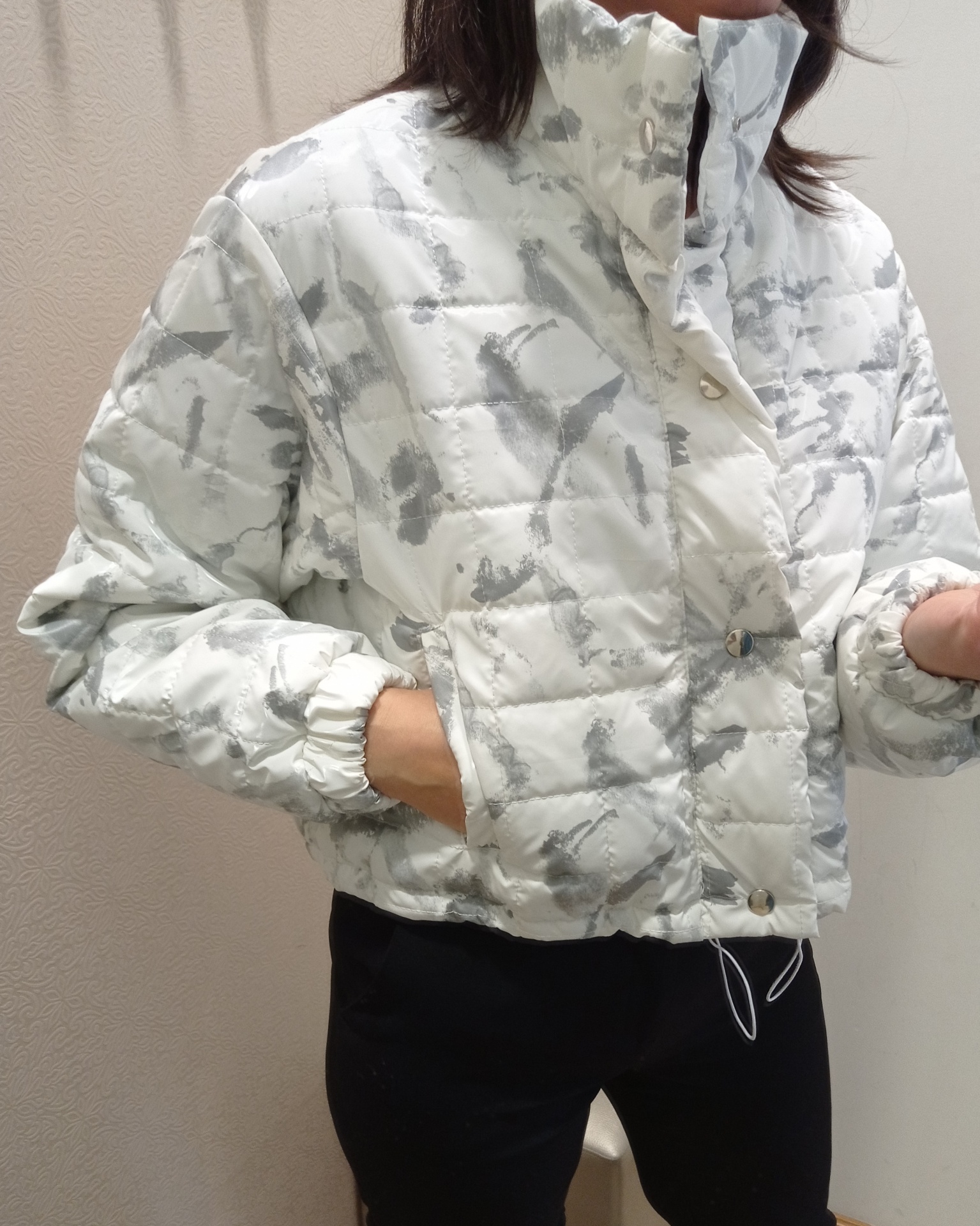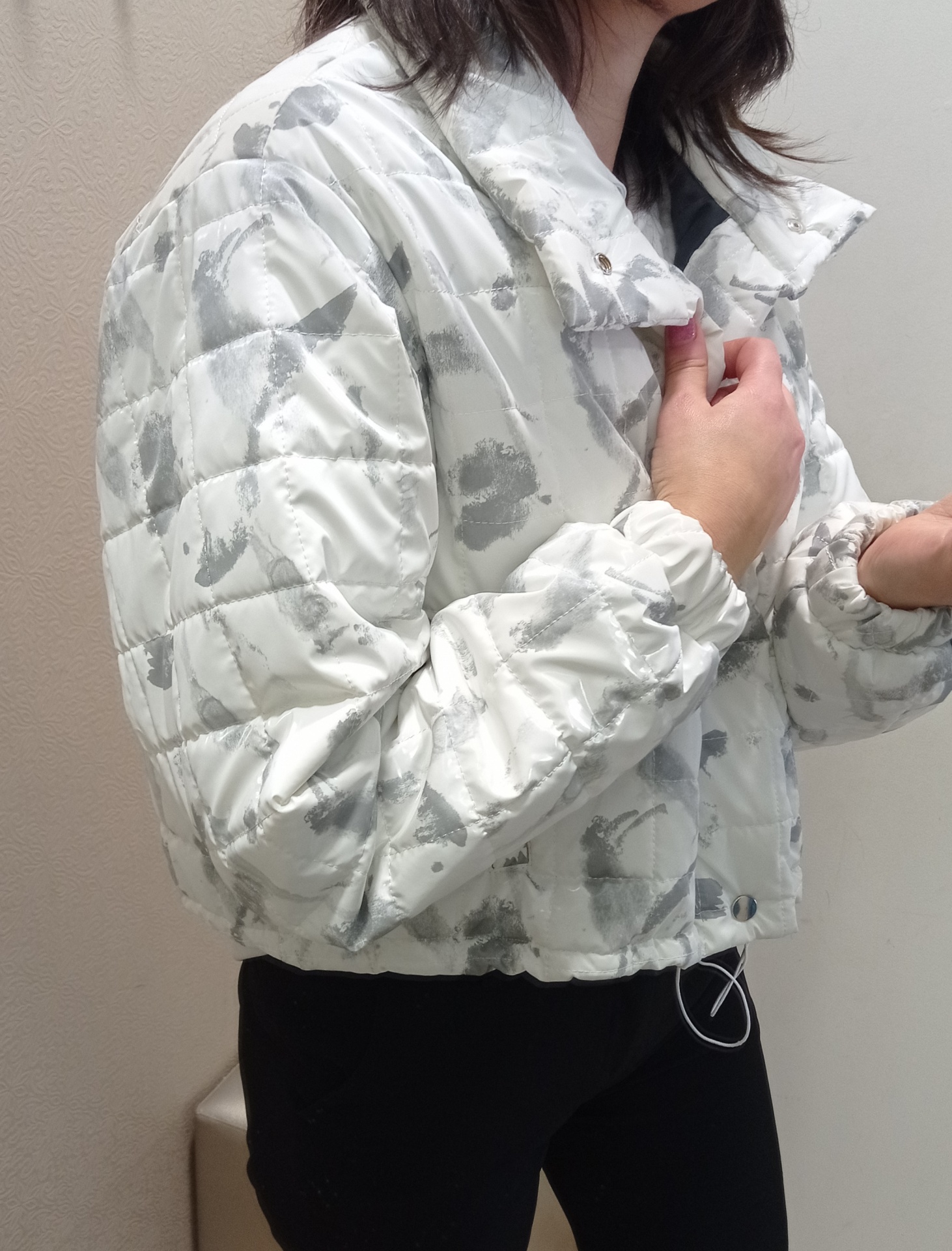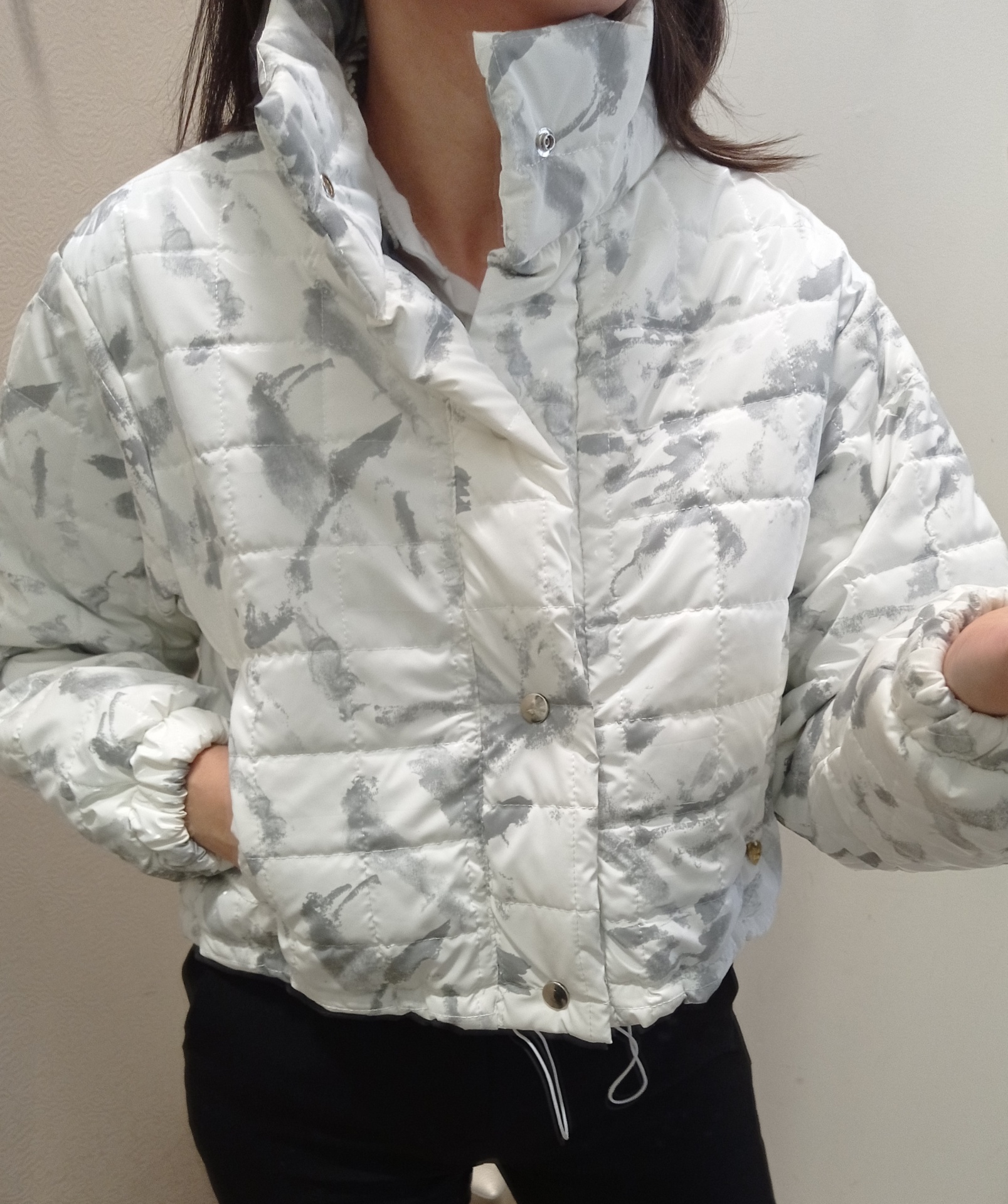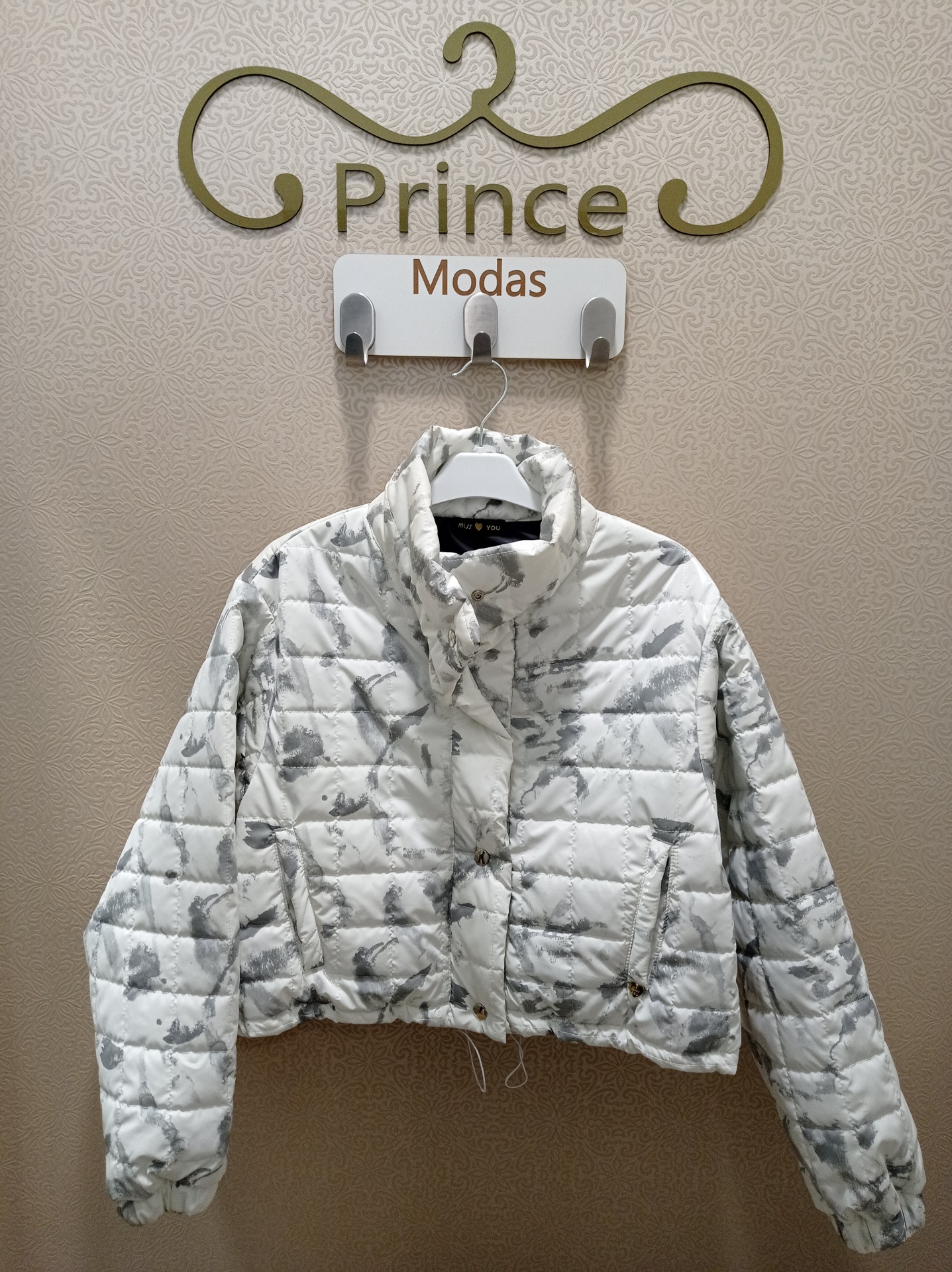 Kispo curto, estilo bomber em branco com cinza.