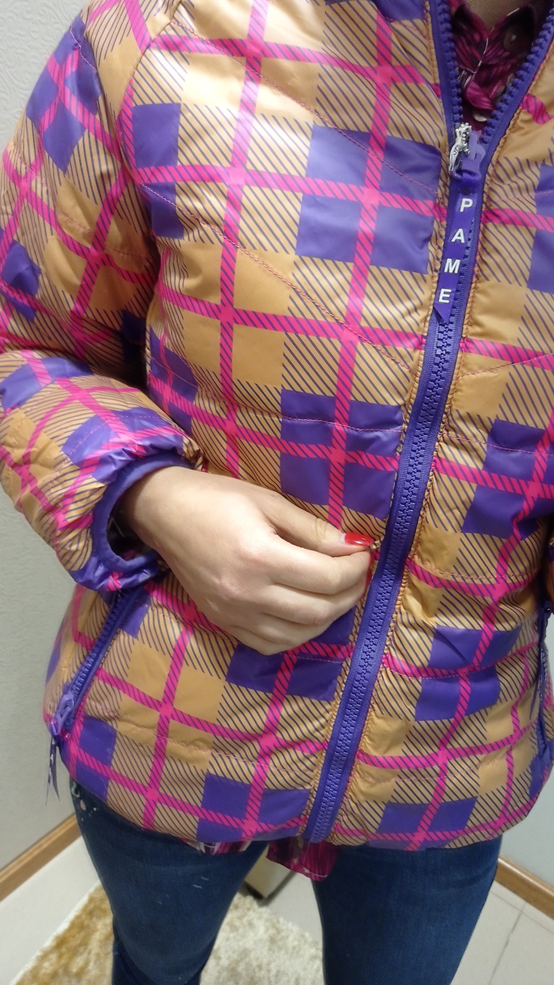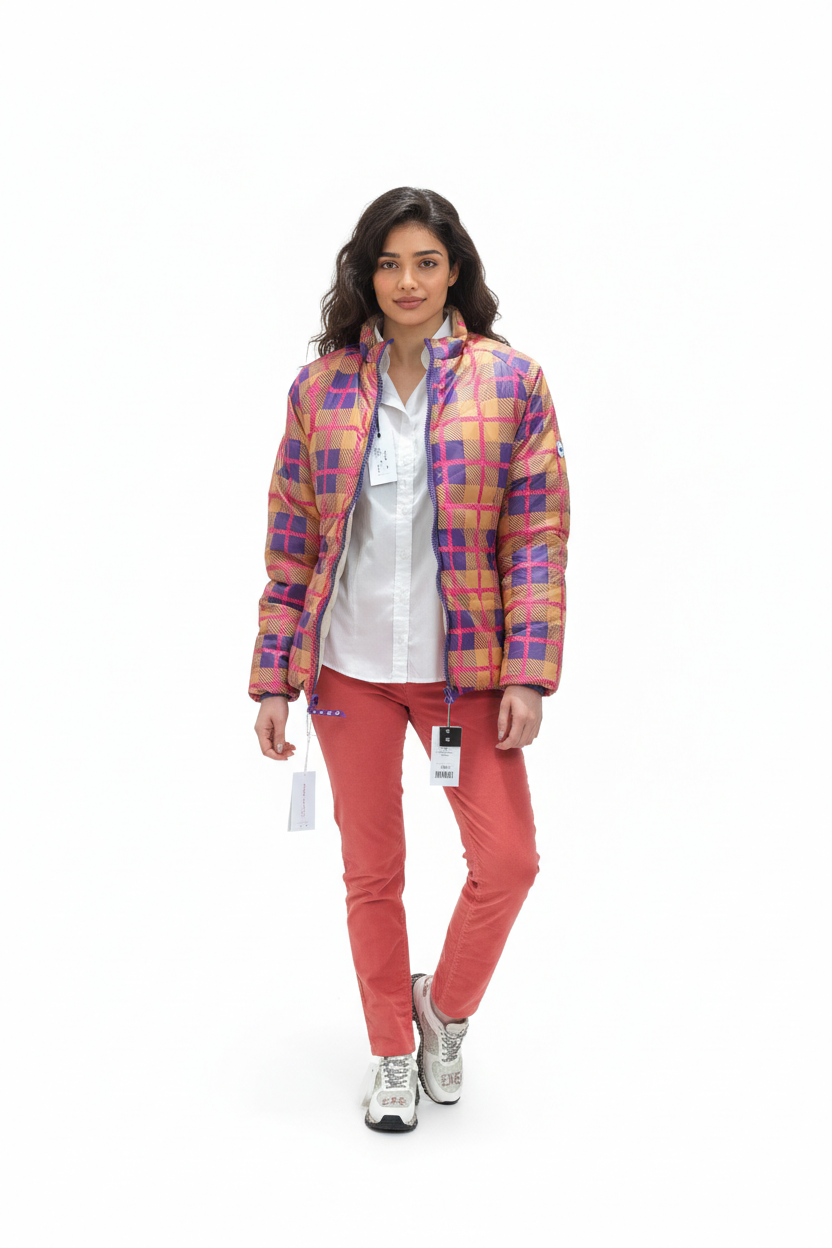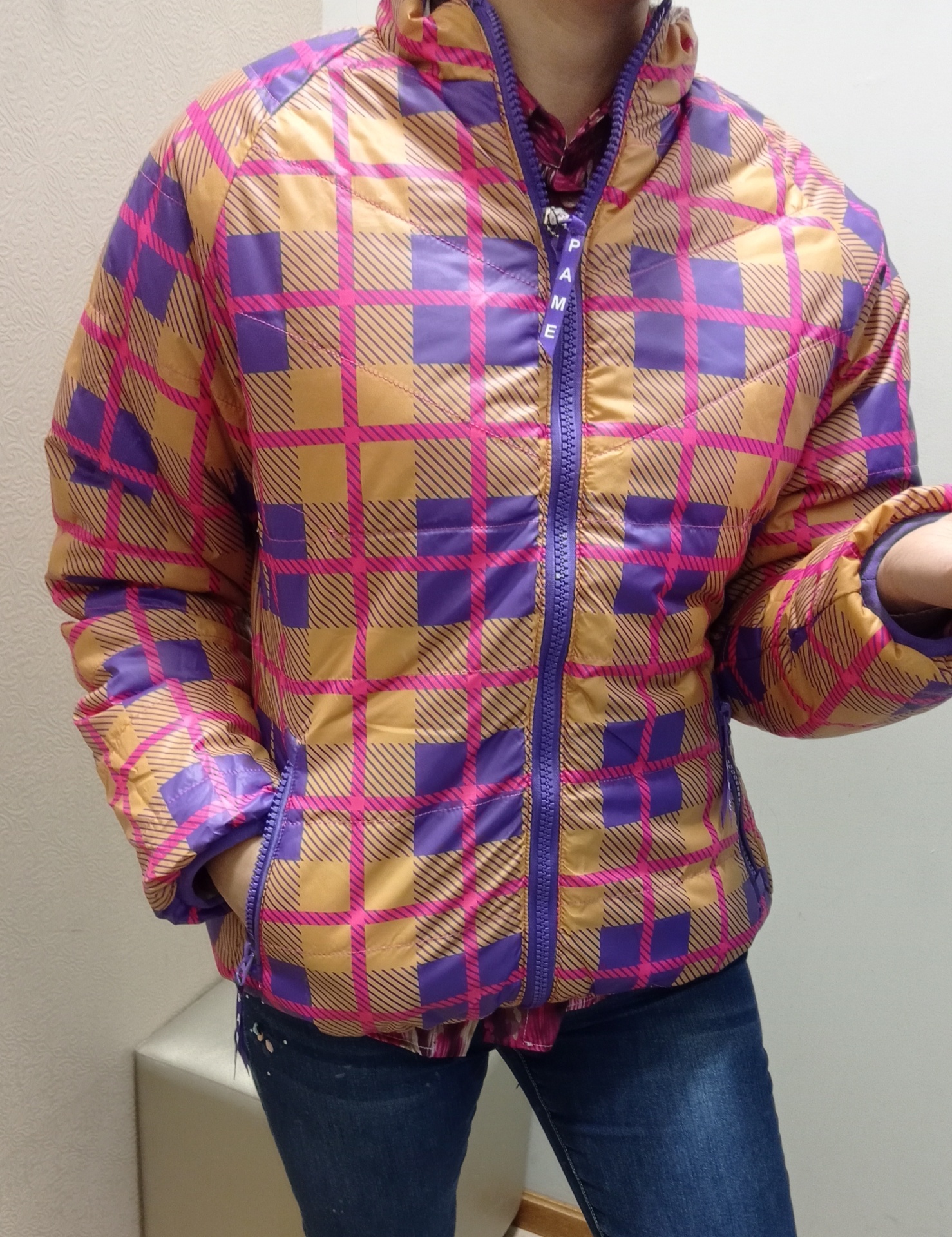 Kispo curto, reversível. De um lado axadrezado, do outro liso.