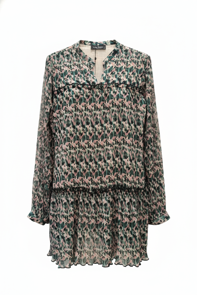 Vestido em tons de verde. Modelo direito e curto. Tecido plissado.