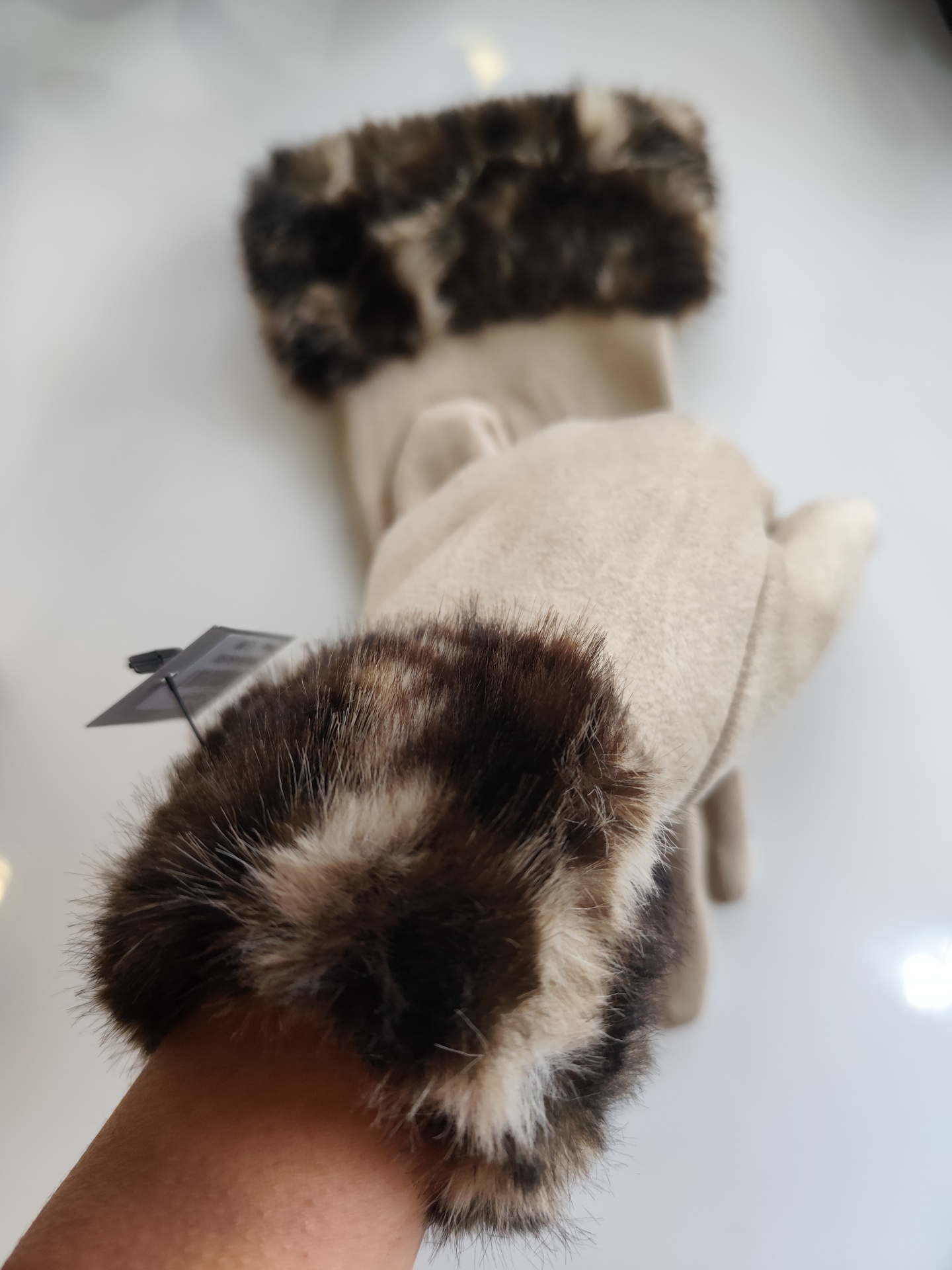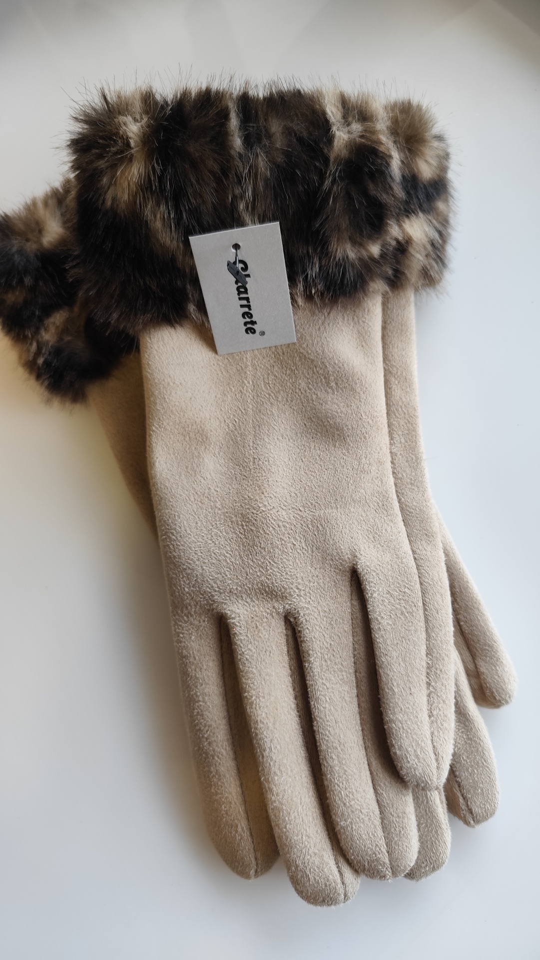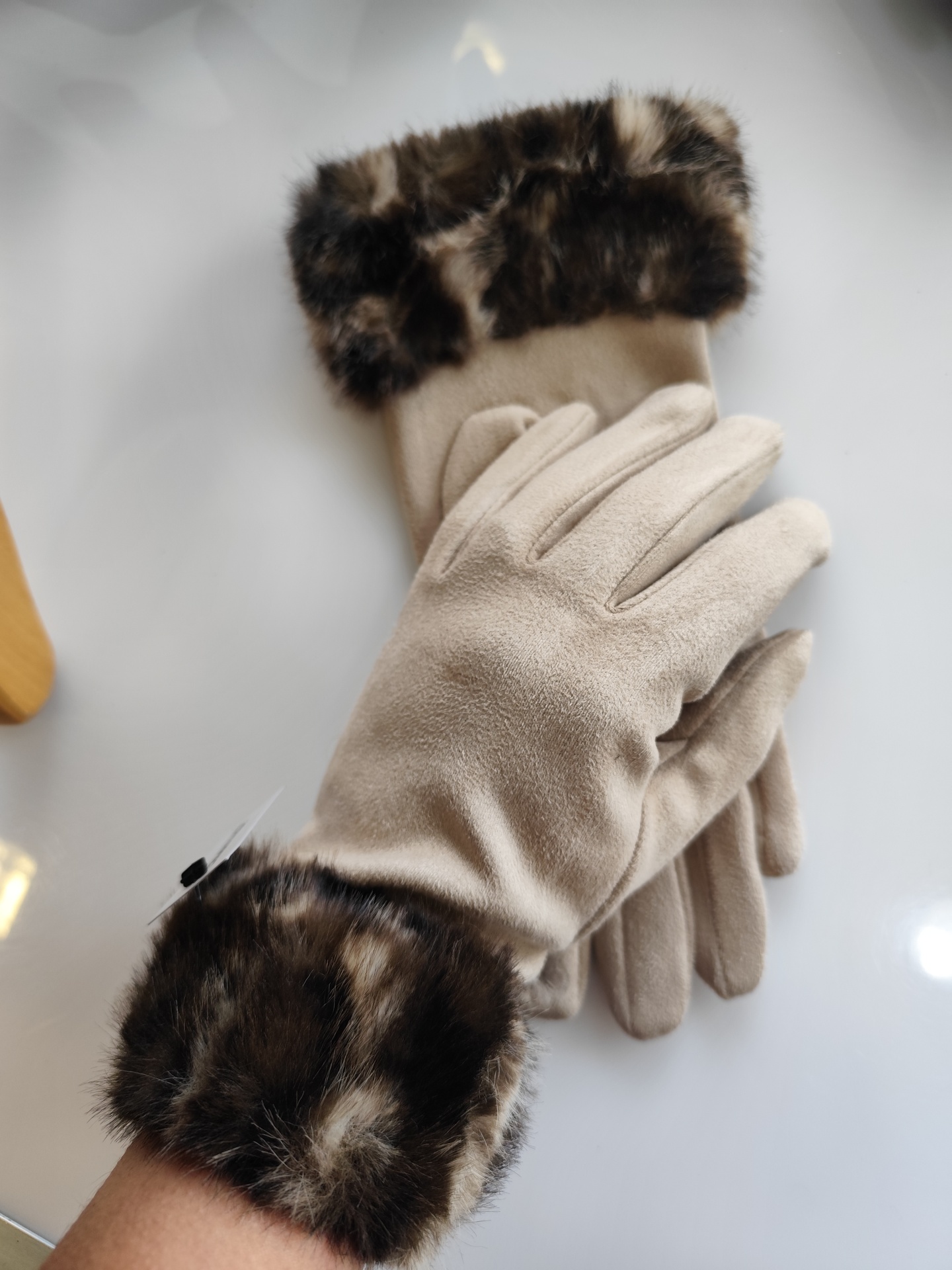 Luvas, a imitar pele de pêssego, com pelinho animalprint.