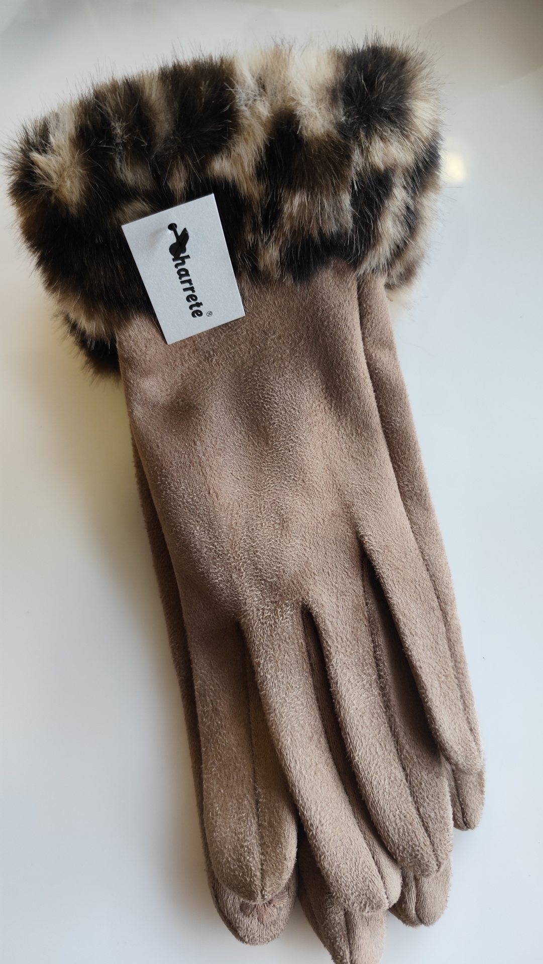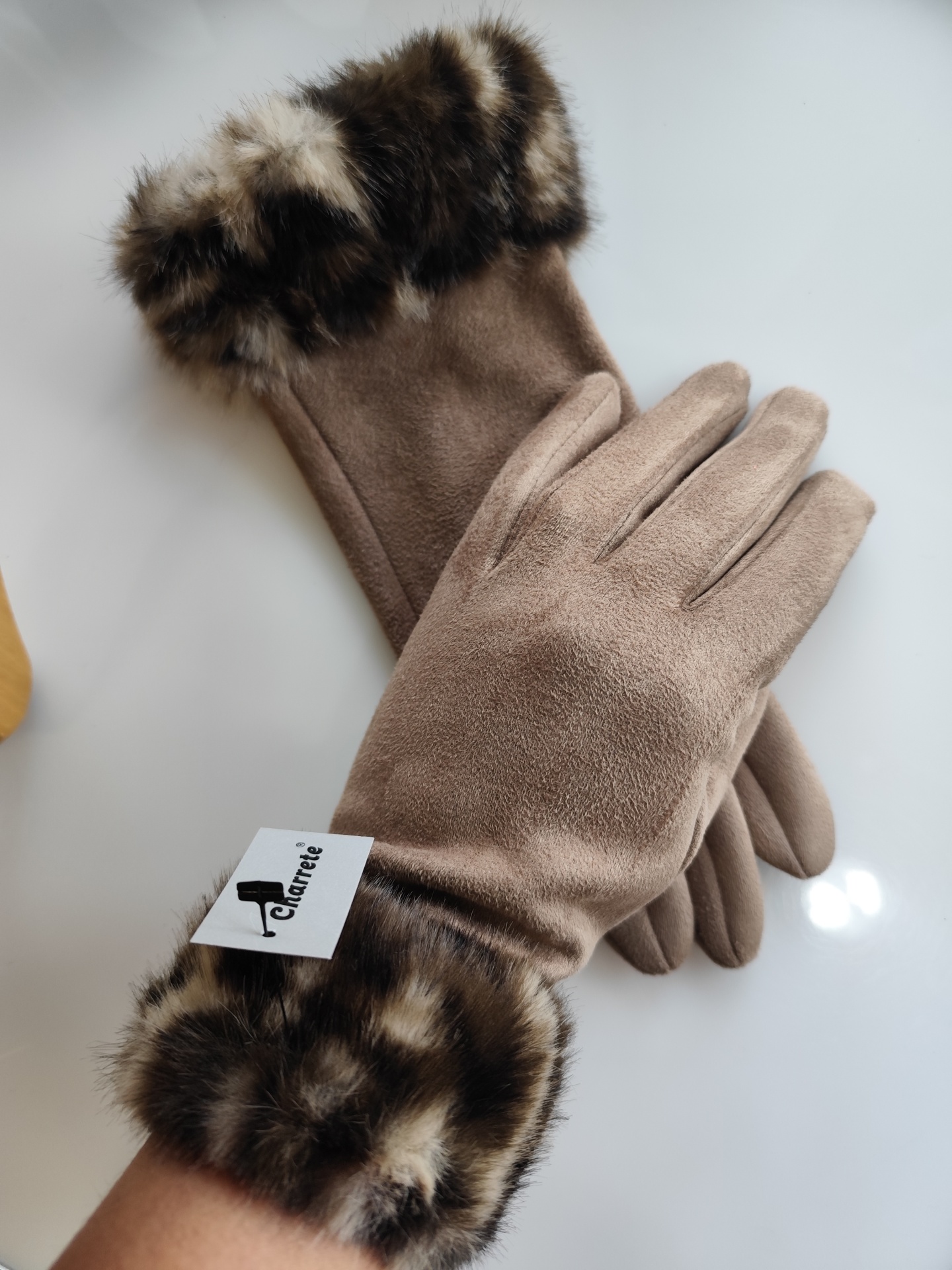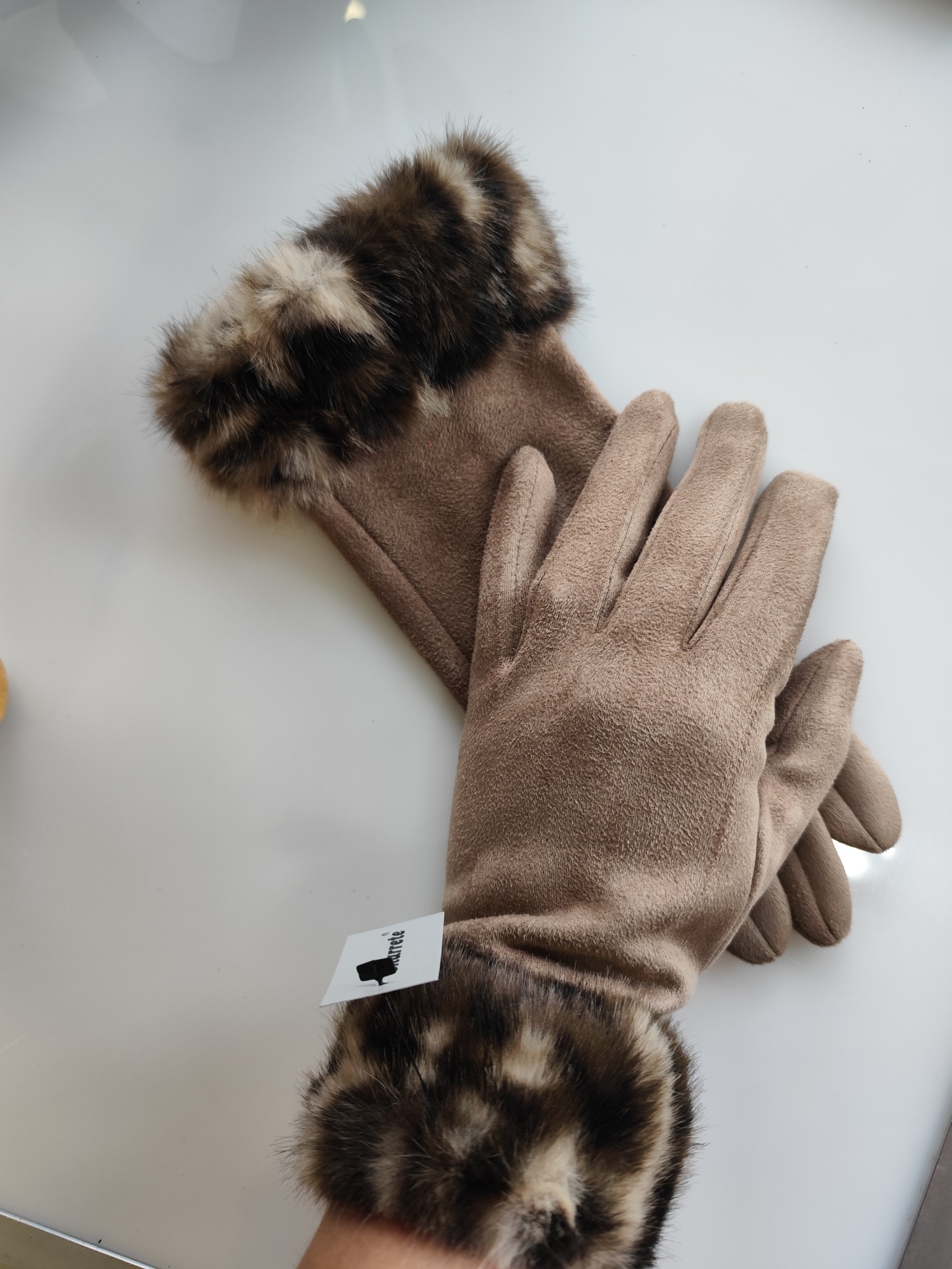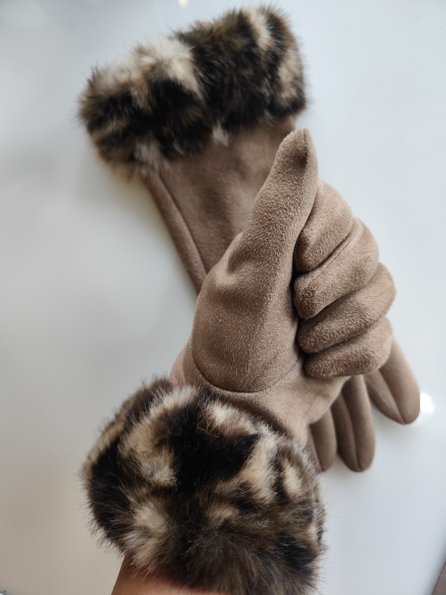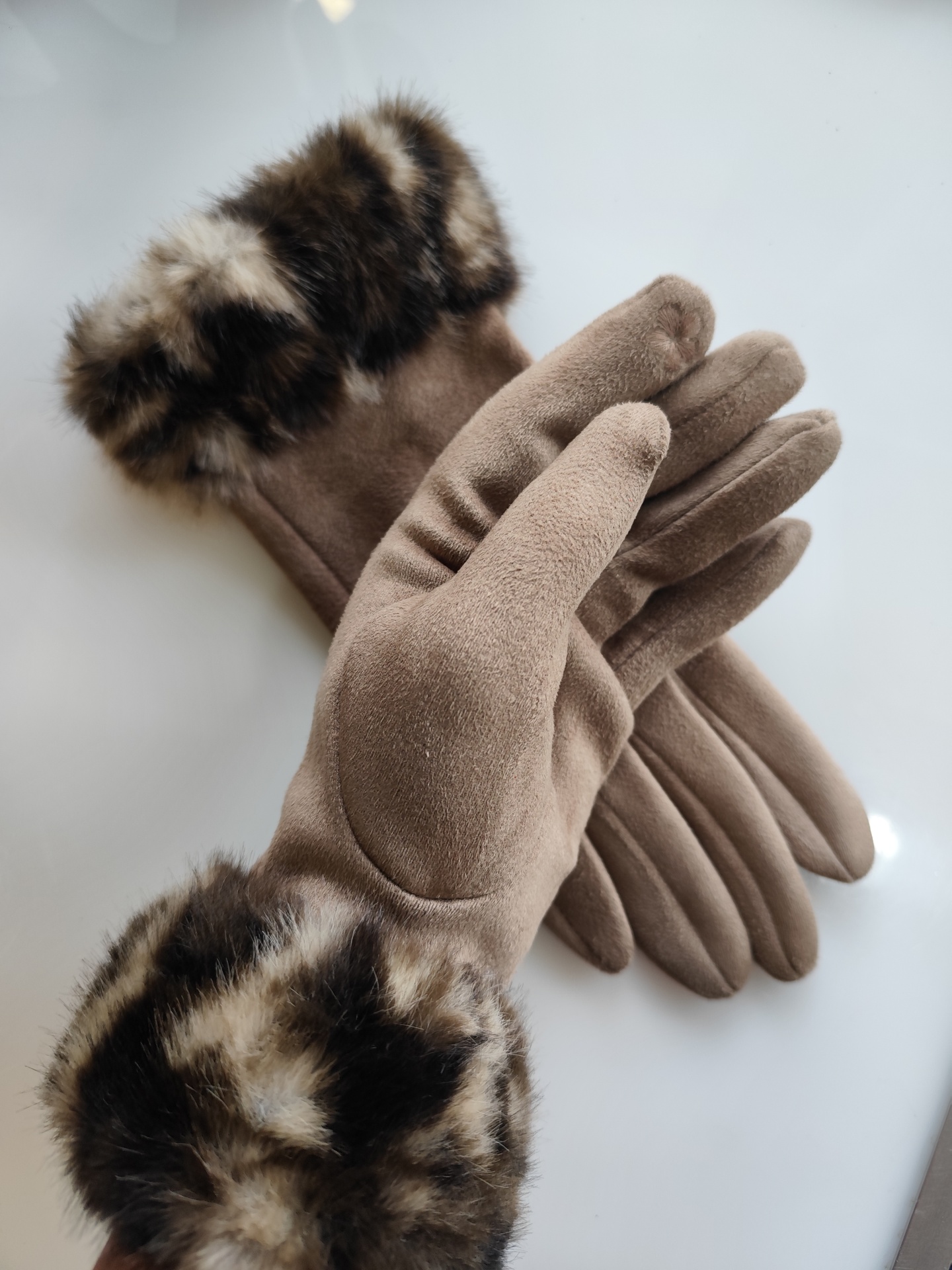 Luvas, a imitar pele de pêssego, com pelinho animalprint.