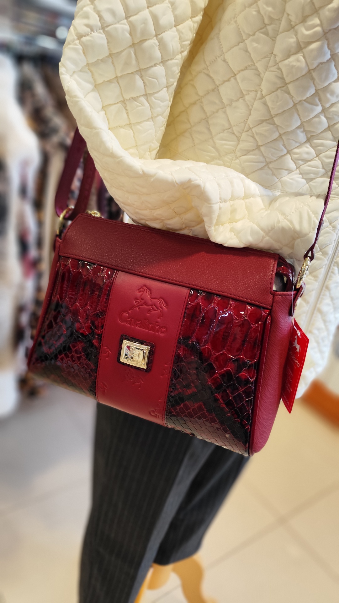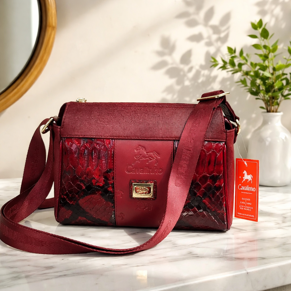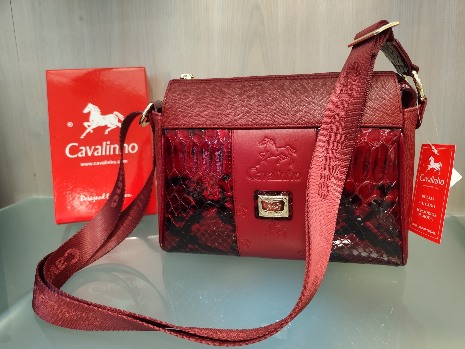 Mala em bordô a tiracolo.
