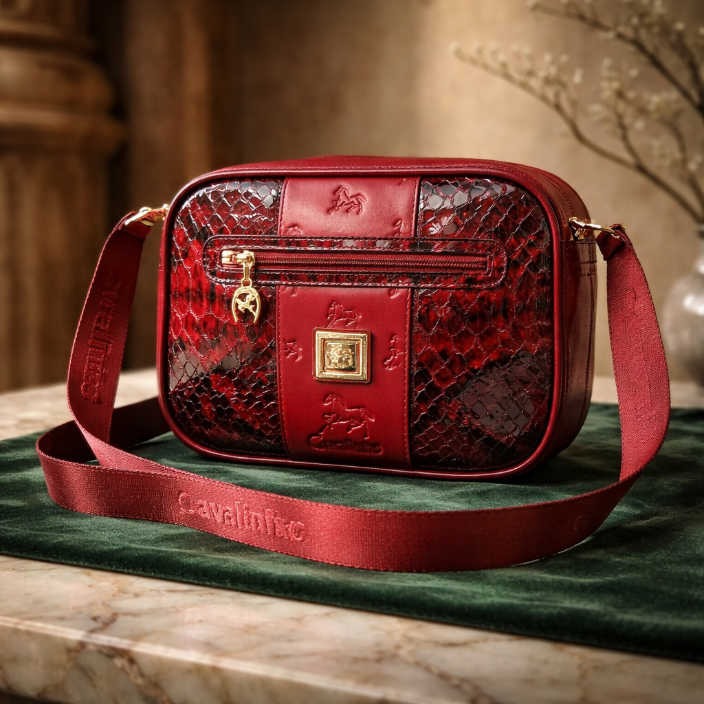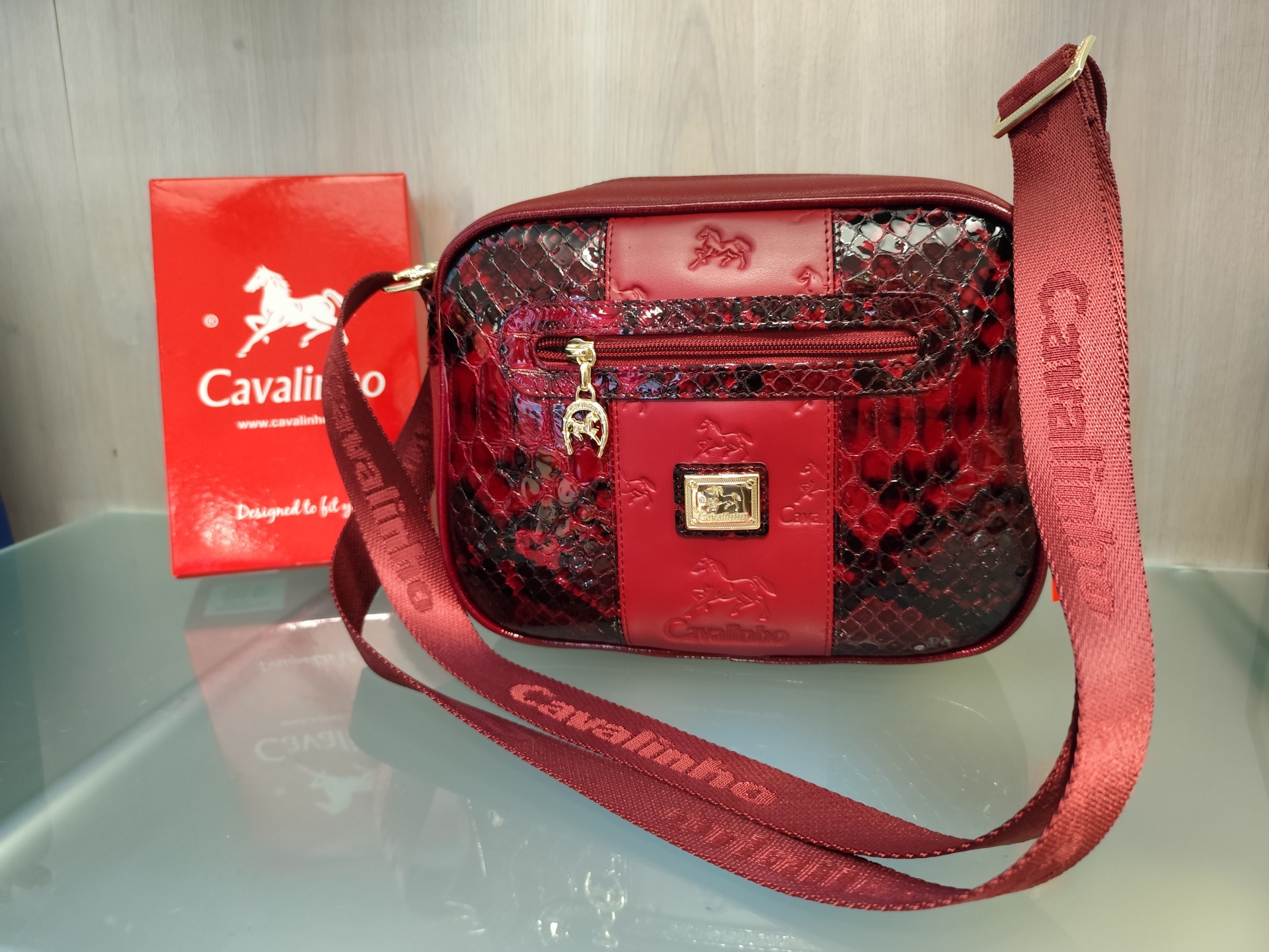 Mala em bordô a tiracolo.