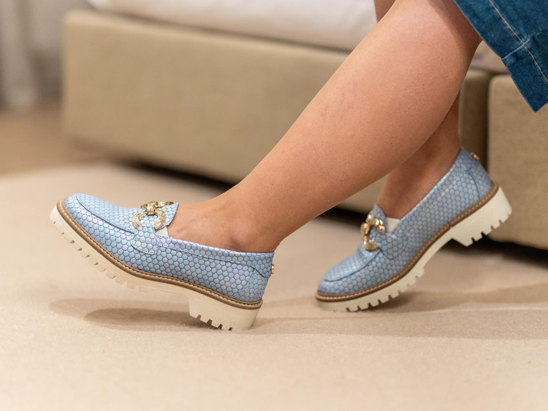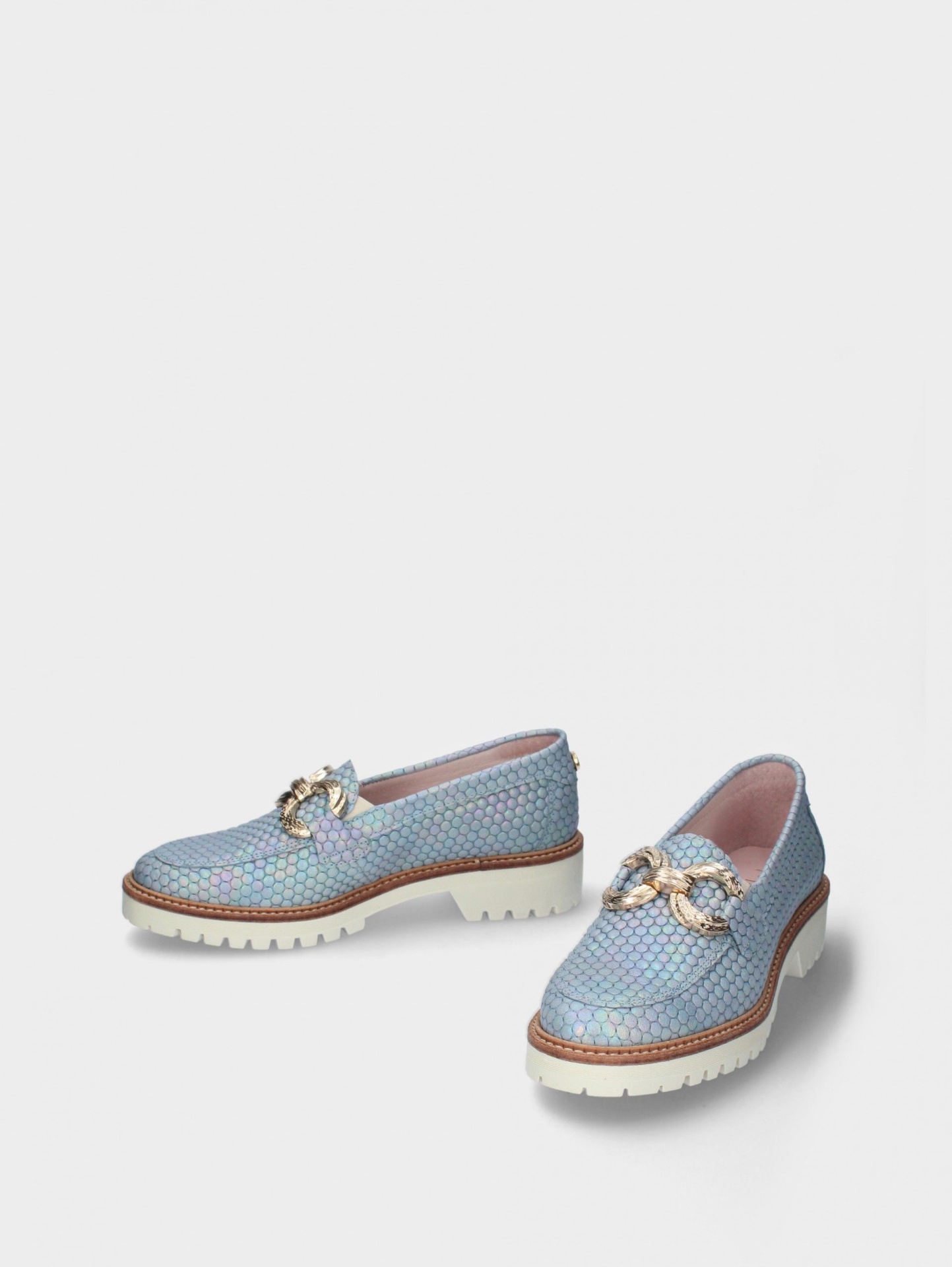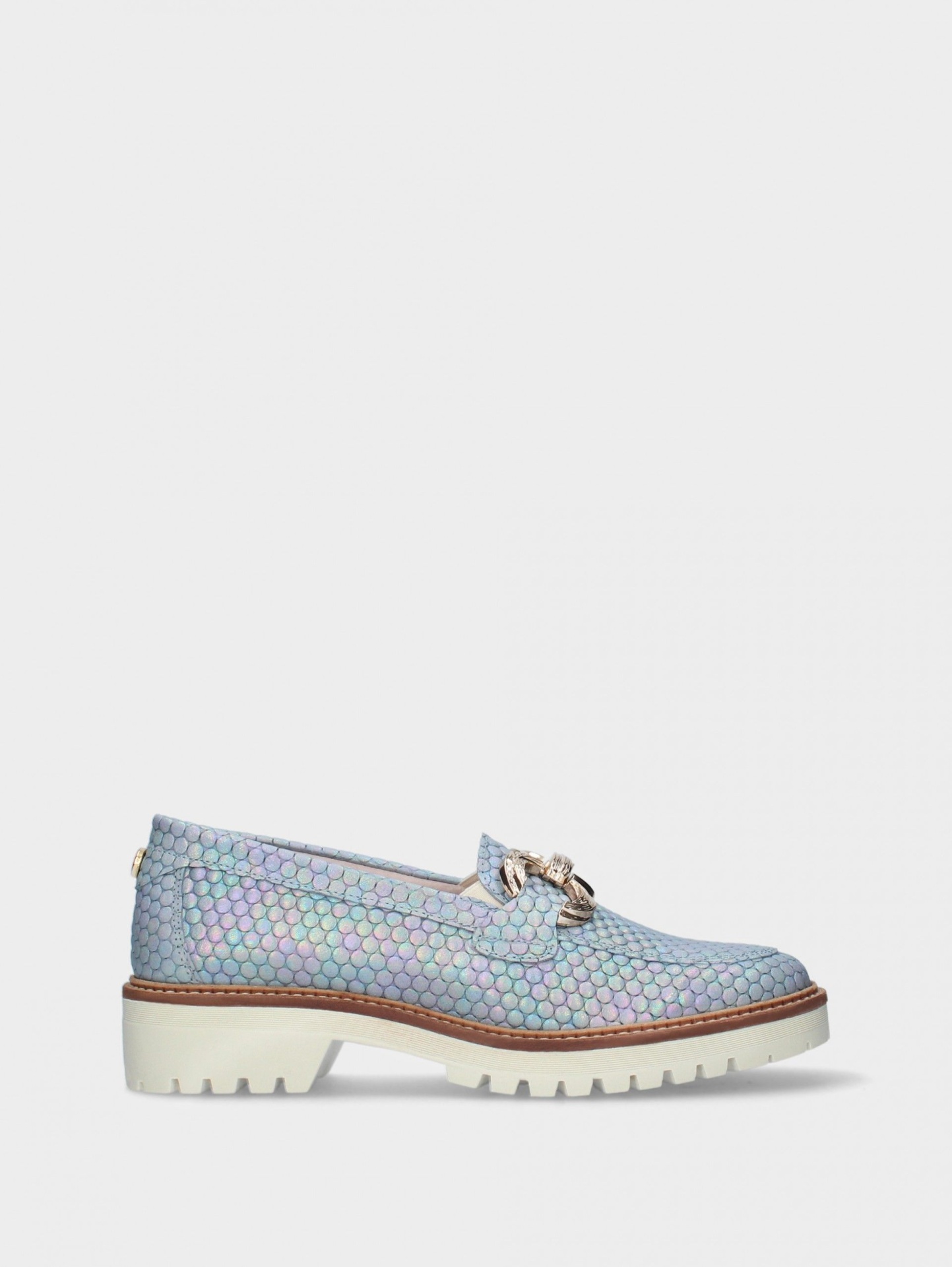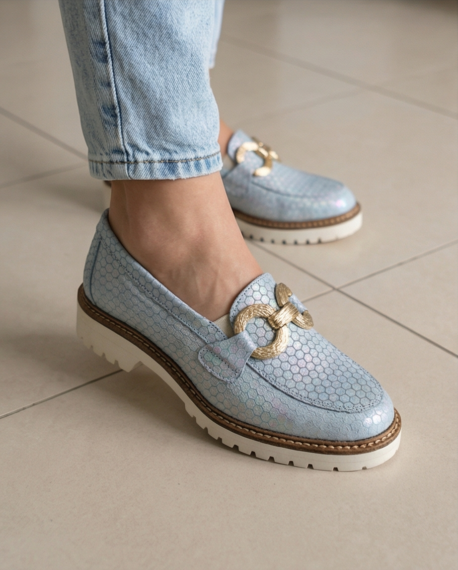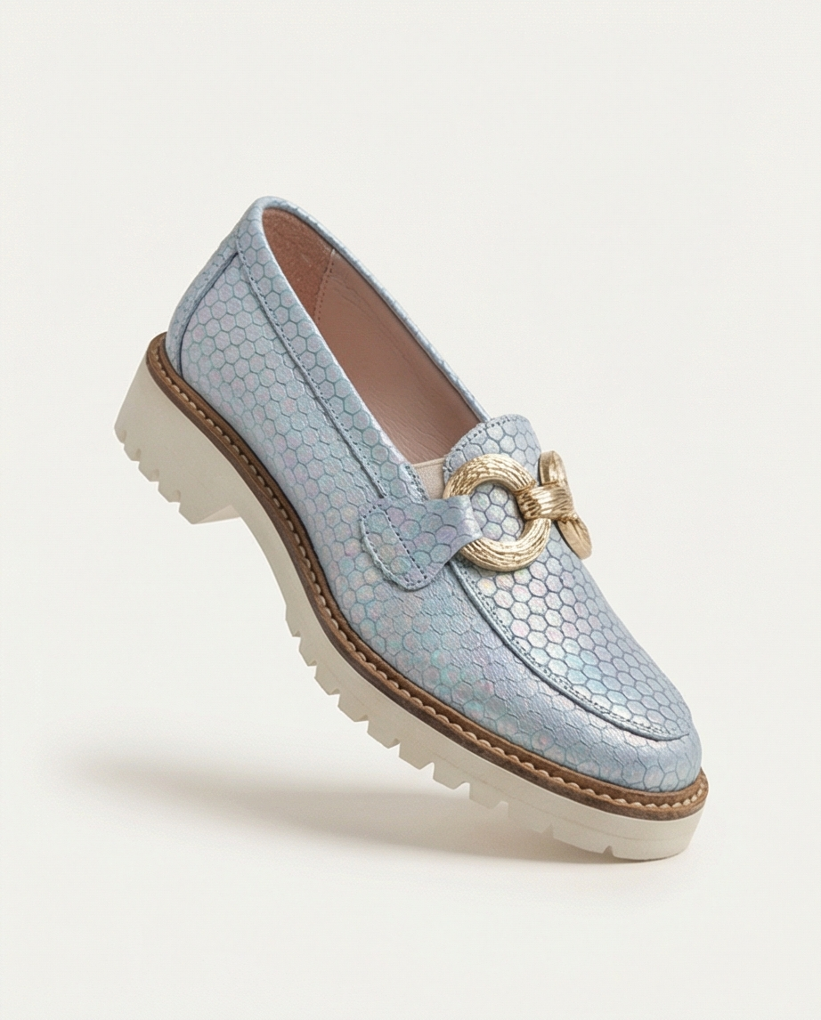 O mocassim proporciona uma marcha suave, com sola em plataforma e palmilha conforto.
