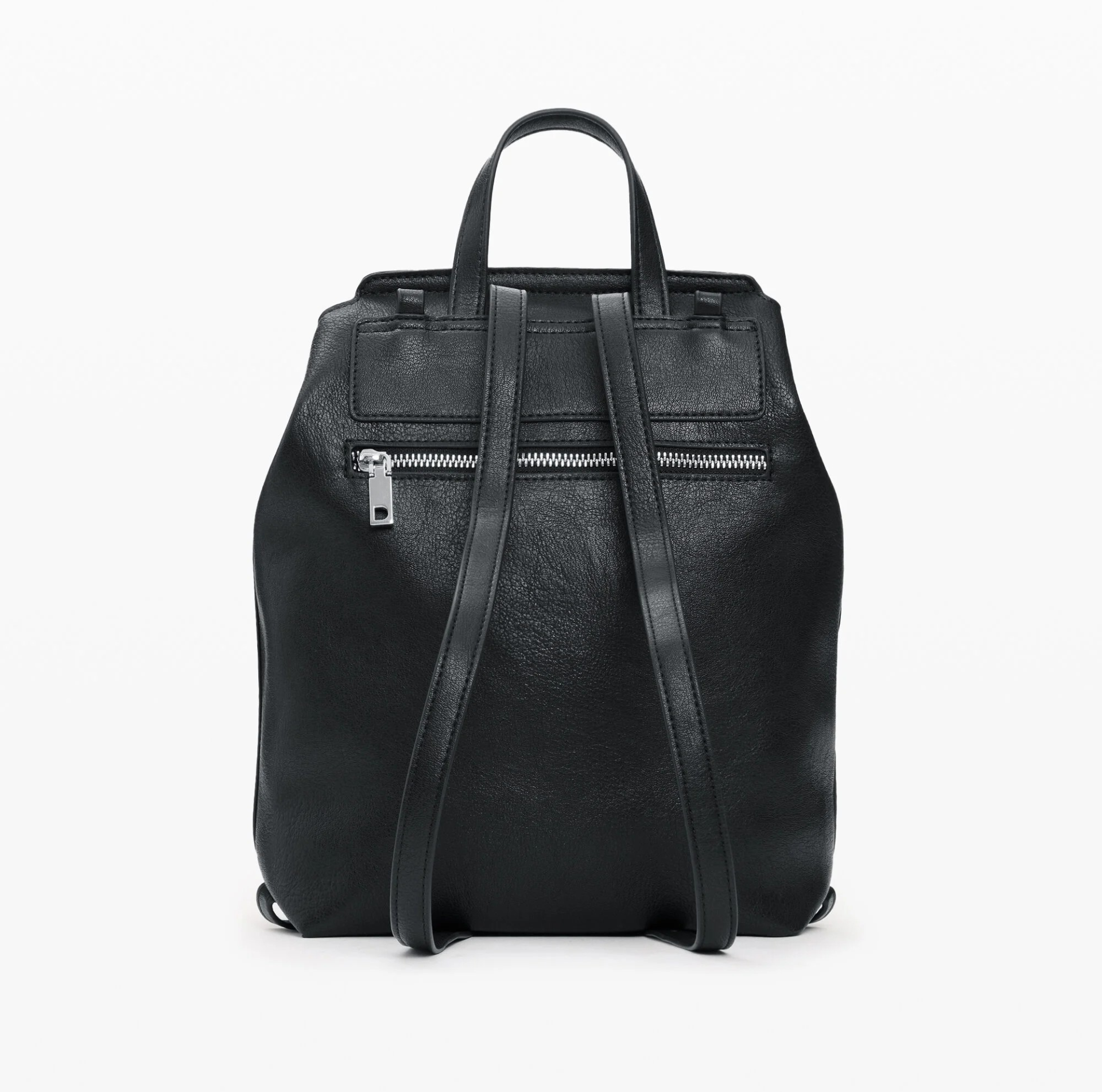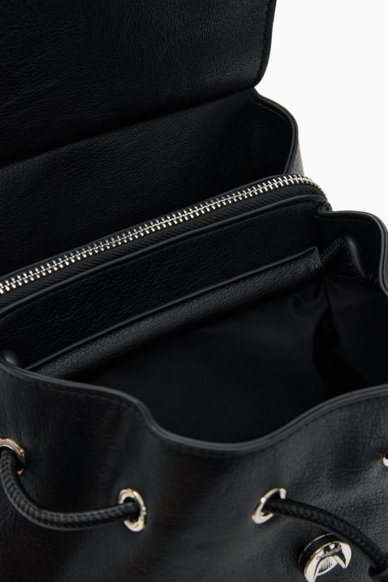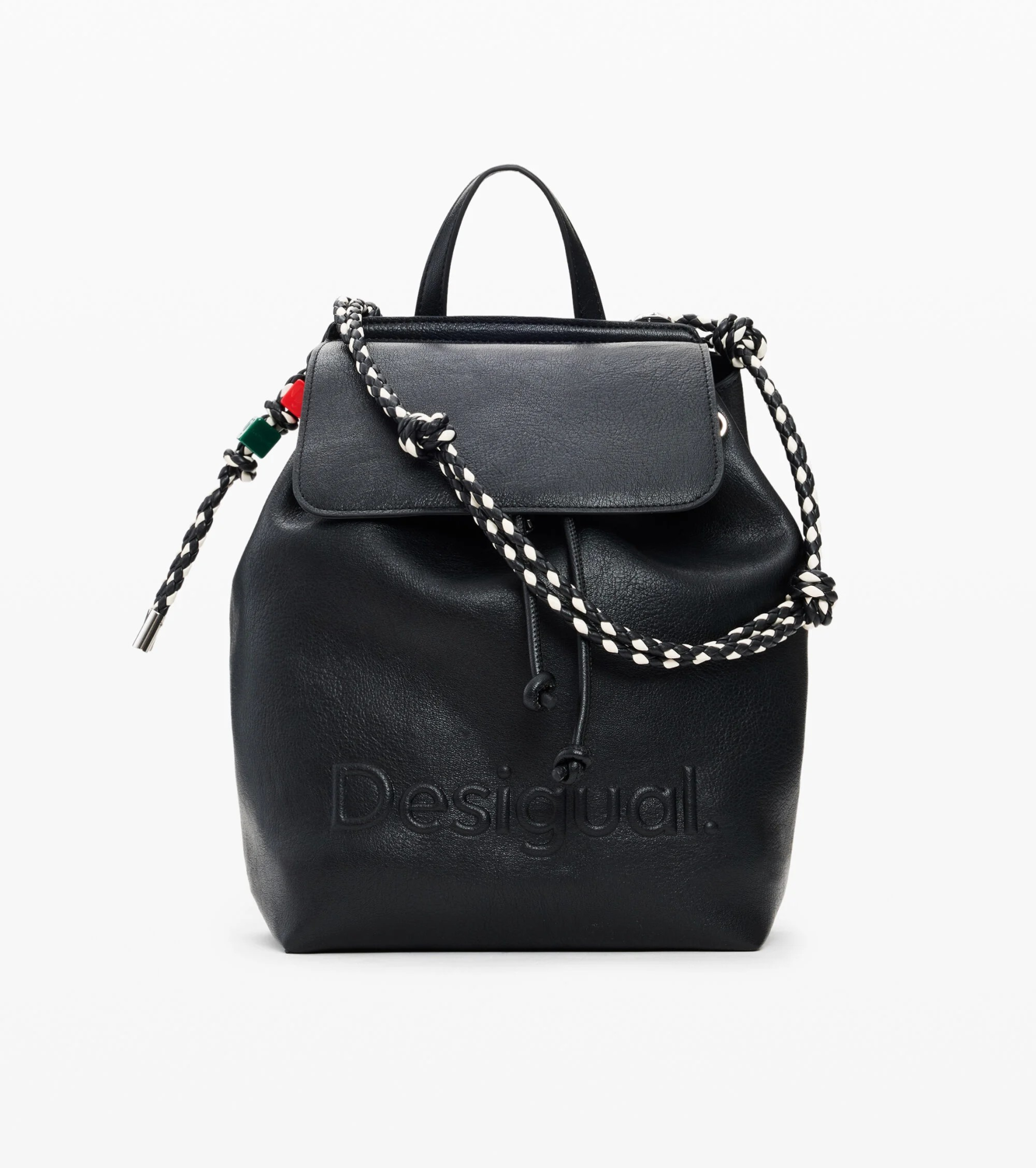Mochila média com alça conversível em bolsa, detalhes trançados, estampado vazado e bordas acabadas com cordão entrelaçado.