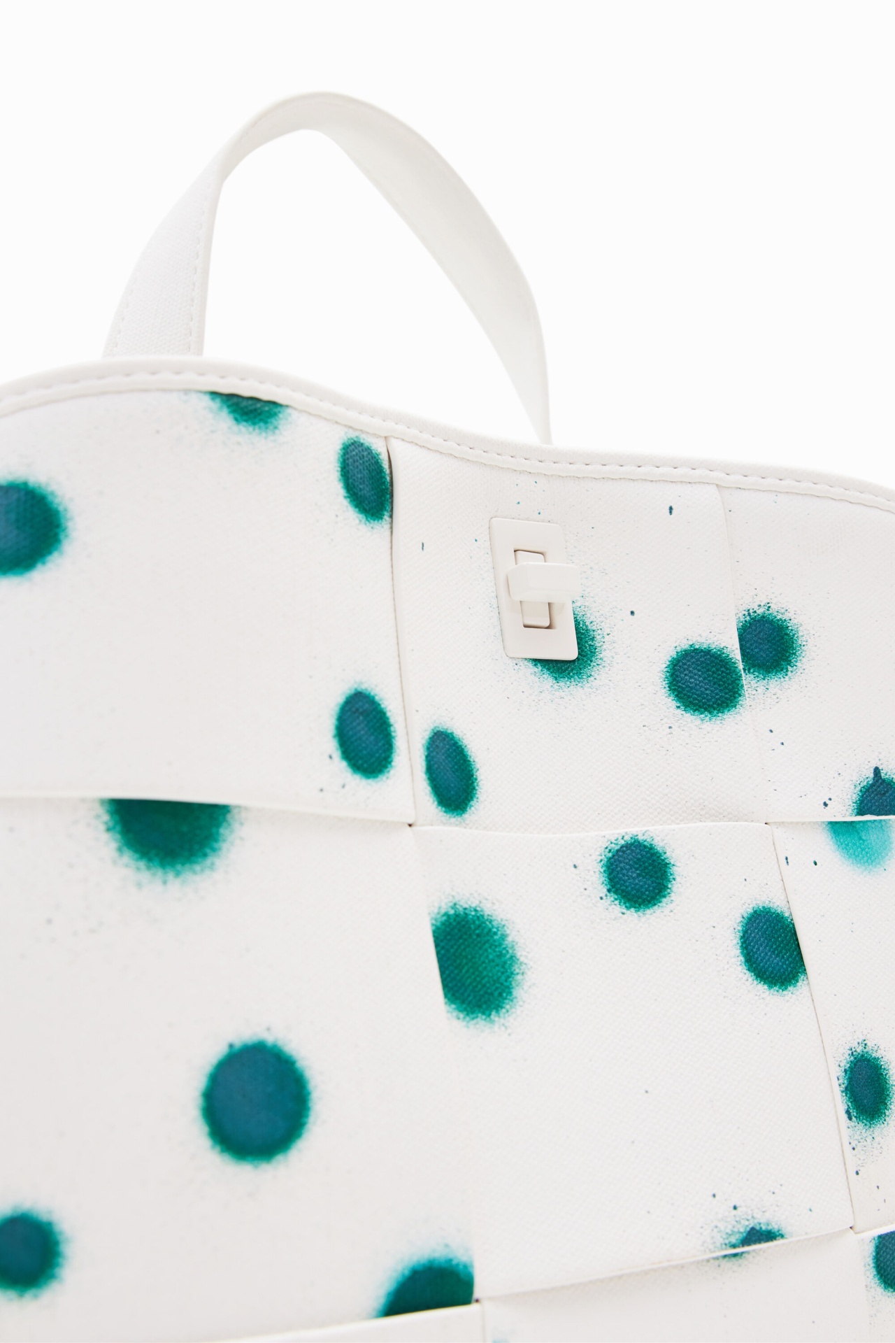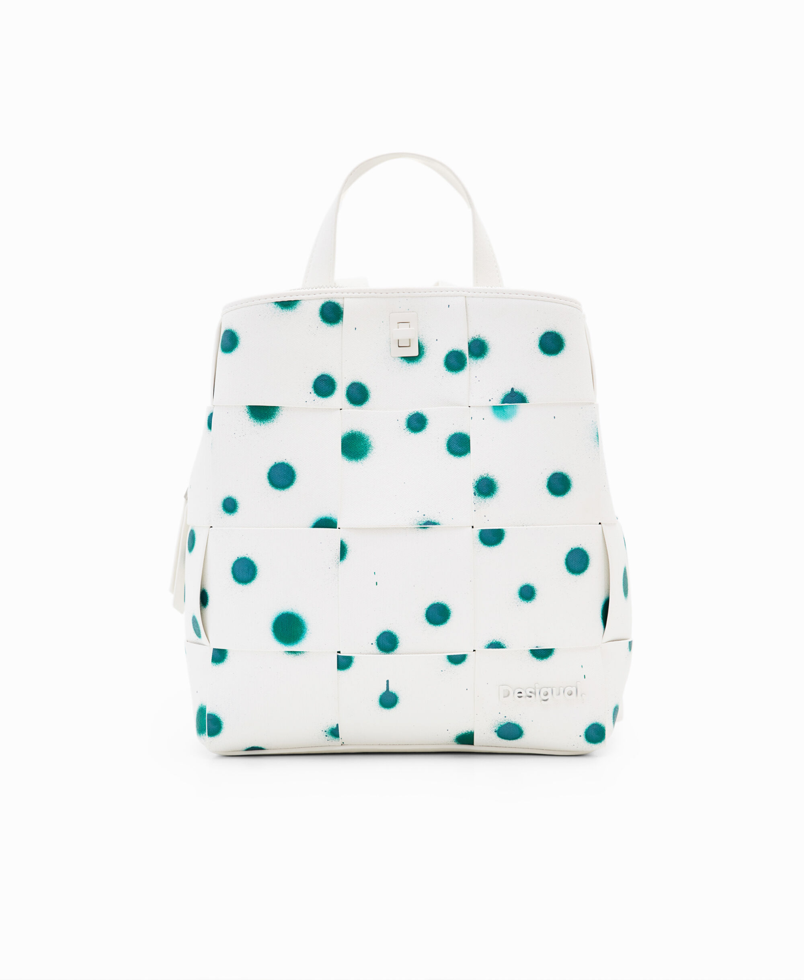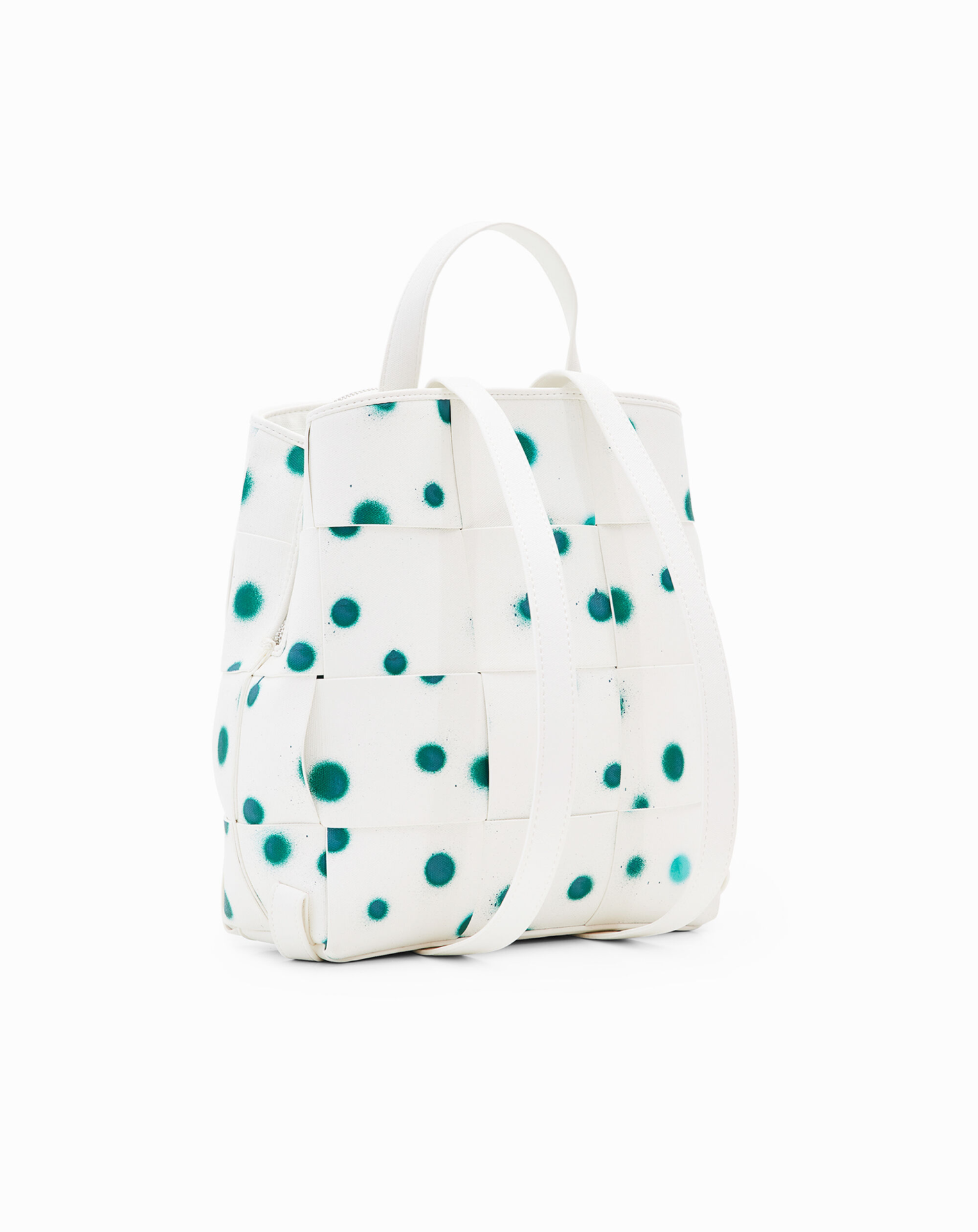 Mochila entrançada em tecido efeito pele com textura e estampado de gotas.