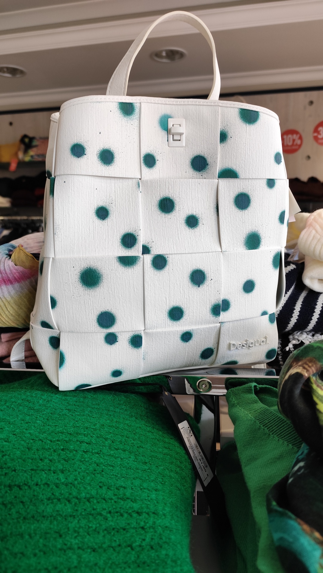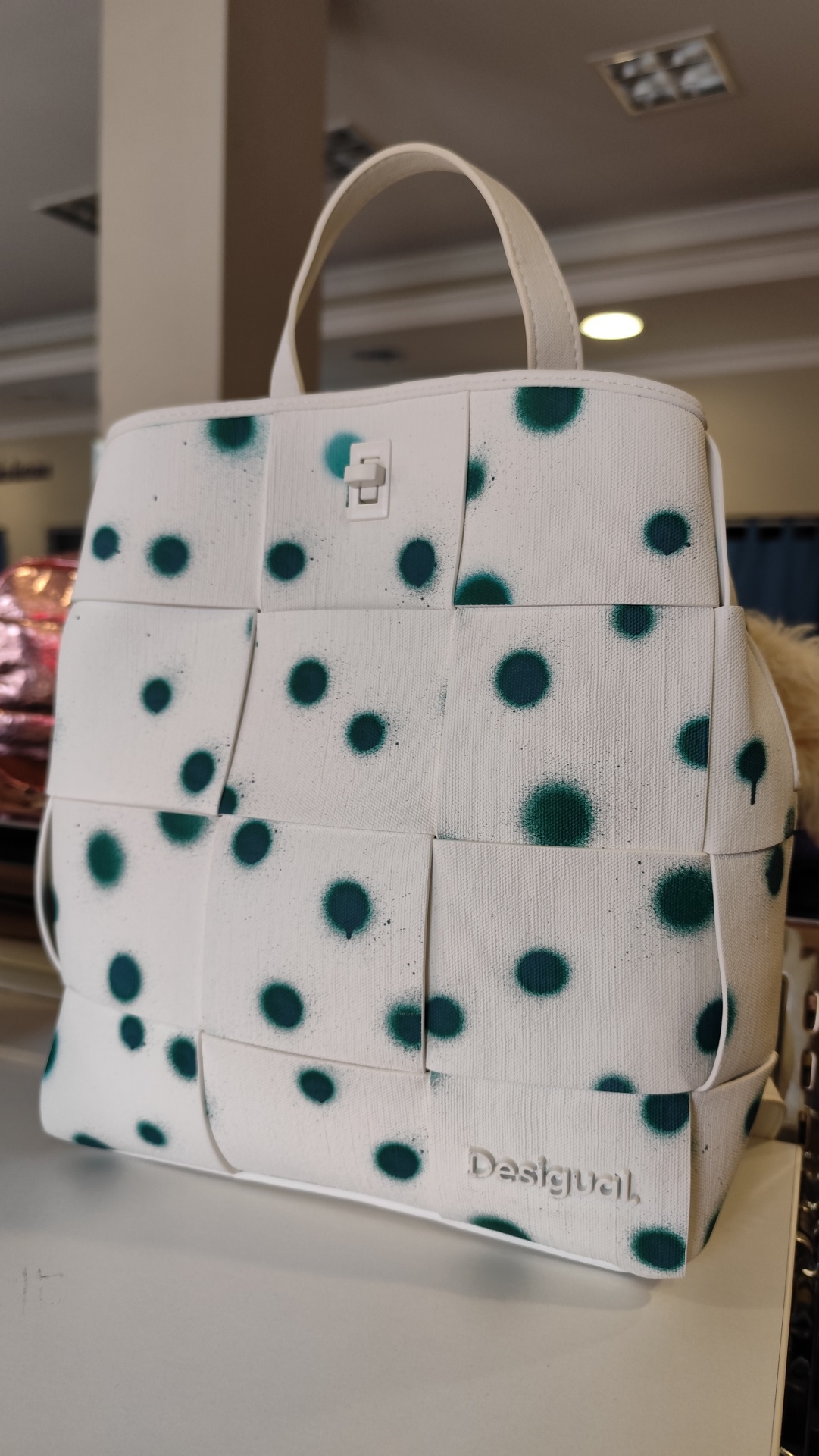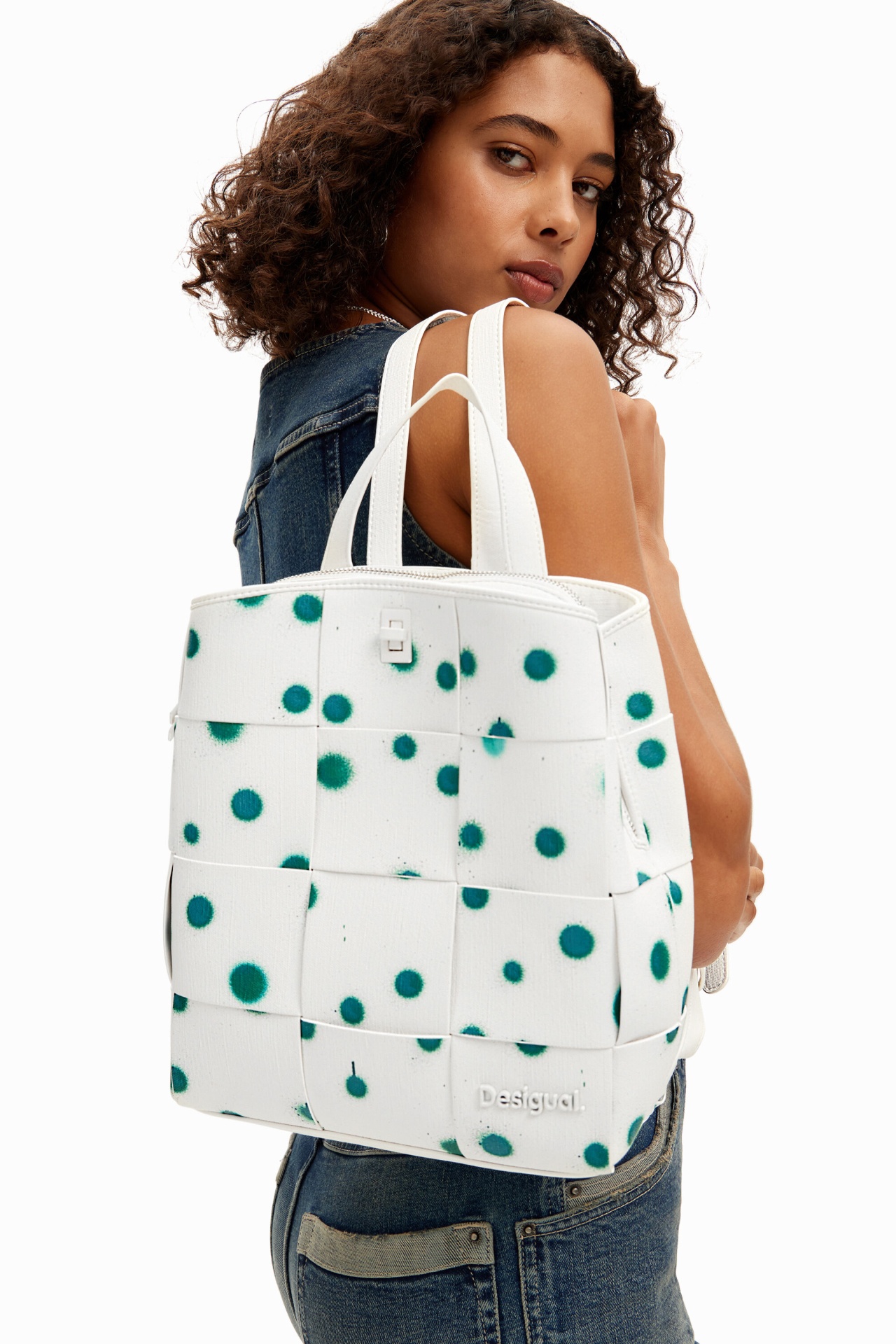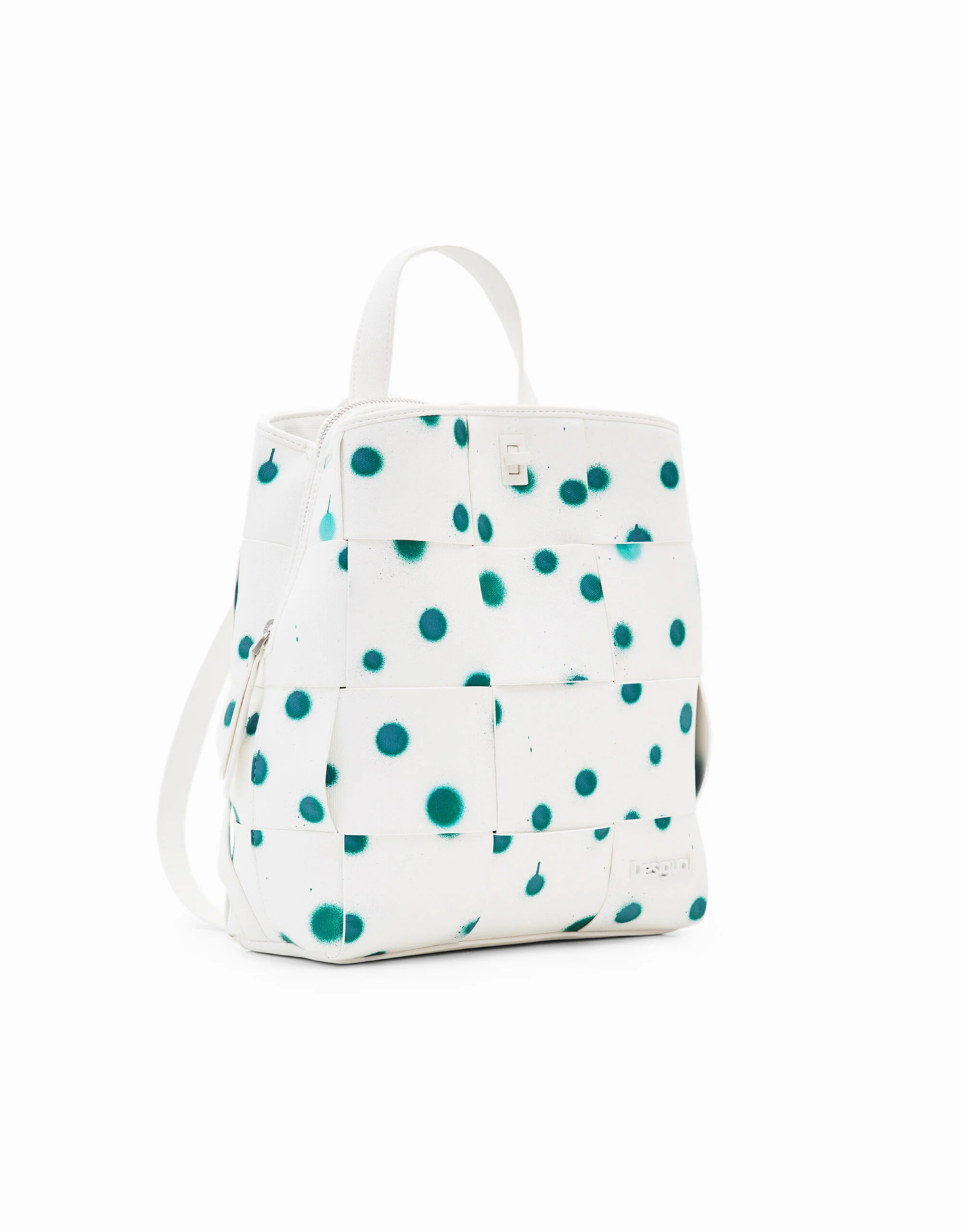 Mochila entrançada em tecido efeito pele com textura e estampado de gotas.