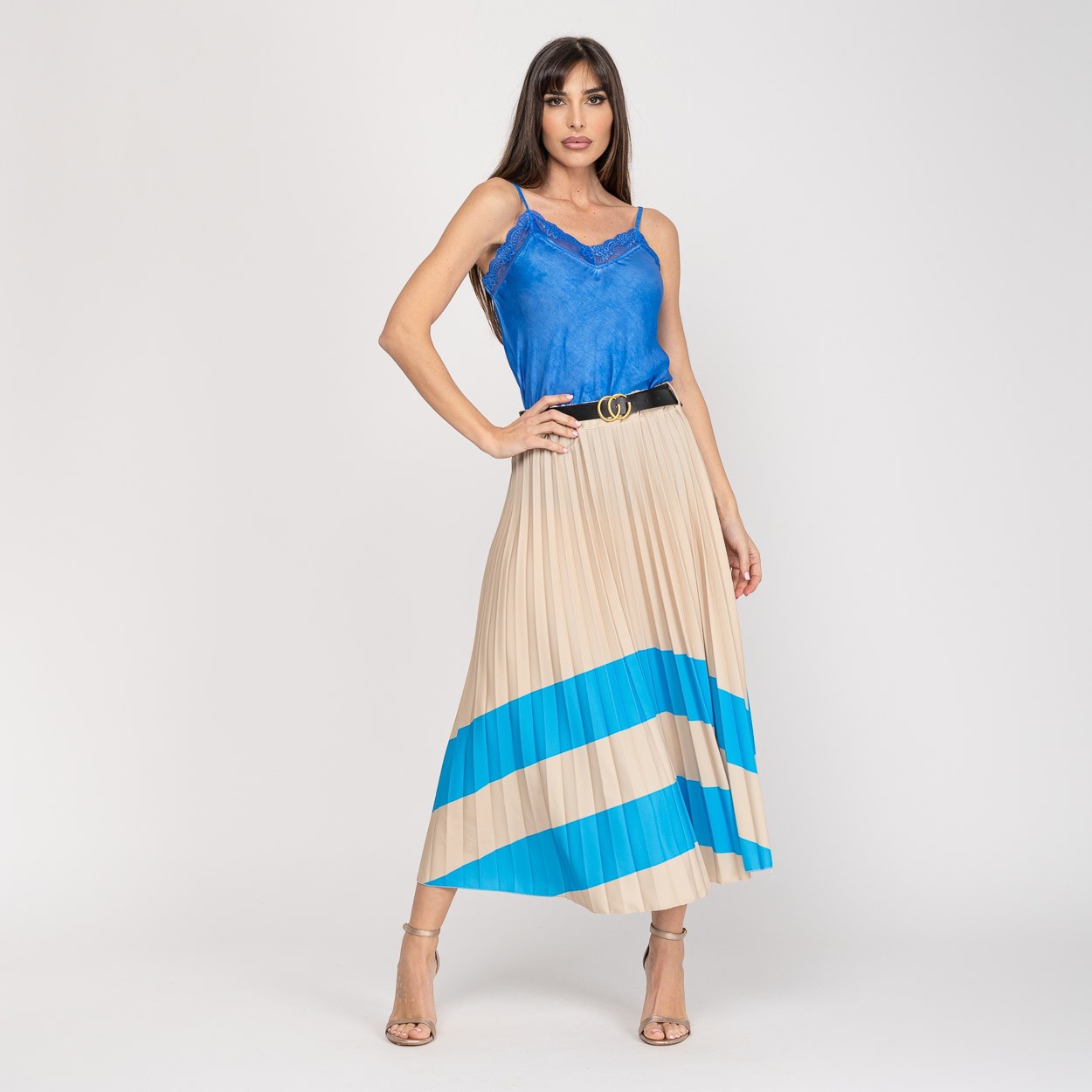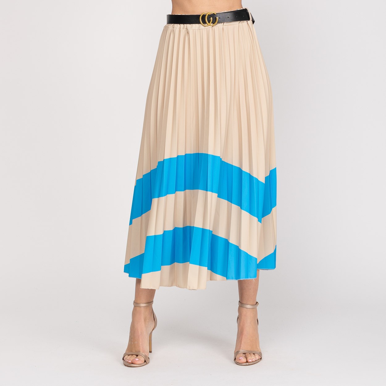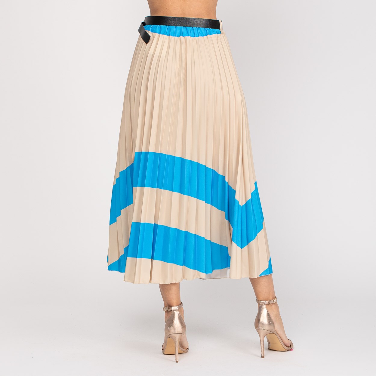 Saia comprida plissada com cinto incluido.