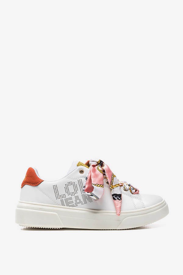 Sapatilha básica de pele sintética, em branco, com cordões de tecido.