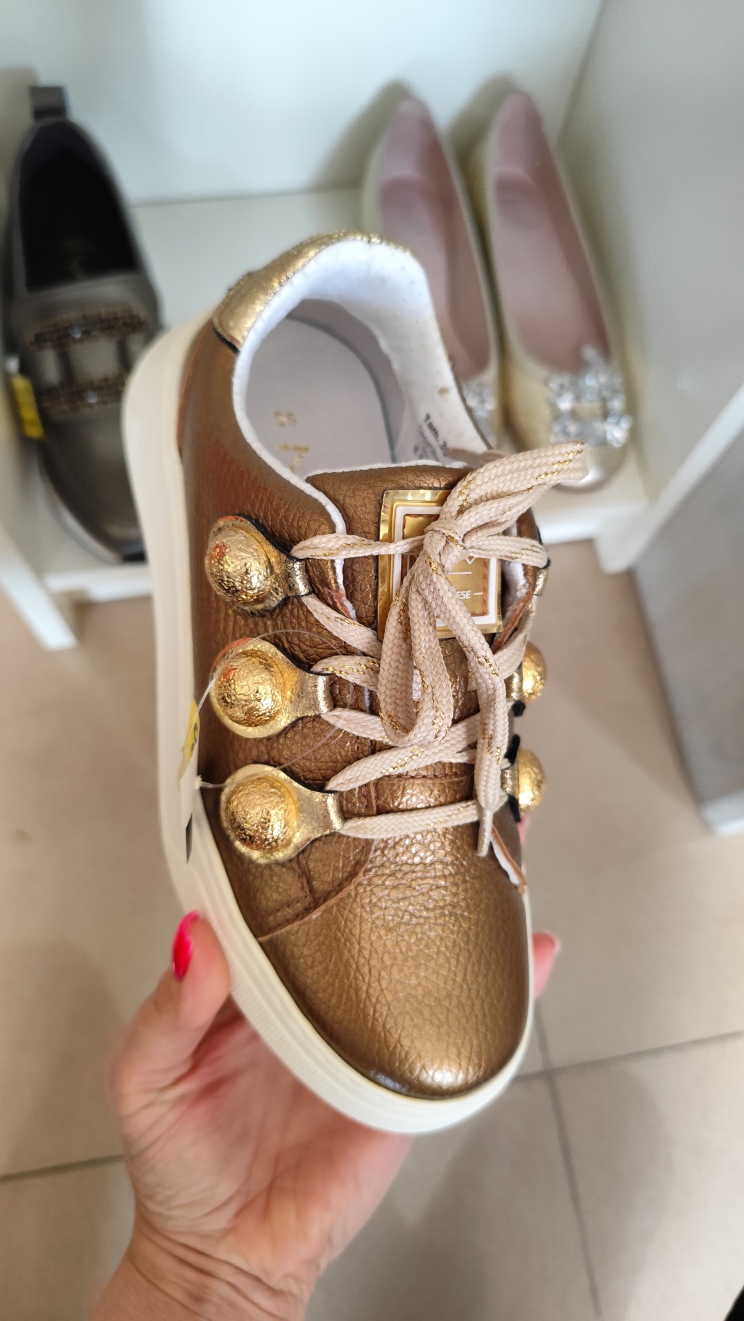 Sapatilhas em dourado, com detalhes de bolas nos atacadores.