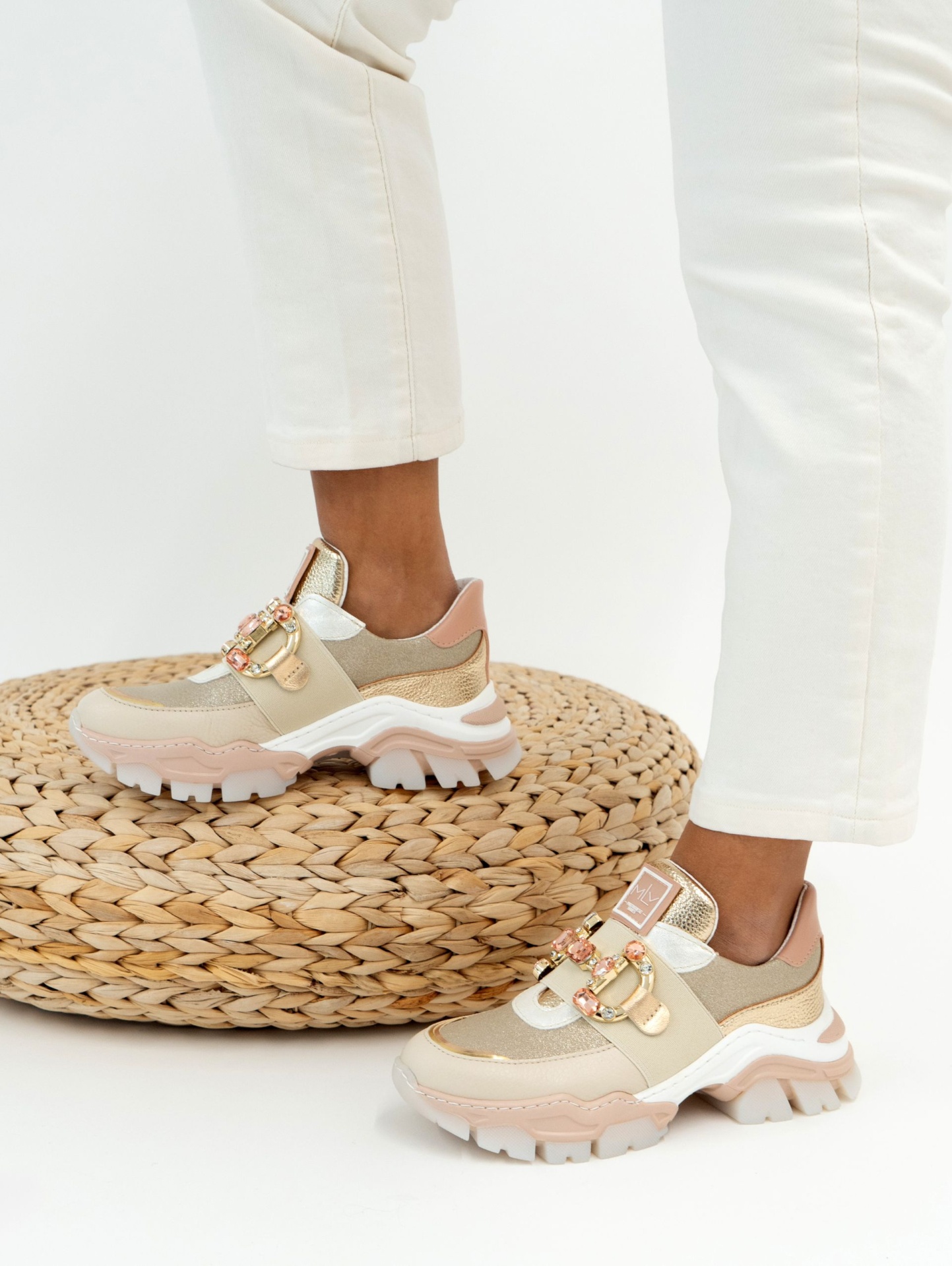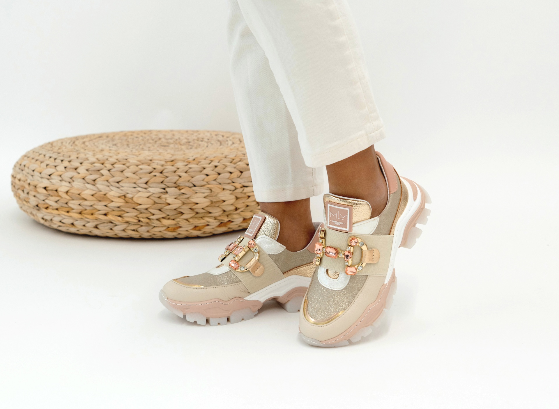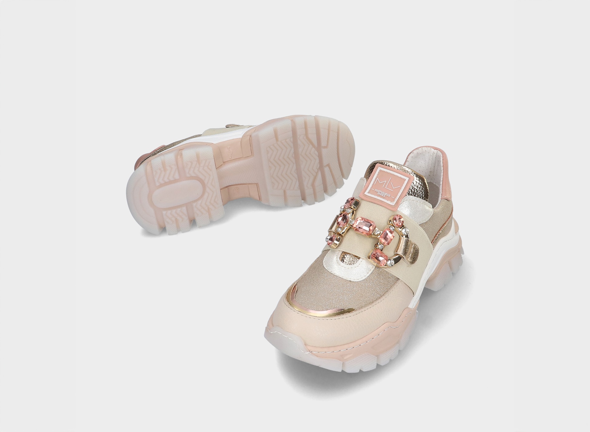 Sapatilhas em rosa clara, com sola grossa e antiderrapente.