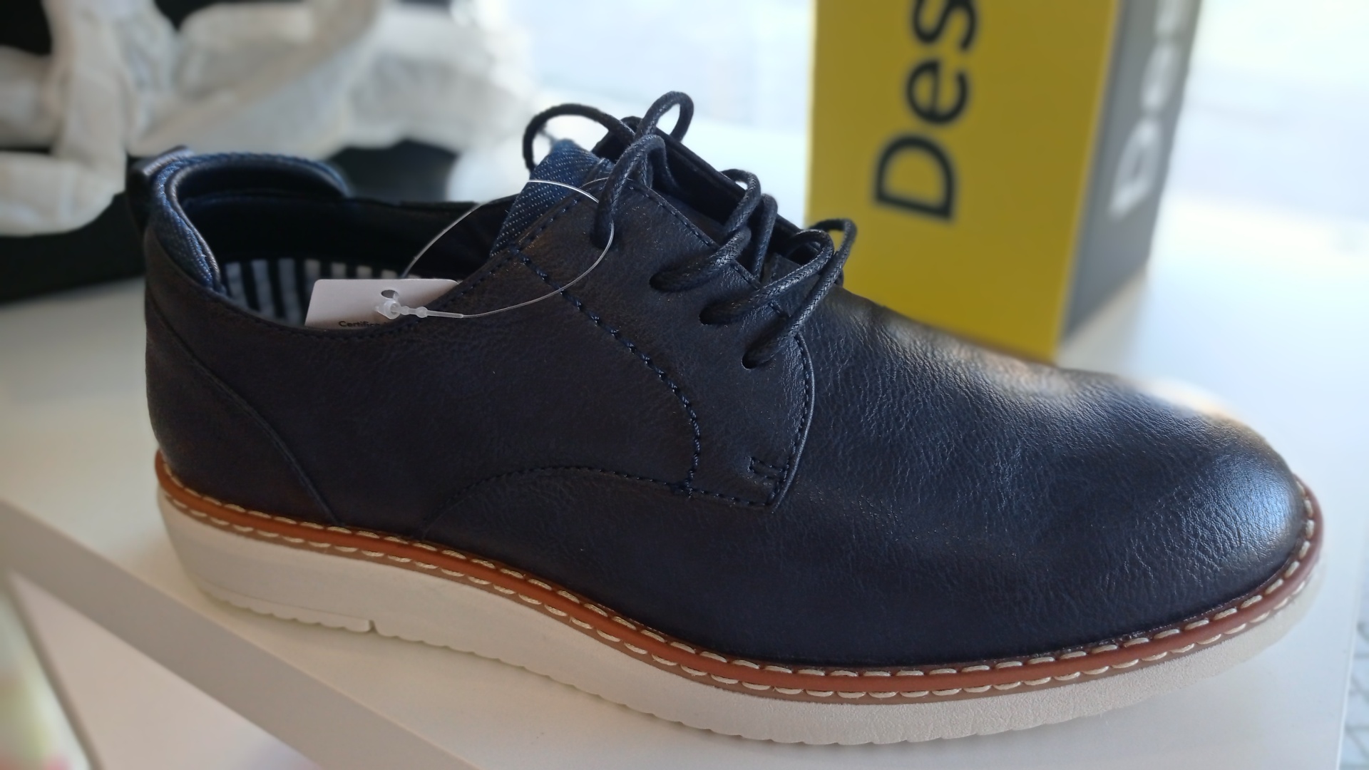 Sapato masculino preto com sola branca e detalhe castanho em fundo claro