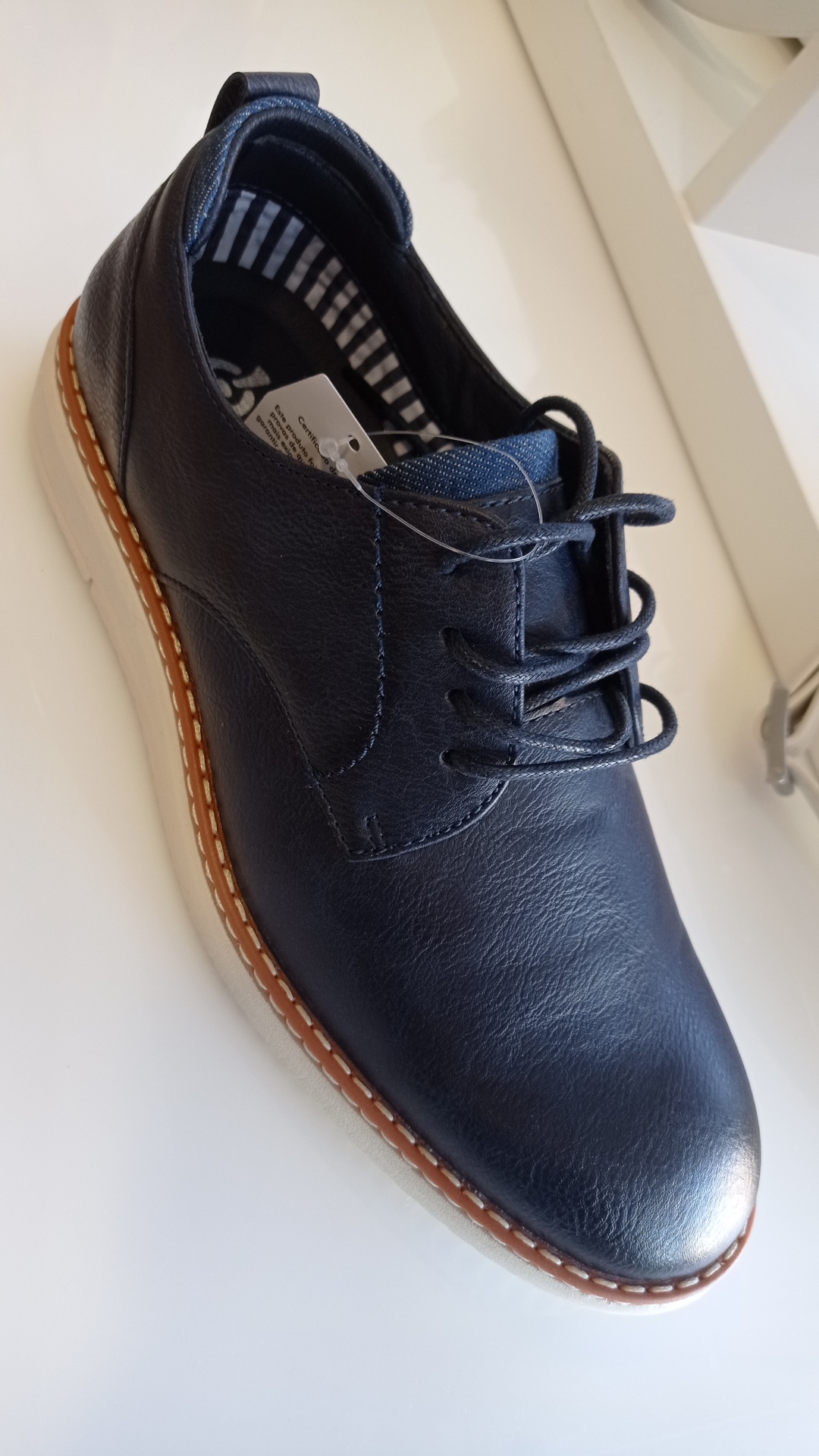 Sapato em pele sintética, com sola de borracha branca.
