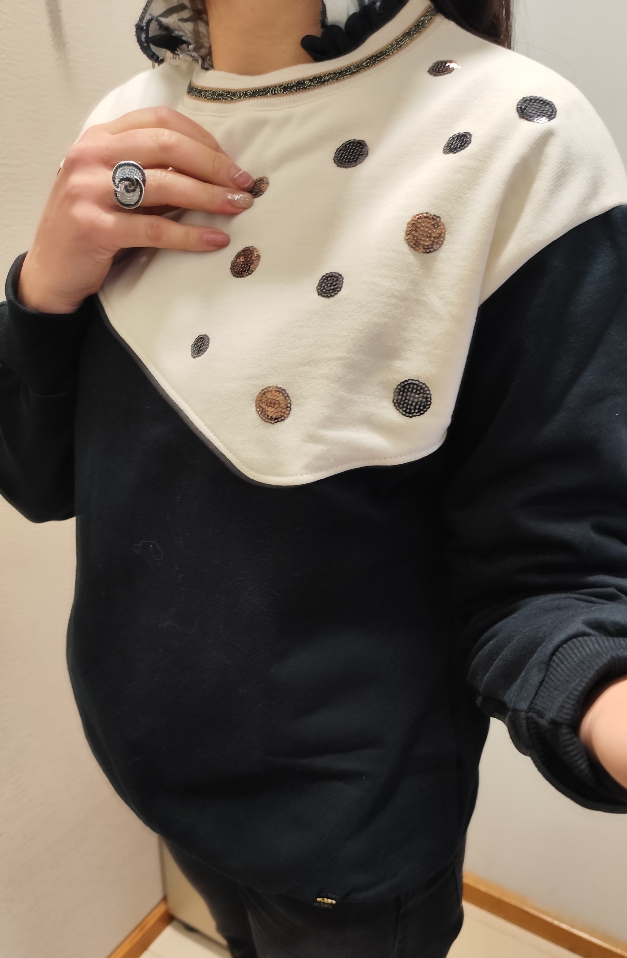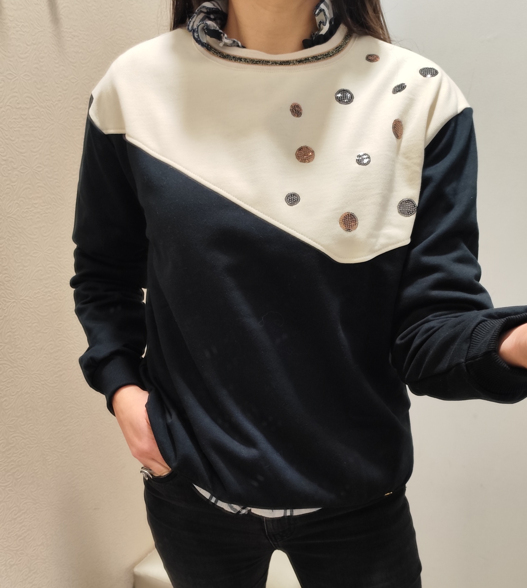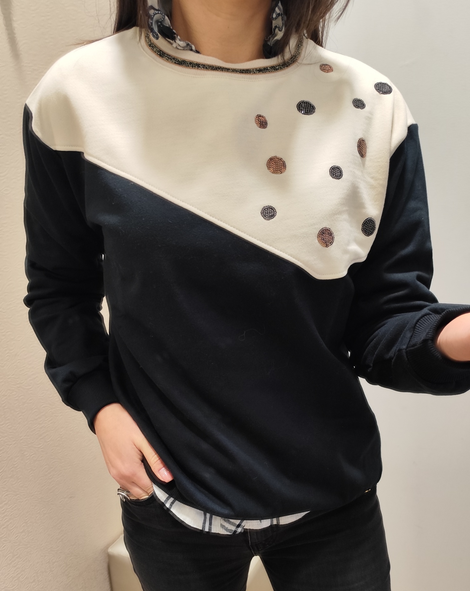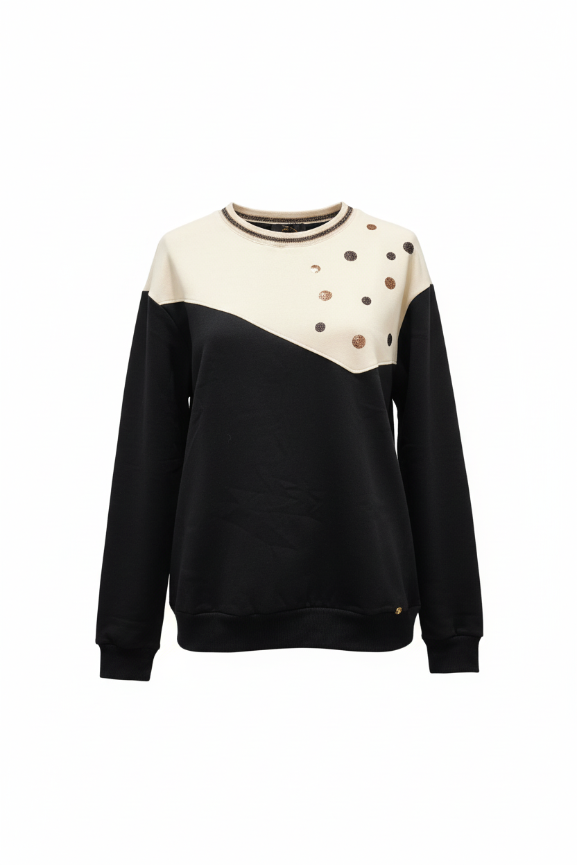 Sweater cardada, com parte a bege.