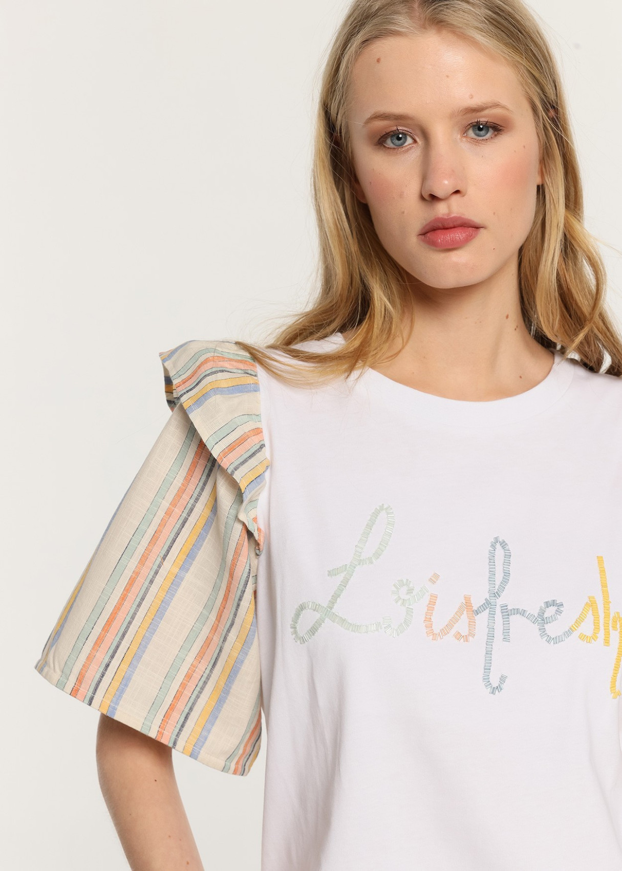 T-shirt de manga curta com detalhe de mangas, com babado e listas rústicas na cor bege.