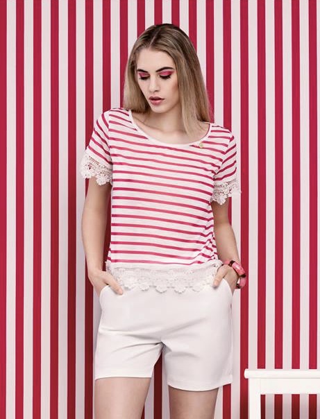 T-shirt de riscas, de manga curta c/ renda nas mangas e na cinta