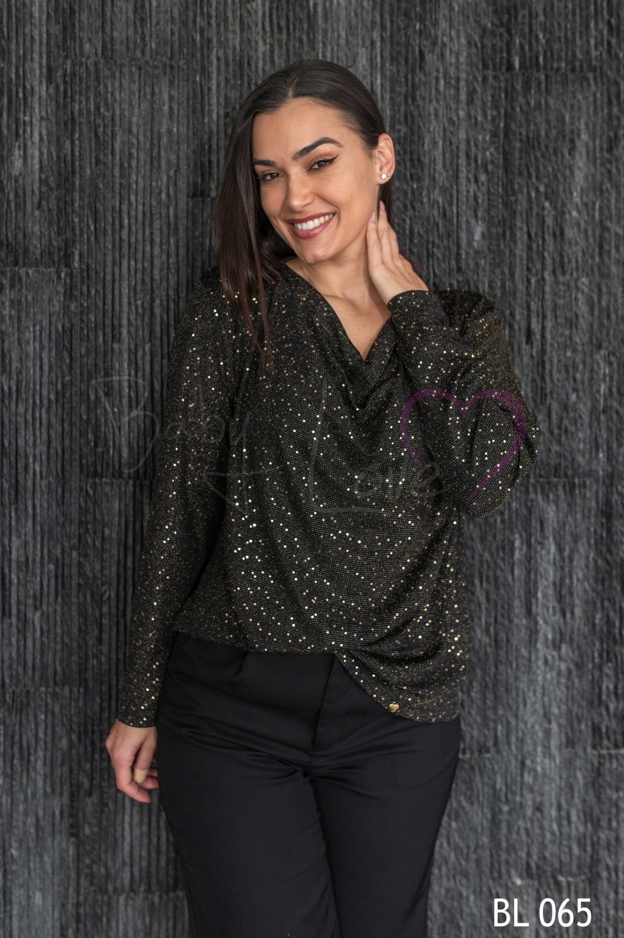 Blusa preta com pontos dourados e gola drapeada em fundo cinza