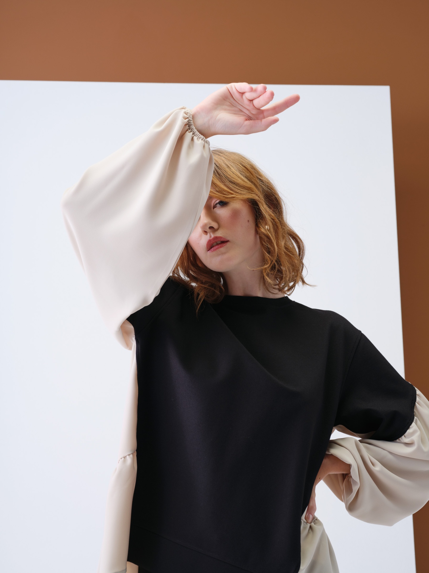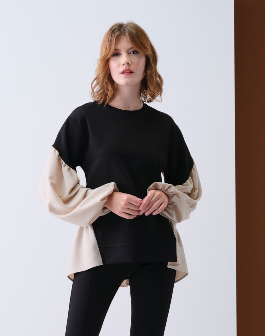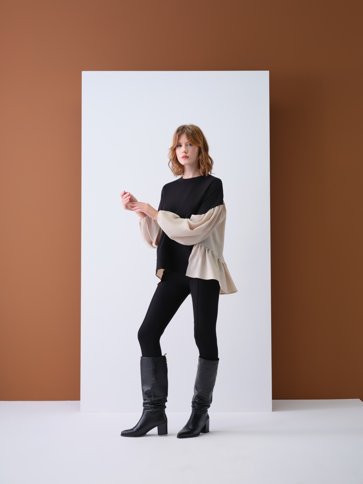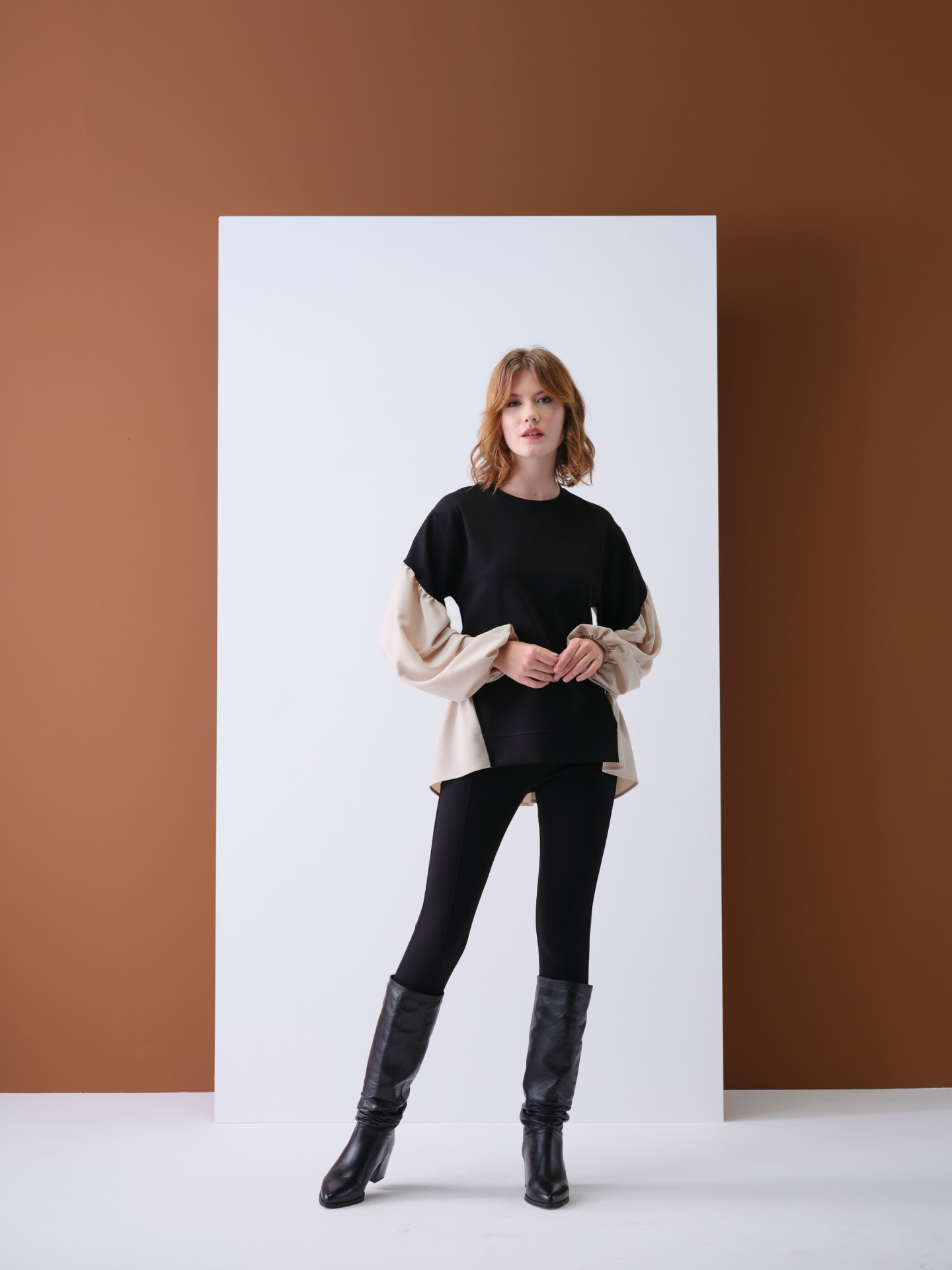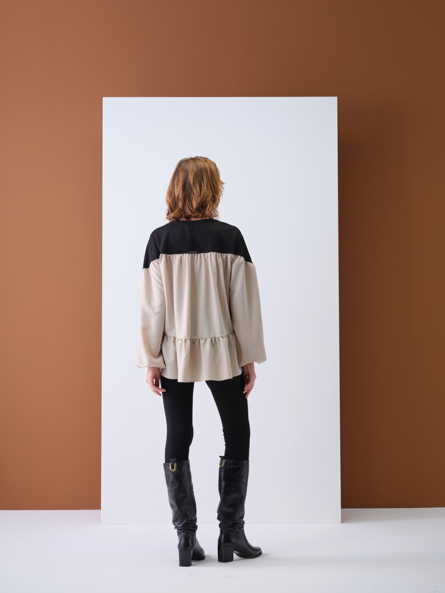 Túnica arrojada. Parte da frente em malha preta, e costas e mangas em tecido bege.