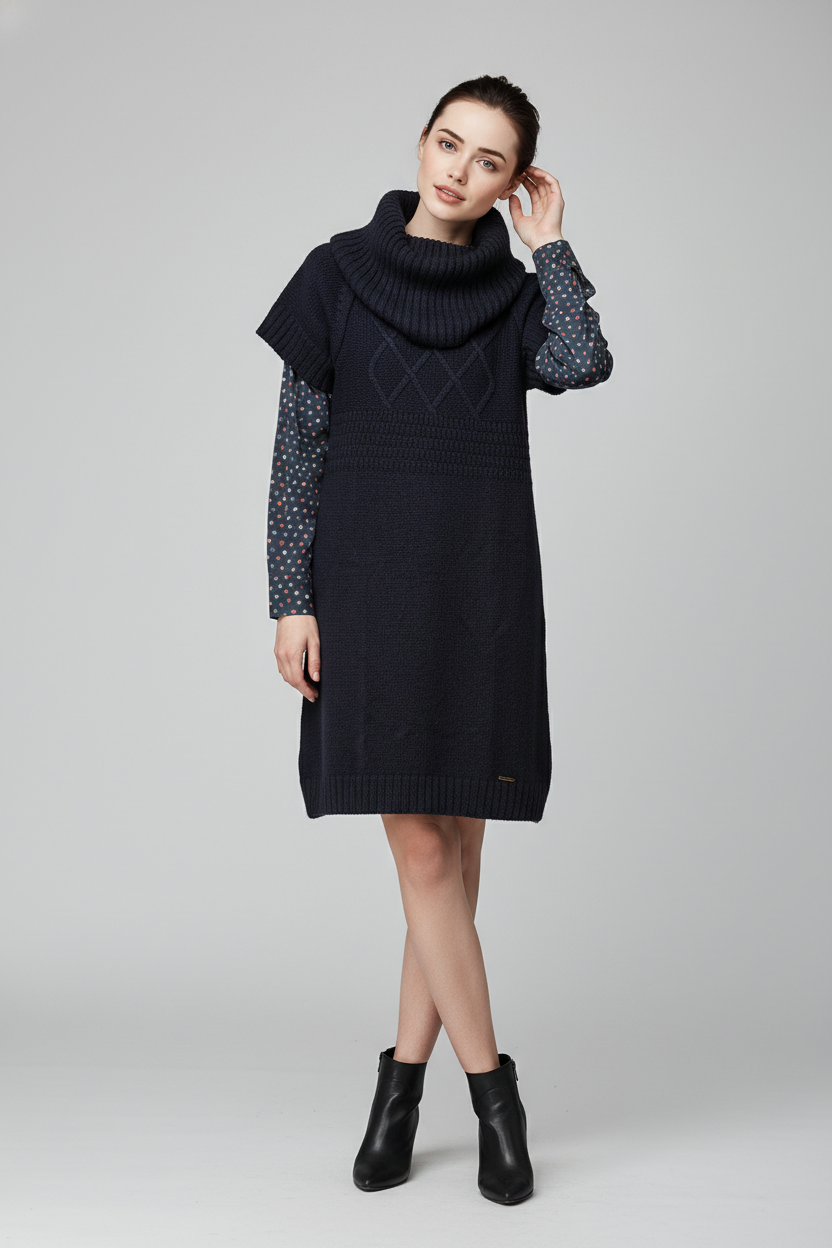Mulher com vestido de malha azul escuro, camisa com padrão de círculos e botas pretas