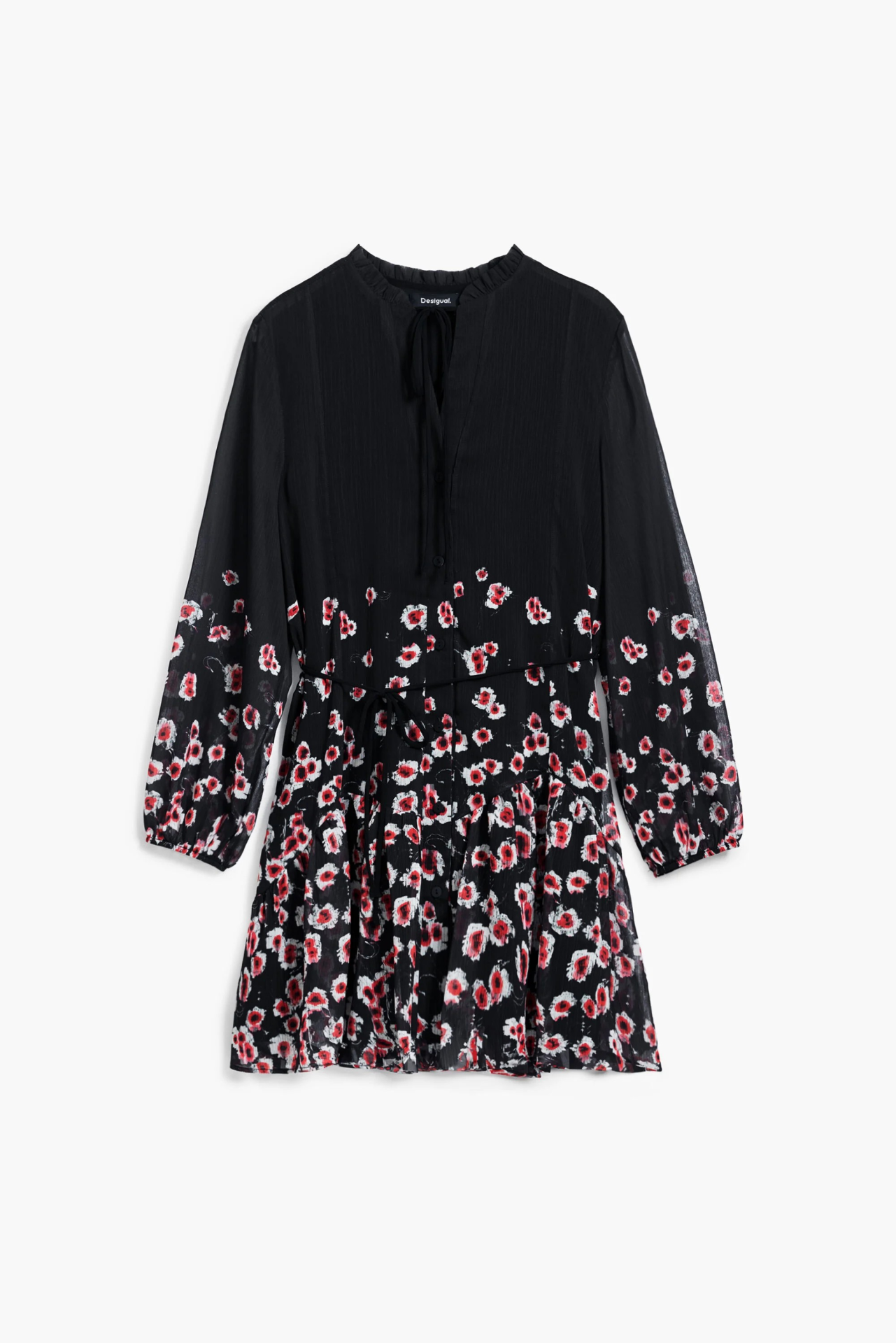 Vestido forrado, com folhinhos no decote.